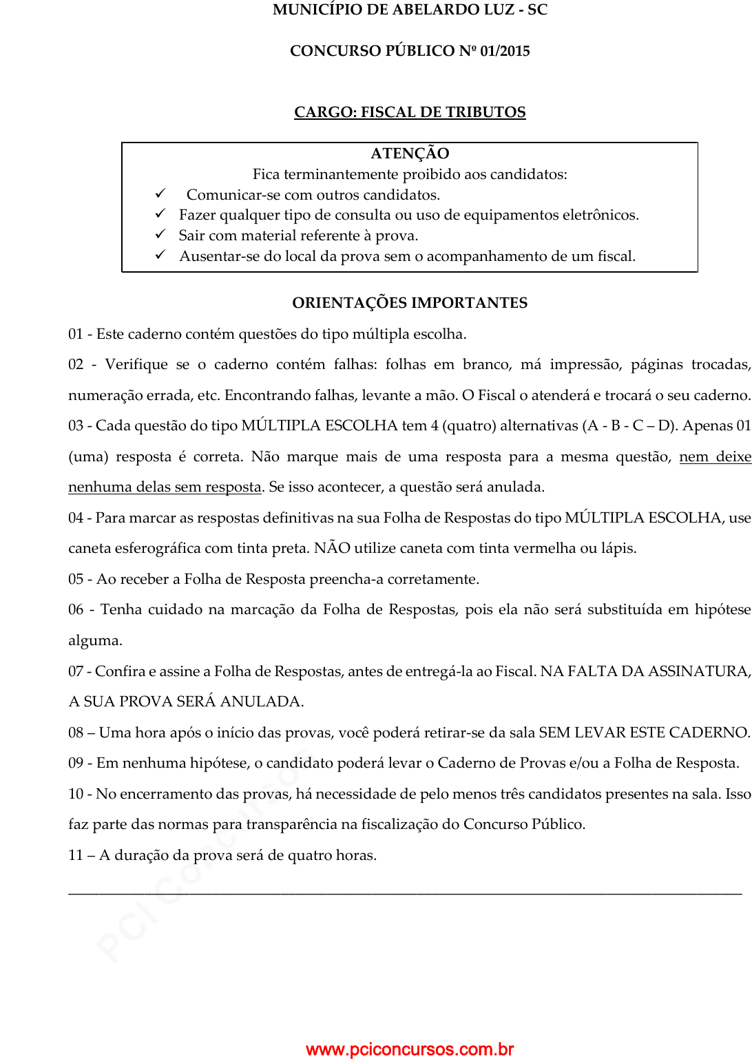pcimarkpci MDAwMDowMDAwOjAwMDA6MDAwMDowMDAwOmZmZmY6MzZlOTpjMjU5:VGh1LCAxNiBTZXAgMjAyMSAwNDo0NzozMyAtMDMwMA== MUNICÍPIO DE ABELARDO LUZ - SC CONCURSO PÚBLICO Nº 01/2015 CARGO: FISCAL DE TRIBUTOS ATENÇÃO Fica terminantemente proibido aos candidatos: Comunicar-se com outros candidatos. Fazer qualquer tipo de consulta ou uso de equipamentos eletrônicos. Sair com material referente à prova. Ausentar-se do local da prova sem o acompanhamento de um fiscal. ORIENTAÇÕES IMPORTANTES 01 - Este caderno contém questões do tipo múltipla escolha. 02 - Verifique se o caderno contém falhas: folhas em branco, má impressão, páginas trocadas, numeração errada, etc. Encontrando falhas, levante a mão. O Fiscal o atenderá e trocará o seu caderno. 03 - Cada questão do tipo MÚLTIPLA ESCOLHA tem 4 (quatro) alternativas (A - B - C – D). Apenas 01 (uma) resposta é correta. Não marque mais de uma resposta para a mesma questão, nem deixe nenhuma delas sem resposta. Se isso acontecer, a questão será anulada. 04 - Para marcar as respostas definitivas na sua Folha de Respostas do tipo MÚLTIPLA ESCOLHA, use caneta esferográfica com tinta preta. NÃO utilize caneta com tinta vermelha ou lápis. 05 - Ao receber a Folha de Resposta preencha-a corretamente. 06 - Tenha cuidado na marcação da Folha de Respostas, pois ela não será substituída em hipótese alguma. 07 - Confira e assine a Folha de Respostas, antes de entregá-la ao Fiscal. NA FALTA DA ASSINATURA, A SUA PROVA SERÁ ANULADA. 08 – Uma hora após o início das provas, você poderá retirar-se da sala SEM LEVAR ESTE CADERNO. 09 - Em nenhuma hipótese, o candidato poderá levar o Caderno de Provas e/ou a Folha de Resposta. 10 - No encerramento das provas, há necessidade de pelo menos três candidatos presentes na sala. Isso faz parte das normas para transparência na fiscalização do Concurso Público. 11 – A duração da prova será de quatro horas. _________________________________________________________________________________________ www.pciconcursos.com.br pcimarkpci MDAwMDowMDAwOjAwMDA6MDAwMDowMDAwOmZmZmY6MzZlOTpjMjU5:VGh1LCAxNiBTZXAgMjAyMSAwNDo0NzozMyAtMDMwMA== O QUE É ZIKA VÍRUS? Zika Vírus é uma infecção causada pelo vírus ZIKV, transmitida pelo mosquito Aedes aegypti, mesmo transmissor da dengue e da febre chikungunya. O vírus Zika teve sua primeira aparição registrada em 1947, quando foi encontrado em macacos da Floresta Zika, em Uganda. Entretanto, somente em 1954 os primeiros seres humanos foram contaminados, na Nigéria. O vírus Zika atingiu a Oceania em 2007 e a França no ano de 2013. O Brasil notificou os primeiros casos de Zika vírus em 2015, no Rio Grande do Norte e na Bahia. Causas O contágio do vírus ZIKV se dá pelo mosquito que, após picar alguém contaminado, pode transportar o ZIKV durante toda a sua vida, transmitindo a doença para uma população que não possui anticorpos contra ele. O ciclo de transmissão ocorre do seguinte modo: a fêmea do mosquito deposita seus ovos em recipientes com água. Ao saírem dos ovos, as larvas vivem na água por cerca de uma semana. Após este período, transformam-se em mosquitos adultos, prontos para picar as pessoas. O Aedes aegypti procria em velocidade prodigiosa e o mosquito adulto vive em média 45 dias. Uma vez que o indivíduo é picado, demora no geral de 3 a 12 dias para o Zika vírus causar sintomas. A transmissão do ZIKV raramente ocorre em temperaturas abaixo de 16° C, sendo que a mais propícia gira em torno de 30° a 32° C - por isso ele se desenvolve em áreas tropicais e subtropicais. A fêmea coloca os ovos em condições adequadas (lugar quente e úmido) e em 48 horas o embrião se desenvolve. É importante lembrar que os ovos que carregam o embrião do mosquito transmissor da Zika Vírus podem suportar até um ano a seca e serem transportados por longas distâncias, grudados nas bordas dos recipientes e esperando um ambiente úmido para se desenvolverem. Essa é uma das razões para a difícil erradicação do mosquito. Para passar da fase do ovo até a fase adulta, o inseto demora dez dias, em média. Os mosquitos acasalam no primeiro ou no segundo dia após se tornarem adultos. Depois, as fêmeas passam a se alimentar de sangue, que possui as proteínas necessárias para o desenvolvimento dos ovos. http://www.minhavida.com.br/saude/temas/zik a-virus 1. A palavra destacada na frase: “ENTRETANTO, somente em 1954 os primeiros seres humanos foram contaminados, na Nigéria.” Pode ser substituída por qual palavra abaixo: A) No entanto B) Nem C) Por que D) Logo 2. A frase: “O Aedes aegypti procria em velocidade prodigiosa e o mosquito adulto vive em média 45 dias.” Apresenta uma: A) Conjunção coordenativa alternativa B) Conjunção coordenativa adversativa C) Conjunção subordinativa causal D) Conjunção coordenativa aditiva 3. Os dois pontos aparecem em: “O ciclo de transmissão ocorre do seguinte modo: a fêmea do mosquito deposita seus ovos em recipientes com água.” Os dois pontos devem ser usado em EXCETO: A) Para anunciar a fala de uma personagem. B) Para anunciar uma enumeração. C) Para anunciar um esclarecimento ou explicação. D) Jamais deve ser usada para anunciar uma citação. 4. “A fêmea coloca os ovos em condições adequadas (lugar quente e úmido) e em 48 horas o embrião se desenvolve.” As palavras entre parênteses nessa oração são: A) Uma conclusão B) Uma explicação C) Um comentário D) Um pensamento indutivo www.pciconcursos.com.br pcimarkpci MDAwMDowMDAwOjAwMDA6MDAwMDowMDAwOmZmZmY6MzZlOTpjMjU5:VGh1LCAxNiBTZXAgMjAyMSAwNDo0NzozMyAtMDMwMA== 5. As palavras FÊMEA E ÚMIDO, são acentuadas, respectivamente, por serem palavras: A) oxítona e proparoxítona D) Proparoxítona e paroxítona terminada em O C) Paroxítona determinada em ditongo crescente e proparoxítona D) Paroxítona terminada em ditongo decrescente e proparoxítona 6. Na frase “Os mosquitos invadiram as cidades.” en