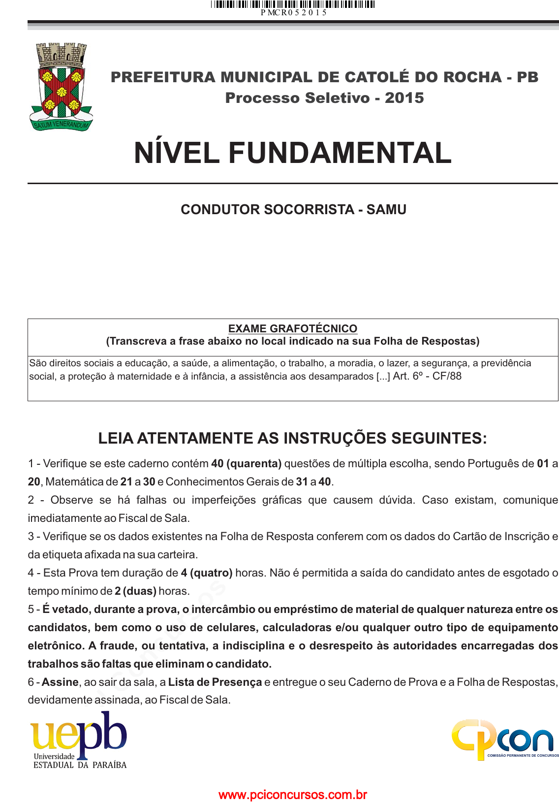 pcimarkpci MDAwMDowMDAwOjAwMDA6MDAwMDowMDAwOmZmZmY6MzZlOTpjMjU5:VGh1LCAxNiBTZXAgMjAyMSAxMzowNjo0NSAtMDMwMA== PREFEITURA MUNICIPAL DE CATOLÉ DO ROCHA - PB Processo Seletivo - 2015 P MC R0 5 2 0 1 5 CONDUTOR SOCORRISTA - SAMU 1 - Verifique se este caderno contém questões de múltipla escolha, sendo Português de a40 (quarenta) 01 20 21 30 31 40, Matemática de a e Conhecimentos Gerais de a . 2 - Observe se há falhas ou imperfeições gráficas que causem dúvida. Caso existam, comunique imediatamente ao Fiscal de Sala. 3 - Verifique se os dados existentes na Folha de Resposta conferem com os dados do Cartão de Inscrição e da etiqueta afixada na sua carteira. 4 - Esta Prova tem duração de horas. Não é permitida a saída do candidato antes de esgotado o4 (quatro) tempo mínimo de horas.2 (duas) 5 - É vetado, durante a prova, o intercâmbio ou empréstimo de material de qualquer natureza entre os candidatos, bem como o uso de celulares, calculadoras e/ou qualquer outro tipo de equipamento eletrônico. A fraude, ou tentativa, a indisciplina e o desrespeito às autoridades encarregadas dos trabalhos são faltas que eliminam o candidato. 6 - , ao sair da sala, a e entregue o seu Caderno de Prova e a Folha de Respostas,Assine Lista de Presença devidamente assinada, ao Fiscal de Sala. LEIA ATENTAMENTE AS INSTRUÇÕES SEGUINTES: NÍVEL FUNDAMENTAL EXAME GRAFOTÉCNICO (Transcreva a frase abaixo no local indicado na sua Folha de Respostas) São direitos sociais a educação, a saúde, a alimentação, o trabalho, a moradia, o lazer, a segurança, a previdência social, a proteção à maternidade e à infância, a assistência aos desamparados [...] Art. 6º - CF/88 COMISSÃO PERMANENTE DE CONCURSOS www.pciconcursos.com.br pcimarkpci MDAwMDowMDAwOjAwMDA6MDAwMDowMDAwOmZmZmY6MzZlOTpjMjU5:VGh1LCAxNiBTZXAgMjAyMSAxMzowNjo0NSAtMDMwMA== PORTUGUÊS PÁGINA 02 Texto I Médico só pode piscar os olhos e, ainda assim, dá aulas na UFJF (Universidade Federal de Juiz de fora). O médico e professor Vanderlei Corradini Lima, 53 anos, é portador da , com sintomasEsclerose Lateral Amiotrófica (ELA) diagnosticados em 2010. Mesmo tendo que conviver com as extremas limitações físicas impostas pela enfermidade, ele reencontrou a felicidade de continuar na profissão ao ser convidado para ministrar aulas na UFJF (Universidade Federal de Juiz de Fora), localizada na cidade de Juiz de Fora a 278 km de Belo Horizonte. Nos últimos meses, pessoas famosas passaram a encarar o como maneira de atrair atenção para a"desafio do balde de gelo" enfermidade. Há também o mote de o desafiado fazer uma doação em dinheiro a uma instituição que trata pacientes com a ELA. "Adoença me tirou muita coisa, não falo, não ando, não como, não saio de cima de uma cama, mas não tirou minha capacidade de servir e enfim ser feliz", descreveu Lima ao UOL em entrevista concedida por e-mail. Ele afirmou ter conseguido trabalhar até julho de 2011. Atualmente, ele vive com a mulher e dois filhos na cidade de São Sebastião do Paraíso, cidade no sul de Minas Gerais e distante 400 km da capital mineira. Há três semestres, o profissional atua como professor convidado, no curso de medicina da universidade, e no qual interage a distância com alunos do 2º período na disciplina Fisiologia Médica, que aborda tópicos de neurofisiologia. Ele dispõe de computador munido de um programa e um leitor infravermelho que captam os movimentos dos globos oculares, que não foram afetados pela doença. Por meio de um mouse e um teclado virtual ele consegue interagir com a máquina e utilizá-la normalmente. "Há uma página específica no site da universidade com uma plataforma virtual de ensino a distância. Cada semana um novo caso clínico é discutido entre professores, monitores e alunos", disse referindo-se à plataforma utilizada para ensino a distância (Moodle). Segundo ele, o retorno dado pelos alunos foi considerado positivo. "Meu intuito sempre foi de agregar à disciplina uma visão prática e humanista, gerando um ensino mais próximo da realidade que irão enfrentar. O retorno positivo foi confirmado pela participação dos alunos. Especificamente em relação ao caso clínico da ELA podemos aproveitar ao máximo, já que eles tinham a visão de um paciente e um médico na discussão", disse. (...) Recentemente, ele escreveu um livro, no qual aborda a doença, e se prepara para a confecção de outro. "Na verdade, o que deu origem ao livro EU E ELAS, foram as várias conversas pelas redes sociais, onde percebi que esperavam de mim um médico de almas. Assim pude servir e ser útil, minha verdadeira vocação, escrevendo crônicas", avaliou. O título faz referência a sua experiência com a medicina, a música e a doença. O próximo livro, segundo ele, terá o título de "O Médico de Pijamas e suas Estórias". Disponível em:> http://educacao.uol.com.br/noticias/2014/09/11/medico-com-doenca-do-desafio-balde-de-gelo-ele-so-pode-piscar-os-olhos-e-ainda-assim-da-aulas-na- fjf.htm11/09/201408h00 >Atualizada 11/09/201415h22.<. Data da consulta: 11/09/2011. (Com adaptações). 1ª QUESTÃO As melhores palavras, de acordo com o texto, que podem definir a atitude do médico são: a) Felicidade, desejo de servir e desamor. b) Superação, apoio, desgraça na vida e preconceito. c) Preconceito, superação e desamor. d) Superação, amor e ódio. e) Superação, competência, autoestima e felicidade. 2ª QUESTÃO Sobre a vida do médico pode-se afirmar que ele: a) É solteiro, tem três filhos, trabalha em Juiz de fora (MG) e mora sozinho na cidade de São Sebastião do Paraíso (MG). b) É solteiro, nunca pôde ter filhos, trabalha em Juiz de fora (MG) e mora com a família na cidade de São Sebastião do Paraíso (MG). c) Vive com a mulher e dois filhos, trabalha em Juiz de fora (MG) e mora na cidade de São Sebastião do Paraíso (MG). d) É casado, nunca pôde ter filhos, trabalha em Juiz de fora (MG) e mora com a esposa 