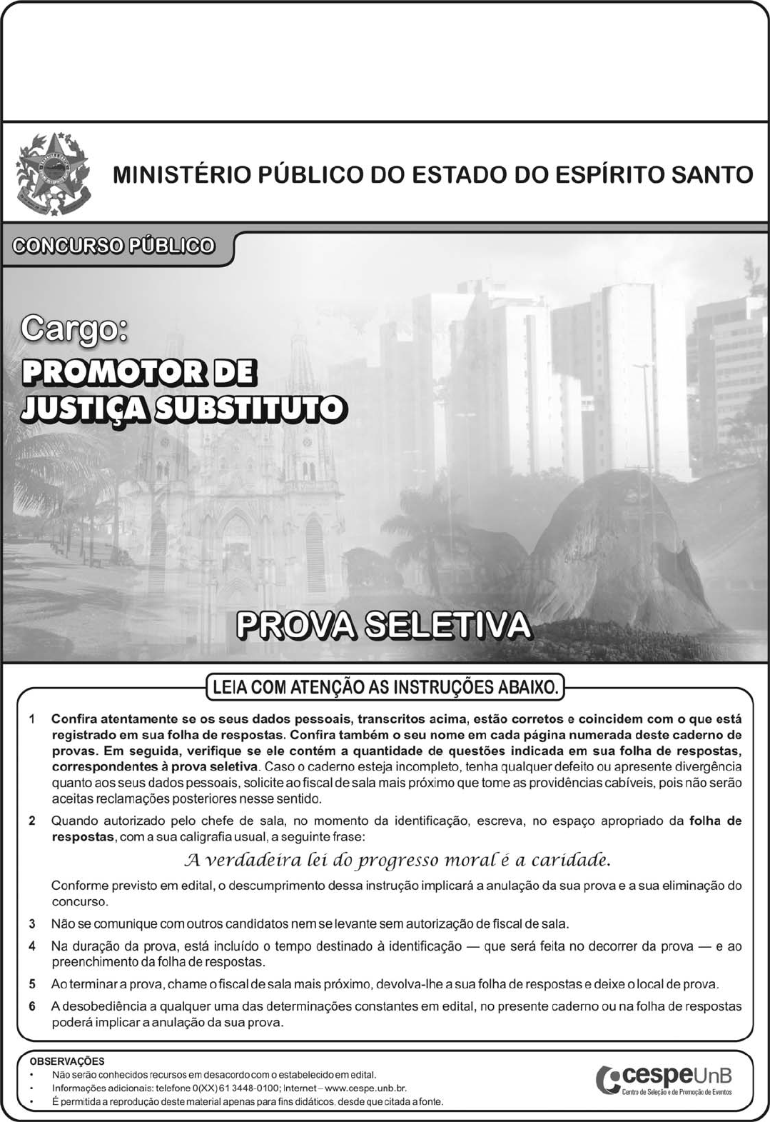 UnB/CESPE – MPE/ES Cargo: Promotor de Justiça Substituto – 1 – C Nas questões a seguir, marque, para cada uma, a única opção correta, de acordo com o respectivo comando. Para as devidas marcações, use a Folha de Respostas, único documento válido para a correção das suas respostas. C Sempre que utilizadas, as siglas subsequentes devem ser interpretadas com a significação associada a cada uma delas, da seguinte forma: CDC = Código de Defesa do Consumidor; CF = Constituição Federal de 1988; CP = Código Penal; CPM = Código Penal Militar; CPP = Código de Processo Penal; CPPM = Código de Processo Penal Militar; DF = Distrito Federal; ECA = Estatuto da Criança e do Adolescente; INSS = Instituto Nacional do Seguro Social; IPM = inquérito policial militar; MP = Ministério Público; MPE = Ministério Público Eleitoral; MPE/ES = Ministério Público do Estado do Espírito Santo; MPF = Ministério Público Federal; RGPS = regime geral de previdência social; STF = Supremo Tribunal Federal; STJ = Superior Tribunal de Justiça; TJ = tribunal de justiça. PROVA SELETIVA QUESTÃO 1 A respeito do concurso de agentes em eventos delituosos, assinale a opção correta. A Considere que um guarda-vidas e um banhista, ambos podendo agir sem perigo pessoal, tenham presenciado o afogamento de uma pessoa na piscina do clube onde o guarda-vidas trabalha e não tenham prestado socorro a ela. Nesse caso, na hipótese de morte da vítima, os dois agentes devem responder pelo delito de omissão de socorro. B Com relação à autoria delitiva, a teoria extensiva considera que todos os participantes do evento delituoso são autores, não admitindo a existência de causas de diminuição de pena nem de diferentes graus de autoria, compatibilizando-se, apenas, com a figura do cúmplice (autor menos relevante), que deve receber pena idêntica à dos demais agentes. C Segundo o critério objetivo-formal da teoria restritiva, somente é considerado autor aquele que pratica o núcleo do tipo; partícipe é aquele que, sem realizar a conduta principal, concorre para o resultado, auxiliando, induzindo ou instigando o autor. D No ordenamento jurídico brasileiro, apenas o homem pode ser autor do delito de estupro; a mulher pode apenas ser partícipe de tal crime, uma vez que, biologicamente, não pode ter conjunção carnal com outra mulher. E Em relação à natureza jurídica do concurso de agentes, o CP adotou a teoria unitária ou monista, segundo a qual cada um dos agentes (autor e partícipe) responde por um delito próprio, havendo pluralidade de fatos típicos, de modo que cada agente deve responder por um crime diferente. QUESTÃO 2 Assinale a opção correta em relação à extinção da punibilidade penal. A Se um indivíduo provocar culposamente um acidente em que faleçam o seu único filho e um terceiro desconhecido, a eventual concessão do perdão judicial ao infrator, decorrente da morte de ente querido, não se estenderá à culpabilidade pela morte do terceiro. B Depois da sentença condenatória com trânsito em julgado para a acusação ou depois de improvido seu recurso, a prescrição regula-se pela pena aplicada, não podendo, em nenhuma hipótese, ter por termo inicial data anterior à da denúncia ou queixa. C A prescrição, antes de a sentença penal condenatória transitar em julgado, regula-se pelo máximo da pena privativa de liberdade cominada ao crime. Mas, se o máximo da pena aplicada ao caso for inferior a um ano, a prescrição ocorrerá em dois anos, em regra. D A prescrição da pena de multa ocorre em dois anos quando a multa for alternativa ou cumulativamente cominada ou cumulativamente aplicada com pena privativa de liberdade. E Caso a prescrição seja interrompida com o início do cumprimento da pena, em qualquer hipótese o prazo começará a correr, novamente, do dia da interrupção. QUESTÃO 3 Acerca dos delitos previstos na parte especial do CP, assinale a opção correta. A Considere a seguinte situação hipotética. Abel, com intenção apenas de lesionar, desferiu golpes de foice contra Bruno, decepando-lhe o braço esquerdo. Nessa situação, Abel cometeu o delito de lesão corporal gravíssima qualificada pela perda de membro. B A figura do homicídio privilegiado compatibiliza-se com as qualificadoras de cunho objetivo, ocasião em que deve ser considerada crime hediondo. C No homicídio, a incidência da qualificadora pelo fato de o delito ter sido praticado mediante paga ou promessa de recompensa é circunstância de caráter objetivo e, portanto, comunicável aos partícipes. D No delito de homicídio, a discussão anterior entre autor e vítima, por si só, não implica o afastamento da qualificadora referente ao motivo fútil, notadamente quando não restar incontroverso o verdadeiro motivo da animosidade. E O agente que praticar aborto ilícito consentido em mulher grávida de gêmeos responderá pelo delito de aborto em concurso formal homogêneo, ainda que desconheça que se trate de gravidez gemelar. QUESTÃO 4 No que concerne aos crimes contra o patrimônio, assinale a opção correta. A Segundo a jurisprudência majoritária dos tribunais superiores, no delito de roubo, o reconhecimento da habitualidade criminosa nas situações concretas não afasta a figura do crime continuado. B No caso de furto, para efeito de aplicação do princípio da insignificância, é imprescindível a distinção entre valor ínfimo, que implica, eventualmente, furto privilegiado, e pequeno valor, que implica a atipia conglobante, considerando a mínima gravidade. C Não pode ser considerado sujeito ativo do delito de furto de coisa comum o promitente comprador da unidade autônoma, na medida em que, juridicamente, ainda não é considerado condômino. D Para o reconhecimento da causa de aumento de pena por utilização de arma de fogo, dispensam-se a apreensão da arma e a realização de exame pericial para atestar a potencialidade lesiva da arma, send
