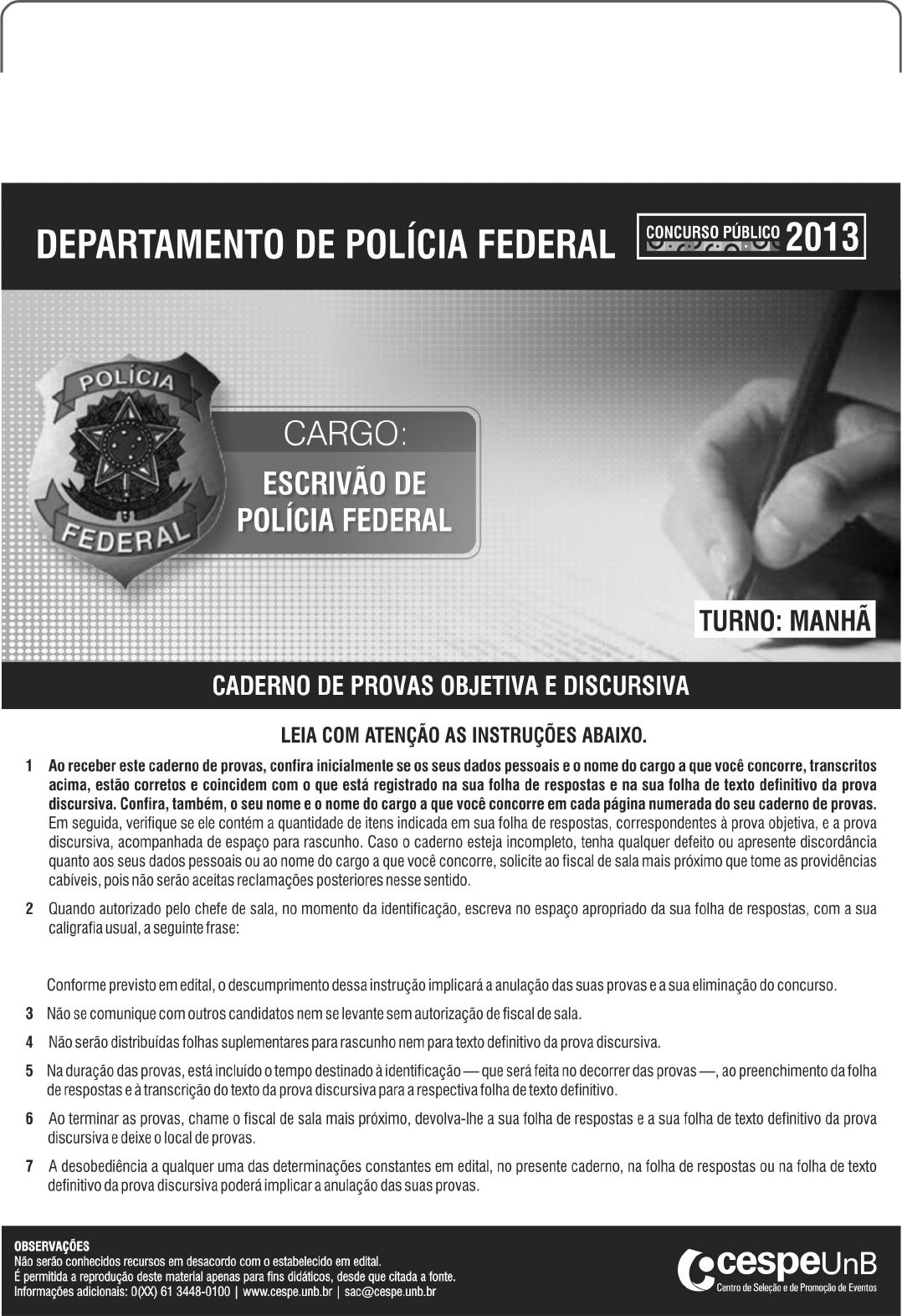 ||DPF13ESC_001_01N691261|| CESPE/UnB – MJ/DPF/2013 • De acordo com o comando a que cada um dos itens a seguir se refira, marque, na folha de respostas, para cada item: o campo designado com o código C, caso julgue o item CERTO; ou o campo designado com o código E, caso julgue o item ERRADO. A ausência de marcação ou a marcação de ambos os campos não serão apenadas, ou seja, não receberão pontuação negativa. Para as devidas marcações, use a folha de respostas, único documento válido para a correção da sua prova objetiva. • Nos itens que avaliam conhecimentos de informática, a menos que seja explicitamente informado o contrário, considere que todos os programas mencionados estão em configuração-padrão, em português, que o mouse está configurado para pessoas destras, que expressões como clicar, clique simples e clique duplo referem-se a cliques com o botão esquerdo do mouse e que teclar corresponde à operação de pressionar uma tecla e, rapidamente, liberá-la, acionando-a apenas uma vez. Considere também que não há restrições de proteção, de funcionamento e de uso em relação aos programas, arquivos, diretórios, recursos e equipamentos mencionados. PROVA OBJETIVA O que tanta gente foi fazer do lado de fora do tribunal1 onde foi julgado um dos mais famosos casais acusados de assassinato no país? Torcer pela justiça, sim: as evidências permitiam uma forte convicção sobre os culpados, muito antes4 do encerramento das investigações. Contudo, para torcer pela justiça, não era necessário acampar na porta do tribunal, de onde ninguém podia pressionar os jurados. Bastava fazer7 abaixo-assinados via Internet pela condenação do pai e da madrasta da vítima. O que foram fazer lá, ao vivo? Penso que as pessoas não torceram apenas pela condenação dos principais10 suspeitos. Torceram também para que a versão que inculpou o pai e a madrasta fosse verdadeira. O relativo alívio que se sente ao saber que um13 assassinato se explica a partir do círculo de relações pessoais da vítima talvez tenha duas explicações. Primeiro, a fantasia de que em nossas famílias isso nunca há de acontecer. Em geral16 temos mais controle sobre nossas relações íntimas que sobre o acaso dos maus encontros que podem nos vitimar em uma cidade grande. Segundo, porque o crime familiar permite o19 lenitivo da construção de uma narrativa. Se toda morte violenta, ou súbita, nos deixa frente a frente com o real traumático, busca-se a possibilidade de inscrever o acontecido22 em uma narrativa, ainda que terrível, capaz de produzir sentido para o que não tem tamanho nem nunca terá, o que não tem conserto nem nunca terá, o que não faz sentido. 25 Maria Rita Khel. A morte do sentido. Internet: <www.mariaritakehl.psc.br> (com adaptações). Com base no texto acima, julgue os itens de 1 a 8. 1 Sem prejuízo das relações sintático-semânticas do texto, os dois últimos períodos do primeiro parágrafo do texto poderiam ser corretamente reescritos da seguinte forma: Penso que as pessoas não torceram apenas pela condenação dos principais suspeitos, tendo torcido também — e principalmente — para que a versão que inculpou o pai e a madrasta fosse verdadeira. 2 Sem prejuízo do sentido original do texto, os dois-pontos empregados logo após “sim” (R.3) poderiam ser substituídos por vírgula, seguida de dado que ou uma vez que. 3 De natureza indagativa, o texto coteja o comportamento do povo diante de determinados julgamentos. Em relação a uns, o povo se mobiliza ruidosamente; a outros, manifesta completo desinteresse. 4 O trecho “o que não tem tamanho nem nunca terá, o que não tem conserto nem nunca terá, o que não faz sentido” (R.24-25) evoca o sentimento de revolta das famílias vítimas de violência urbana. 5 As expressões nominais “os culpados” (R.4), “os jurados” (R.7), “principais suspeitos” (R.10-11) e o “o pai e a madrasta” (R.12) formam uma cadeia coesiva, referindo-se a “um dos mais famosos casais acusados de assassinato no país” (R.2-3). 6 A substituição da expressão “ainda que terrível” (R.23) por senão que terrível preservaria a correção gramatical e o sentido original do texto. 7 O emprego dos elementos “onde” (R.2) e “de onde” (R.6-7), no texto, é próprio da linguagem oral informal, razão por que devem ser substituídos, respectivamente, por no qual e da qual, em textos que requerem o emprego da norma padrão escrita. 8 Sem prejuízo da correção gramatical e do sentido do texto, a oração “que inculpou o pai e a madrasta” (R.11-12) poderia ser isolada por vírgulas, sendo a opção pelo emprego desse sinal de pontuação uma questão de estilo apenas. A fim de solucionar o litígio, atos sucessivos e1 concatenados são praticados pelo escrivão. Entre eles, estão os atos de comunicação, os quais são indispensáveis para que os sujeitos do processo tomem conhecimento dos atos acontecidos4 no correr do procedimento e se habilitem a exercer os direitos que lhes cabem e a suportar os ônus que a lei lhes impõe. Internet: <http://jus.com.br> (com adaptações). No que se refere ao texto acima, julgue os itens seguintes. 9 Não haveria prejuízo para a correção gramatical do texto nem para seu sentido caso o trecho “A fim de solucionar o litígio” (R.1) fosse substituído por Afim de dar solução à demanda e o trecho “tomem conhecimento dos atos acontecidos no correr do procedimento” (R.4-5) fosse, por sua vez, substituído por conheçam os atos havidos no transcurso do acontecimento. 10 Na linha 3, a correção gramatical do texto seria mantida caso a expressão “os quais” fosse substituída por que ou fosse suprimida, desde que, nesse último caso, fosse suprimida também a forma verbal “são”. 11 O trecho “os sujeitos (...) lhes impõe” (R.3-6) poderia ser corretamente reescrito da seguinte forma: cada um dos sujeitos do processo tome conhecimen