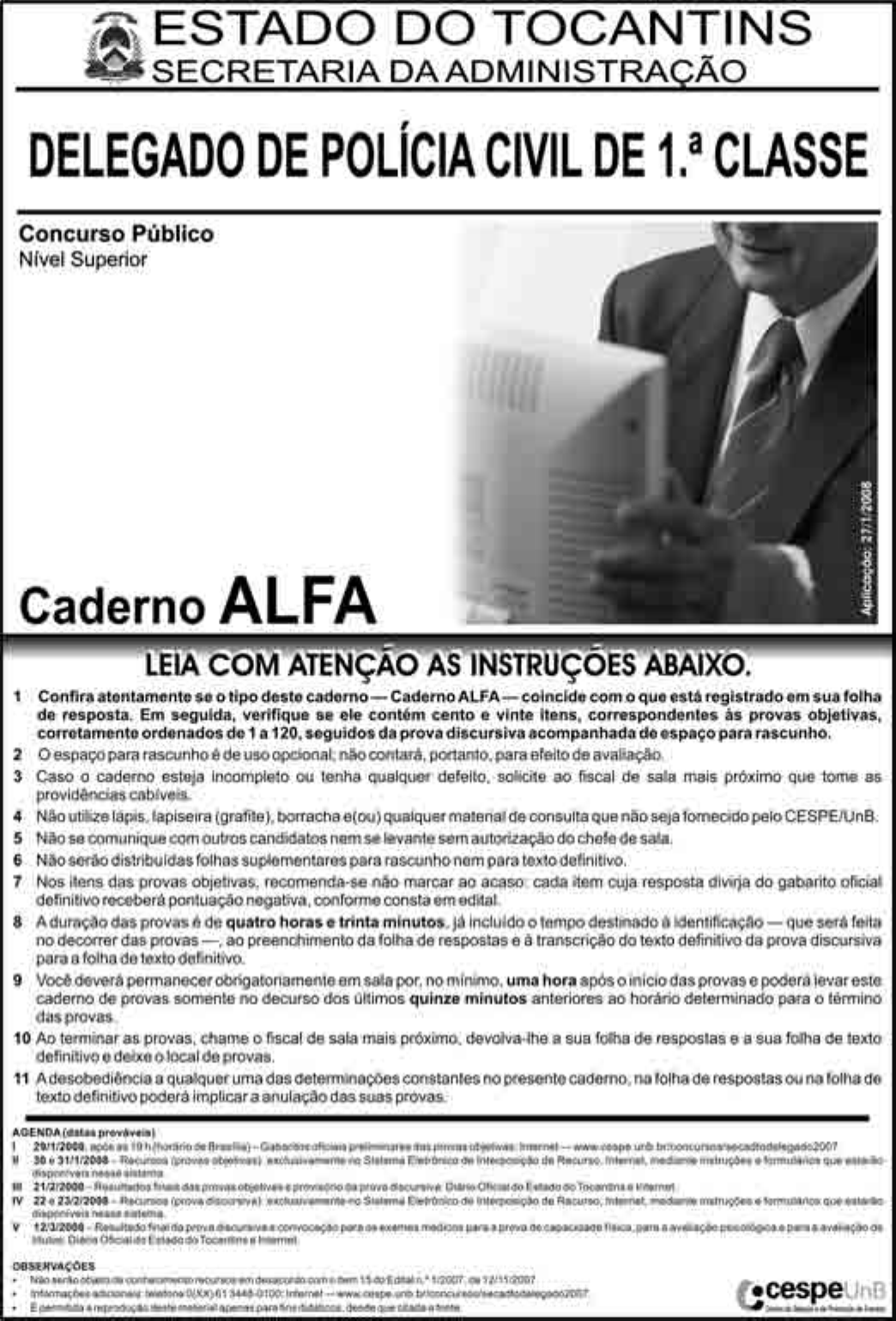 UnB/CESPE – SECAD/TO Caderno Alfa Cargo: Delegado de Polícia Civil – 1 – • De acordo com o comando a que cada um dos itens de 1 a 120 se refira, marque, na folha de respostas, para cada item: o campo designado com o código C, caso julgue o item CERTO; ou o campo designado com o código E, caso julgue o item ERRADO. A ausência de marcação ou a marcação de ambos os campos não serão apenadas, ou seja, não receberão pontuação negativa. Para as devidas marcações, use a folha de respostas, único documento válido para a correção das suas provas. • Nos itens que avaliam Conhecimentos de Informática, a menos que seja explicitamente informado o contrário, considere que todos os programas mencionados estão em configuração-padrão, em português, que o mouse está configurado para pessoas destras e que expressões como clicar, clique simples e clique duplo referem-se a cliques com o botão esquerdo do mouse. Considere também que não há restrições de proteção, de funcionamento e de uso em relação aos programas, arquivos, diretórios e equipamentos mencionados. CONHECIMENTOS BÁSICOS Inteligência artificial Não foi difícil descobrir o assassino. Afinal, o major1 Rich tinha um ótimo motivo para matar Arnold Clayton: amava a esposa da vítima e era correspondido. Segundo a polícia, o major usou uma arma para livrar-se de Clayton e4 escondeu o corpo em um baú. A solução, no entanto, parecia simples demais para o grande detetive Hercule Poirot, do clássico conto policial7 O Mistério do Baú Espanhol, da escritora britânica Agatha Christie. Persistente, ele sai em busca de pistas, descobre fatos novos, tira conclusões espantosas e, por fim, apresenta10 ao leitor outro criminoso. Será que um computador também seria capaz de encontrar o verdadeiro assassino? Durante um curso da13 Universidade de Essen, os alunos testaram diversos programas concebidos em estudos sobre inteligência artificial (IA). Para isso, utilizaram o caso apresentado em16 O Mistério do Baú Espanhol, servindo-se da IA para desvendar as estratégias intelectuais do detetive Poirot. A grande questão era se a IA era capaz desse exercício19 intelectual ou se apenas fazia uma boa imitação da inteligência humana. Interessava saber se apresentaria características que poderiam ser associadas a um22 comportamento inteligente. O objetivo era verificar se o software conseguiria descobrir o assassino tão rapidamente quanto Poirot. 25 Mas será que esses programas-detetive se tornarão, em algum momento, tão inteligentes quanto seus modelos humanos? Se pensarmos apenas na capacidade de processar28 o maior número possível de fatos no menor tempo, então os programas de IA são realmente eficazes. E com uma vantagem: são dotados, como qualquer software, da31 capacidade de lidar com quantidades muito maiores de dados do que as pessoas. No entanto, os cérebros artificiais são inferiores aos34 humanos por pelo menos dois motivos. Por um lado, precisam de todas as informações para chegar à conclusão correta. Por outro lado, a lógica dos programas de IA imita37 a racionalidade humana, afinal, não conhecemos nenhuma outra. Na verdade, os programas de IA trabalham como analistas de dados. Em princípio, não são muito diferentes do40 nosso cérebro. Portanto, ainda não podemos esperar que superpoirots eletrônicos acabem com o mundo do crime. Mente&Cérebro, fev./2007 (com adaptações). Com base no texto Inteligência artificial, julgue os itens a seguir. 1 O texto apresenta uma apologia do emprego de software desenvolvido em estudos de inteligência artificial na resolução de crimes. 2 De acordo com o texto, os seres humanos necessitam de menos informações que um software para solucionar problemas e, por isso, chegam a resultados menos precisos. 3 Na linha 4, haveria prejuízo para a coesão e a coerência textual se a expressão “de Clayton” fosse substituída por do marido. 4 Após a expressão “da escritora britânica” (R.8), poderia ser empregada uma vírgula, conforme faculta a norma gramatical. 5 No segmento “se a IA era capaz desse exercício intelectual ou se apenas fazia uma imitação da inteligência humana” (R.19-21), as formas verbais poderiam ser corretamente substituídas por seria e faria, respectivamente. 6 O período que se inicia na linha 21 estaria gramaticalmente correto se fosse reescrito da seguinte forma: Interessavam as características que pudessem estar relacionadas a um comportamento inteligente. 7 Às palavras “ótimo”, “vítima” e “britânica” aplica-se a mesma regra de acentuação gráfica. Considere que, no estado do Tocantins, um delegado de polícia tenha encaminhado ao secretário de segurança um expediente do qual se tenha extraído o seguinte trecho. Conforme solicitado por Vossa Excelência, comunico que está sendo averiguado a hipótese de envolvimento no assassinato de pessoas com quem a vítima mantinha transações comerciais. Ressalto que foi de grande valia vossa participação no caso em questão. Em face dessas considerações, julgue o item abaixo. 8 O trecho em questão atende às orientações de redação oficial e às normas gramaticais. UnB/CESPE – SECAD/TO Caderno Alfa Cargo: Delegado de Polícia Civil – 2 – Na sociedade moderna, ao inverso das anteriores,1 não há fronteiras, não há exterioridade. Todos os conflitos são resolvidos ou são passíveis de soluções internas. Com o surgimento do espaço da igualdade e do Estado-nação,4 foram implementados mecanismos internos de resolução de conflitos. O sistema capitalista, na medida em que se implantou, por sua vocação natural à mundialização, dirimiu7 a noção de exterioridade. Quando os escravos rebelavam-se no Brasil colônia, só havia uma possibilidade de vitória: a criação de quilombos, as organizações exteriores à sociedade10 colonial-escravagista. Cria-se, dessa forma, um paradoxo na sociedade moderna, pois o exclu