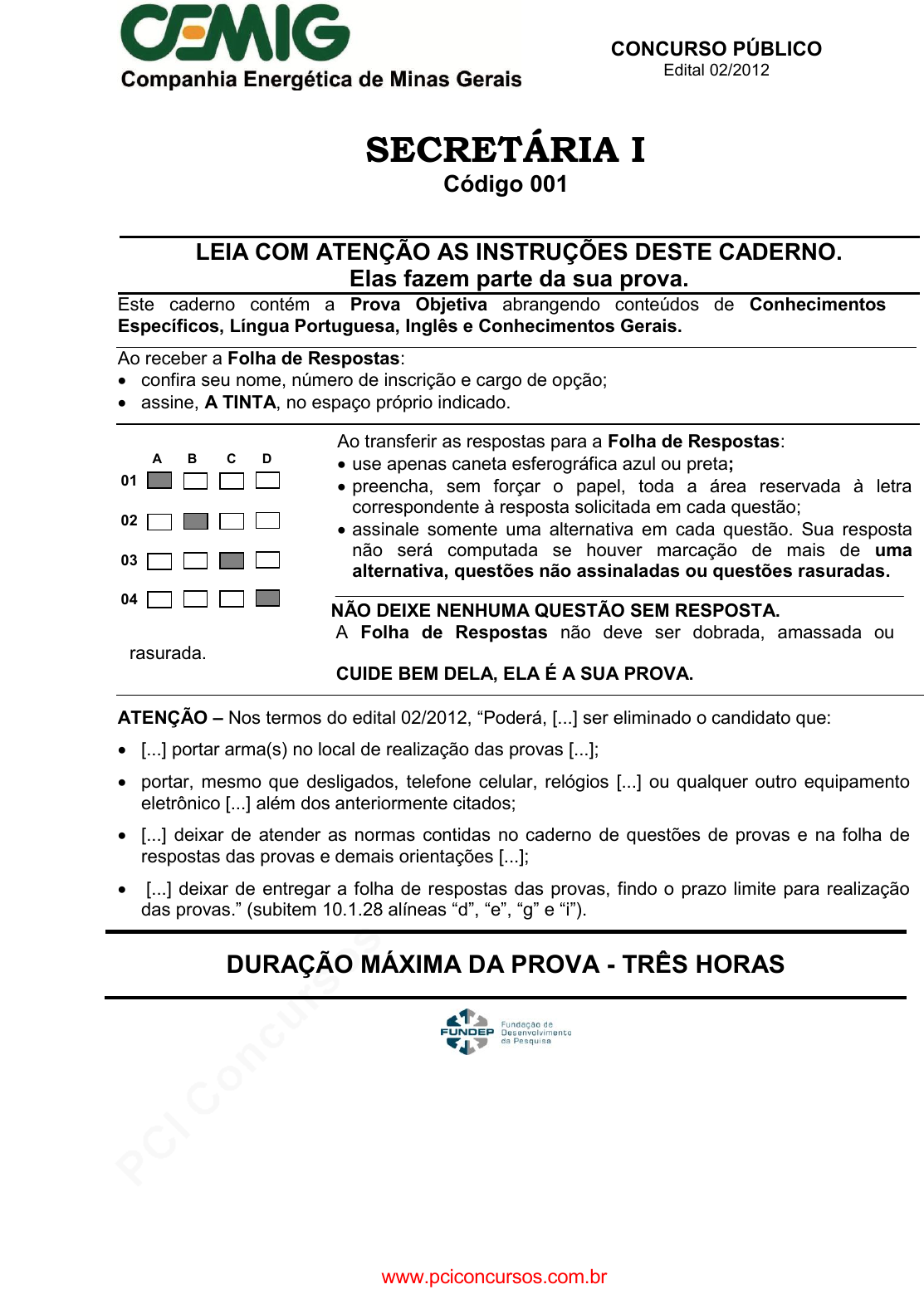pcimarkpci MDAwMDowMDAwOjAwMDA6MDAwMDowMDAwOmZmZmY6MzZlOTpjMjU5:RnJpLCAxMCBTZXAgMjAyMSAyMToxMzoyNyAtMDMwMA== CONCURSO PÚBLICO Edital 02/2012 SECRETÁRIA I Código 001 LEIA COM ATENÇÃO AS INSTRUÇÕES DESTE CADERNO. Elas fazem parte da sua prova. Este caderno contém a Prova Objetiva abrangendo conteúdos de Conhecimentos Específicos, Língua Portuguesa, Inglês e Conhecimentos Gerais. Ao receber a Folha de Respostas: confira seu nome, número de inscrição e cargo de opção; assine, A TINTA, no espaço próprio indicado. NÃO DEIXE NENHUMA QUESTÃO SEM RESPOSTA. A Folha de Respostas não deve ser dobrada, amassada ou rasurada. CUIDE BEM DELA, ELA É A SUA PROVA. ATENÇÃO – Nos termos do edital 02/2012, “Poderá, [...] ser eliminado o candidato que: [...] portar arma(s) no local de realização das provas [...]; portar, mesmo que desligados, telefone celular, relógios [...] ou qualquer outro equipamento eletrônico [...] além dos anteriormente citados; [...] deixar de atender as normas contidas no caderno de questões de provas e na folha de respostas das provas e demais orientações [...]; [...] deixar de entregar a folha de respostas das provas, findo o prazo limite para realização das provas.” (subitem 10.1.28 alíneas “d”, “e”, “g” e “i”). DURAÇÃO MÁXIMA DA PROVA - TRÊS HORAS Ao transferir as respostas para a Folha de Respostas: use apenas caneta esferográfica azul ou preta; preencha, sem forçar o papel, toda a área reservada à letra correspondente à resposta solicitada em cada questão; assinale somente uma alternativa em cada questão. Sua resposta não será computada se houver marcação de mais de uma alternativa, questões não assinaladas ou questões rasuradas. A B C D 01 02 03 04 www.pciconcursos.com.br pcimarkpci MDAwMDowMDAwOjAwMDA6MDAwMDowMDAwOmZmZmY6MzZlOTpjMjU5:RnJpLCAxMCBTZXAgMjAyMSAyMToxMzoyNyAtMDMwMA== 2 CEMIG 2 – 001 - Secretária A T E N Ç Ã O Senhor(a) Candidato(a), Antes de começar a fazer a prova, confira se este caderno contém, ao todo, 50 (cinquenta) questões objetivas, cada uma constituída de 4 (quatro) alternativas, assim distribuídas: 18 (dezoito) questões de Conhecimentos Específicos, 12 (doze) questões de Língua Portuguesa, 12 (doze) questões de Inglês e 8 (oito) questões de Conhecimentos Gerais, todas perfeitamente legíveis. Identificando algum problema, informe-o imediatamente ao aplicador de provas para que ele tome as providências necessárias. Caso V.Sª não observe essa recomendação, não lhe caberá qualquer reclamação ou recurso posteriores. www.pciconcursos.com.br pcimarkpci MDAwMDowMDAwOjAwMDA6MDAwMDowMDAwOmZmZmY6MzZlOTpjMjU5:RnJpLCAxMCBTZXAgMjAyMSAyMToxMzoyNyAtMDMwMA== 3 CEMIG 2 – 001 - Secretária Conhecimentos Específicos Questão 1 A avalanche gerada na produção de informações leva as empresas a implantar um sistema de Gerenciamento Eletrônico de Documentos (GED). São razões para a implantação do GED, EXCETO A) inclusão de fator diferenciado competitivo. B) extinção do absoluto controle dos processos de negócios. C) diminuição de tempo de tramitação dos documentos. D) eliminação dos riscos de extravio de documentos. www.pciconcursos.com.br pcimarkpci MDAwMDowMDAwOjAwMDA6MDAwMDowMDAwOmZmZmY6MzZlOTpjMjU5:RnJpLCAxMCBTZXAgMjAyMSAyMToxMzoyNyAtMDMwMA== 4 CEMIG 2 – 001 - Secretária Questão 2 Muitos são os saberes essenciais que constituem o sucesso do profissional de secretariado. Numere a COLUNA II de acordo com a COLUNA I fazendo a relação entre as funções básicas desse profissional e ações a elas referentes. COLUNA I COLUNA II 1. Rotina diária 2. Uso da comunicação 3. Gerenciamento do tempo 4. Relacionamento interpessoal 5. Supervisão de diversas áreas ( ) orientação da telefonia, do despacho e manuseio de correspondência, do serviço de protocolo e recepção. ( ) utilização de técnicas que possibilitem uma rotina de trabalho voltada a assuntos realmente relevantes. ( ) aplicação das técnicas de secretariado, planejamento, organização e controle de agenda, arquivo, follow-up, reuniões, viagens. ( ) uso dos diversos meios disponíveis, inclusive em outros idiomas. ( ) criação de condições para ambiente de harmonia minimizando conflitos. Assinale a alternativa que apresenta a sequência de números CORRETA. A) (2) (4) (3) (5) (1) B) (1) (5) (4) (2) (3) C) (3) (4) (2) (5) (1) D) (3) (5) (1) (4) (2) www.pciconcursos.com.br pcimarkpci MDAwMDowMDAwOjAwMDA6MDAwMDowMDAwOmZmZmY6MzZlOTpjMjU5:RnJpLCAxMCBTZXAgMjAyMSAyMToxMzoyNyAtMDMwMA== 5 CEMIG 2 – 001 - Secretária Questão 3 Deixar de conhecer os códigos que regem cada grupo ou desrespeitá-los é a forma mais eficaz para o fracasso profissional. Portanto, o que vai diferenciar o profissional é a elegância em transitar em qualquer ambiente e nas diversas situações sociais e empresariais. A esse respeito, assinale a afirmativa CORRETA. A) Não utilize faca para cortar massas, a faca é permitida apenas para cortar lasanha. B) Os talheres devem ser colocados cruzados dentro do prato ao término de uma refeição. C) A faca deve ficar apoiada na mesa enquanto estiver sendo feita a refeição. D) Azeitonas e frutas que enfeitam drinks devem ser comidas antes de ingerir o conteúdo. Questão 4 Atualmente dispomos de equipamentos de telefonia com tecnologias que ajudam o profissional de secretariado a otimizar seu tempo e o dos executivos. A esse respeito, numere a COLUNA II de acordo com a COLUNA I. COLUNA I COLUNA II 1. Chamada em espera 2. Indicativo de chamada 3. Retorno de chamada 4. Videoconferência 5. Detector de chamada ( ) permite ver o número que está ligando para o seu número. ( ) permite saber quando o número chamado está disponível. ( ) permite a conexão de mais de dois usuários ao mesmo tempo. ( ) permite saber quando outra ligação está no seu número. ( ) indica número adicional com toque diferente. Assinale a alternativa que apresenta a sequência de núme