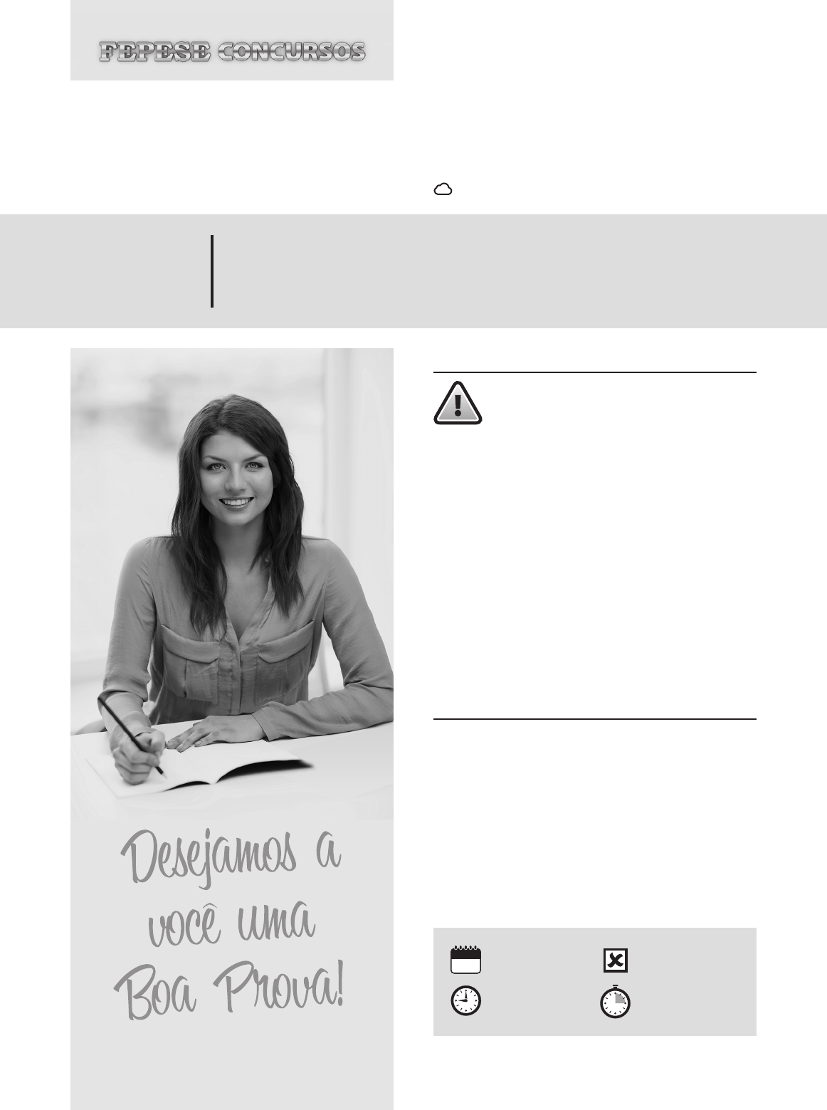 www.pciconcursos.com.br Município de Bombinhas Concurso Público • Edital 002/2015 http://bombinhas.fepese.org.br Instruções Confira o número que você obteve no ato da inscrição com o que está indicado no cartão-resposta. * A duração da prova inclui o tempo para o preenchimento do cartão-resposta. Para fazer a prova você usará: � este caderno de prova; � um cartão-resposta que contém o seu nome, número de inscrição e espaço para assinatura. Verifique, no caderno de prova, se: � faltam folhas e a sequência de questões está correta. � há imperfeições gráficas que possam causar dúvidas. Comunique imediatamente ao fiscal qualquer irregularidade! Atenção! � Não é permitido qualquer tipo de consulta durante a realização da prova. � Para cada questão são apresentadas 5 alternativas diferen- tes de respostas (a, b, c, d, e). Apenas uma delas constitui a resposta correta em relação ao enunciado da questão. � A interpretação das questões é parte integrante da prova, não sendo permitidas perguntas aos fiscais. � Não destaque folhas da prova. Ao terminar a prova, entregue ao fiscal o caderno de prova completo e o cartão-resposta devidamente preenchido e assinado. outubro 18 18 de outubro 9 às 12h 25 questões 3h de duração* C A D E R N O D E P R O V A F07 Pedreiro www.pciconcursos.com.br . www.pciconcursos.com.br Página 3 Município de Bombinhas F07 Pedreiro Estudos Sociais 4 questões 4. Segundo o IBGE (dados de 2010), a popula- ção residente do município de Bombinhas é de aproximadamente: a. ( ) 7 mil habitantes. b. ( X ) 14 mil habitantes. c. ( ) 140 mil habitantes. d. ( ) 240 mil habitantes. e. ( ) Menos de 10 mil habitantes. 5. Qual é a data em que comemoramos o aniversário de Bombinhas? a. ( X ) 15 de março b. ( ) 31 de março c. ( ) 15 de abril d. ( ) 28 de julho e. ( ) 13 de dezembro 6. Segundo autores, um navegador a serviço da Espanha foi um dos primeiros europeus a chegar à nossa região. Quem foi? a. ( ) Vasco da Gama b. ( X ) Sebastião Caboto c. ( ) Frei Junípero Sierra d. ( ) Pedro Álvares Cabral e. ( ) Pero Nuñes Cabeza de Vaca 7. As tradições e os costumes da maioria da popula- ção local de Bombinhas foram herdados da cultura: a. ( ) Alemã. b. ( ) Italiana. c. ( ) Farroupilha. d. ( ) Francesa. e. ( X ) Açoriana. Conhecimentos Gerais Língua Nacional 3 questões 1. Assinale a frase que deve terminar com um ponto de interrogação. a. ( ) Nossa que desaforo b. ( X ) Onde queres colocar isso c. ( ) Que maravilhoso o dia de hoje d. ( ) Se quiseres, podes me procurar e. ( ) Dentro de dois dias vai sair o resultado, disse o professor 2. Assinale a frase em que a inicial maiúscula está corretamente empregada. a. ( X ) Natal e Páscoa são festas cristãs. b. ( ) Percorri o país de Norte a Sul. c. ( ) Na Segunda- feira sairá o resultado do concurso. d. ( ) Na Primavera e no Verão os dias são mais bonitos. e. ( ) Nos meses de Janeiro e Fevereiro temos férias escolares. 3. Assinale a frase correta quanto à concordância. a. ( ) Entrou pela porta, agora, dois chefes do setor. b. ( ) Fazia muita bagunça aqueles meninos levados. c. ( ) Já chegou as encomendas solicitadas. d. ( X ) Solicitou revisão das provas aquele aluno. e. ( ) Comprei dois quilos de carne que custou trinta real. www.pciconcursos.com.br Página 4 Município de Bombinhas F07 Pedreiro Higiene e Segurança no Trabalho 5 questões 11. Como é chamado o processo em que parasitas, micróbios e substâncias tóxicas que prejudicam a saúde humana entram em contato com os alimentos, durante a manipulação? a. ( ) Cocção b. ( ) Limpeza c. ( ) Elaboração d. ( X ) Contaminação e. ( ) Higienização 12. Como é conhecido o conjunto de ações, tais como: lavar as mãos, escovar os dentes, limpar as unhas e tomar banho? a. ( X ) Higiene pessoal b. ( ) Limpeza ambiental c. ( ) Segurança alimentar d. ( ) Bom comportamento e. ( ) Educação para o trabalho 13. Como é chamada a alimentação em que se inge- rem todos os alimentos de forma equilibrada, ou seja, respeitando a qualidade e a quantidade necessária de cada um? a. ( ) Dieta restritiva b. ( ) Nutrição básica c. ( X ) Alimentação saudável d. ( ) Alimentação reforçada e. ( ) Complementação alimentar 14. Que atitude devemos adotar ao efetuarmos a manutenção em equipamentos elétricos ligados per- manentemente a rede, tais como: lâmpadas, chuveiros e outros equipamentos? a. ( ) Cortar os fios com alicate. b. ( ) Utilizar escada de madeira. c. ( ) Usar somente alicate metálico. d. ( X ) Desligar o disjuntor (chave de energia), na caixa de distribuição. e. ( ) Acender a lâmpada mais próxima. Matemática 3 questões 8. João e Maria foram ao supermercado. João com- prou três sacolas de maçã com 13 unidades em cada sacola, e 4 unidades de pera. Maria comprou um terço do número de maçãs que João e o dobro de peras. Portanto, o número total de peras e maças que João e Maria compraram juntos foi: a. ( ) 39. b. ( ) 59. c. ( X ) 64. d. ( ) 69. e. ( ) 71. 9. João, José e Rafael trabalham juntos em um lava carros e ao final de um dia ganham R$258,00. Deste valor, Rafael ficará com a metade e João e José dividi- rão igualmente o restante. Portanto o valor que João receberá é igual a: a. ( ) R$ 64,00. b. ( X ) R$ 64,50. c. ( ) R$ 69,50. d. ( ) R$ 129,00. e. ( ) R$ 128,50. 10. Os 50 jogadores de três times de futebol de uma mesma cidade foram viajar a uma competição, sendo levados em vários carros com capacidade para no máximo 5 jogadores. Sabe-se que jogadores do mesmo time somente dividiram carro entre eles, e que o número de jogadores em cada carro do mesmo time é igual. Sabe-se ainda que os 20 jogadores do time A divi- diram 4 carros, os times B e C têm 5 jogadores a menos que o time A e que cada carro do time B contava com dois jogadores a mais do que em um carro do time C. Portanto, o número de carros que foram utilizados para a viagem dos tim