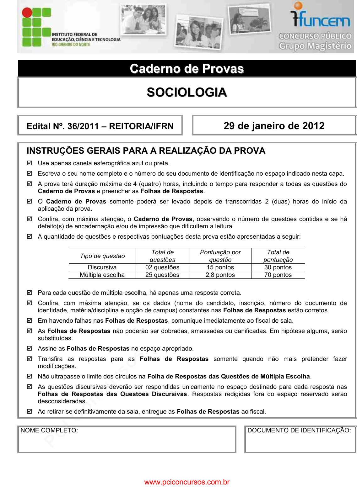 pcimarkpci MDAwMDowMDAwOjAwMDA6MDAwMDowMDAwOmZmZmY6MzZlOTpjMjU5:RnJpLCAxMCBTZXAgMjAyMSAyMzowODozOCAtMDMwMA== CCaaddeerrnnoo ddee PPrroovvaass SSOOCCIIOOLLOOGGIIAA Edital Nº. 36/2011 – REITORIA/IFRN 29 de janeiro de 2012 INSTRUÇÕES GERAIS PARA A REALIZAÇÃO DA PROVA Use apenas caneta esferográfica azul ou preta. Escreva o seu nome completo e o número do seu documento de identificação no espaço indicado nesta capa. A prova terá duração máxima de 4 (quatro) horas, incluindo o tempo para responder a todas as questões do Caderno de Provas e preencher as Folhas de Respostas. O Caderno de Provas somente poderá ser levado depois de transcorridas 2 (duas) horas do início da aplicação da prova. Confira, com máxima atenção, o Caderno de Provas, observando o número de questões contidas e se há defeito(s) de encadernação e/ou de impressão que dificultem a leitura. A quantidade de questões e respectivas pontuações desta prova estão apresentadas a seguir: Tipo de questão Total de questões Pontuação por questão Total de pontuação Discursiva 02 questões 15 pontos 30 pontos Múltipla escolha 25 questões 2,8 pontos 70 pontos Para cada questão de múltipla escolha, há apenas uma resposta correta. Confira, com máxima atenção, se os dados (nome do candidato, inscrição, número do documento de identidade, matéria/disciplina e opção de campus) constantes nas Folhas de Respostas estão corretos. Em havendo falhas nas Folhas de Respostas, comunique imediatamente ao fiscal de sala. As Folhas de Respostas não poderão ser dobradas, amassadas ou danificadas. Em hipótese alguma, serão substituídas. Assine as Folhas de Respostas no espaço apropriado. Transfira as respostas para as Folhas de Respostas somente quando não mais pretender fazer modificações. Não ultrapasse o limite dos círculos na Folha de Respostas das Questões de Múltipla Escolha. As questões discursivas deverão ser respondidas unicamente no espaço destinado para cada resposta nas Folhas de Respostas das Questões Discursivas. Respostas redigidas fora do espaço reservado serão desconsideradas. Ao retirar-se definitivamente da sala, entregue as Folhas de Respostas ao fiscal. NOME COMPLETO: DOCUMENTO DE IDENTIFICAÇÃO: www.pciconcursos.com.br pcimarkpci MDAwMDowMDAwOjAwMDA6MDAwMDowMDAwOmZmZmY6MzZlOTpjMjU5:RnJpLCAxMCBTZXAgMjAyMSAyMzowODozOCAtMDMwMA== pcimarkpci MDAwMDowMDAwOjAwMDA6MDAwMDowMDAwOmZmZmY6MzZlOTpjMjU5:RnJpLCAxMCBTZXAgMjAyMSAyMzowODozOCAtMDMwMA== www.pciconcursos.com.br pcimarkpci MDAwMDowMDAwOjAwMDA6MDAwMDowMDAwOmZmZmY6MzZlOTpjMjU5:RnJpLCAxMCBTZXAgMjAyMSAyMzowODozOCAtMDMwMA== CONCURSO PÚBLICO – GRUPO MAGISTÉRIO EDITAL Nº. 36/2011-REITORIA/IFRN IFRN – Concurso Público – Grupo Magistério – Sociologia 1 QUESTÕES DISCURSIVAS ESTAS QUESTÕES DEVERÃO SER RESPONDIDAS NAS FOLHAS DE RESPOSTAS DAS QUESTÕES DISCURSIVAS. Questão 1 A Sociologia oferece diversas possibilidades teóricas para análise da relação indivíduo e sociedade, dentre as quais, destacam-se as desenvolvidas pelos autores contemporâneos Pierre Bourdieu e Nobert Elias. Escolha um dos referidos autores e descreva sua concepção teórica sobre a relação indivíduo e sociedade. www.pciconcursos.com.br pcimarkpci MDAwMDowMDAwOjAwMDA6MDAwMDowMDAwOmZmZmY6MzZlOTpjMjU5:RnJpLCAxMCBTZXAgMjAyMSAyMzowODozOCAtMDMwMA== CONCURSO PÚBLICO – GRUPO MAGISTÉRIO EDITAL Nº. 36/2011-REITORIA/IFRN IFRN – Concurso Público Grupo Magistério – Sociologia 2 Questão 2 Uma das perguntas mais frequentes sobre a disciplina Sociologia é: “Para que serve a Sociologia?”. Tomando como base os Parâmetros Curriculares Nacionais para o Ensino Médio (PCNEM), explique a importância dessa disciplina no Ensino Médio. www.pciconcursos.com.br pcimarkpci MDAwMDowMDAwOjAwMDA6MDAwMDowMDAwOmZmZmY6MzZlOTpjMjU5:RnJpLCAxMCBTZXAgMjAyMSAyMzowODozOCAtMDMwMA== CONCURSO PÚBLICO – GRUPO MAGISTÉRIO EDITAL Nº. 36/2011-REITORIA/IFRN IFRN – Concurso Público – Grupo Magistério – Sociologia 3 QUESTÕES DE MÚLTIPLA ESCOLHA AS RESPOSTAS DESTAS QUESTÕES DEVERÃO SER ASSINALADAS NA FOLHA DE RESPOSTAS DAS QUESTÕES DE MÚLTIPLA ESCOLHA. 01. Uma dos principais problemas da competição internacional é o chamado “dumping social”, que consiste A) no aviltamento do trabalho através da exploração de crianças e adolescentes. B) na falta de qualificação de mão de obra especializada. C) na escassez de infraestrutura voltada para desenvolvimento da iniciativa privada. D) na crise do sindicalismo mundial. 02. Sobre qualificação profissional e inserção no mundo do trabalho, assinale as afirmativas com (V) para as verdadeiras e com (F) para falsas. ( ) Na competição intensificada, os segmentos profissionais mais preparados, intelectual e pessoalmente, são mais capazes de sair ganhando financeiramente ou em outros aspectos da vida. ( ) A proficiência específica é significativamente mais importante que as disposições e virtudes. Não basta conhecimento, mas interesse, motivação e criatividade. ( ) Exige-se flexibilidade para enfrentar o emprego, o desemprego e o autoemprego, além do conhecimento e uso das tecnologia mais modernas. ( ) Não se trata apenas de qualificar para o trabalho em si, mas para a vida na qual também se insere o trabalho. O profissional deve estar preparado para fazer face às inúmeras consequências na vida social e pessoal. Em relação às afirmativas anteriores, a sequência correta é A) V, F, V, F. B) V, F, V, V. C) F, V, F, V. D) V, V, F, V. 03. De acordo com Ulrich Beck (1992), as mudanças nos modelos de emprego, o declínio da influência da tradição e do costume sobre a autoidentidade, o desgaste dos paradigmas familiares tradicionais e a democratização dos relacionamentos são características da A) discriminação social. B) reestruturação global. C) sociedade de risco. D) diáspora global. www.pciconcursos.com.br pcimarkpci MDAwMDowMDAwOjAwMDA6MDAwMDowMDAwOmZmZmY6MzZlOTpjMjU5