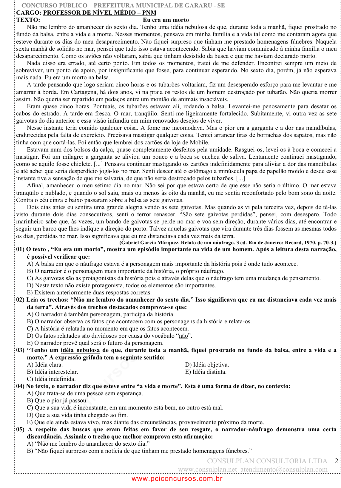 pcimarkpci MDAwMDowMDAwOjAwMDA6MDAwMDowMDAwOmZmZmY6MzZlOTpjMjU5:TW9uLCAxMyBTZXAgMjAyMSAwMzo0ODo0MSAtMDMwMA== CONCURSO PÚBLICO – PREFEITURA MUNICIPAL DE GARARU - SE CONSULPLAN CONSULTORIA LTDA www.consulplan.net atendimento@consulplan.com 2 CARGO: PROFESSOR DE NÍVEL MÉDIO – PNM TEXTO: Eu era um morto Não me lembro do amanhecer do sexto dia. Tenho uma idéia nebulosa de que, durante toda a manhã, fiquei prostrado no fundo da balsa, entre a vida e a morte. Nesses momentos, pensava em minha família e a vida tal como me contaram agora que esteve durante os dias do meu desaparecimento. Não fiquei surpreso que tinham me prestado homenagens fúnebres. Naquela sexta manhã de solidão no mar, pensei que tudo isso estava acontecendo. Sabia que haviam comunicado à minha família o meu desaparecimento. Como os aviões não voltaram, sabia que tinham desistido da busca e que me haviam declarado morto. Nada disso era errado, até certo ponto. Em todos os momentos, tratei de me defender. Encontrei sempre um meio de sobreviver, um ponto de apoio, por insignificante que fosse, para continuar esperando. No sexto dia, porém, já não esperava mais nada. Eu era um morto na balsa. À tarde pensando que logo seriam cinco horas e os tubarões voltariam, fiz um desesperado esforço para me levantar e me amarrar à borda. Em Cartagena, há dois anos, vi na praia os restos de um homem destroçado por tubarão. Não queria morrer assim. Não queria ser repartido em pedaços entre um montão de animais insaciáveis. Eram quase cinco horas. Pontuais, os tubarões estavam ali, rodando a balsa. Levantei-me penosamente para desatar os cabos do estrado. A tarde era fresca. O mar, tranqüilo. Senti-me ligeiramente fortalecido. Subitamente, vi outra vez as sete gaivotas do dia anterior e essa visão infundiu em mim renovados desejos de viver. Nesse instante teria comido qualquer coisa. A fome me incomodava. Mas o pior era a garganta e a dor nas mandíbulas, endurecidas pela falta de exercício. Precisava mastigar qualquer coisa. Tentei arrancar tiras de borrachas dos sapatos, mas não tinha com que cortá-las. Foi então que lembrei dos cartões da loja de Mobile. Estavam num dos bolsos da calça, quase completamente desfeitos pela umidade. Rasguei-os, levei-os à boca e comecei a mastigar. Foi um milagre: a garganta se aliviou um pouco e a boca se encheu de saliva. Lentamente continuei mastigando, como se aquilo fosse chiclete. [...] Pensava continuar mastigando os cartões indefinidamente para aliviar a dor das mandíbulas e até achei que seria desperdício jogá-los no mar. Senti descer até o estômago a minúscula papa de papelão moído e desde esse instante tive a sensação de que me salvaria, de que não seria destroçado pelos tubarões. [...] Afinal, amanheceu o meu sétimo dia no mar. Não sei por que estava certo de que esse não seria o último. O mar estava tranqüilo e nublado, e quando o sol saiu, mais ou menos às oito da manhã, eu me sentia reconfortado pelo bom sono da noite. Contra o céu cinza e baixo passaram sobre a balsa as sete gaivotas. Dois dias antes eu sentira uma grande alegria vendo as sete gaivotas. Mas quando as vi pela terceira vez, depois de tê-las visto durante dois dias consecutivos, senti o terror renascer. “São sete gaivotas perdidas”, pensei, com desespero. Todo marinheiro sabe que, às vezes, um bando de gaivotas se perde no mar e voa sem direção, durante vários dias, até encontrar e seguir um barco que lhes indique a direção do porto. Talvez aquelas gaivotas que vira durante três dias fossem as mesmas todos os dias, perdidas no mar. Isso significava que eu me distanciava cada vez mais da terra. (Gabriel Garcia Márquez. Relato de um náufrago. 3 ed. Rio de Janeiro: Record, 1970. p. 70-3.) 01) O texto , “Eu era um morto”, mostra um episódio importante na vida de um homem. Após a leitura desta narração, é possível verificar que: A) A balsa em que o náufrago estava é a personagem mais importante da história pois é onde tudo acontece. B) O narrador é o personagem mais importante da história, o próprio náufrago. C) As gaivotas são as protagonistas da história pois é através delas que o náufrago tem uma mudança de pensamento. D) Neste texto não existe protagonista, todos os elementos são importantes. E) Existem anteriormente duas respostas corretas. 02) Leia os trechos: “Não me lembro do amanhecer do sexto dia.” Isso significava que eu me distanciava cada vez mais da terra”. Através dos trechos destacados comprova-se que: A) O narrador é também personagem, participa da história. B) O narrador observa os fatos que acontecem com os personagens da história e relata-os. C) A história é relatada no momento em que os fatos acontecem. D) Os fatos relatados são duvidosos por causa do vocábulo “não”. E) O narrador prevê qual será o futuro da personagem. 03) “Tenho um idéia nebulosa de que, durante toda a manhã, fiquei prostrado no fundo da balsa, entre a vida e a morte.” A expressão grifada tem o seguinte sentido: A) Idéia clara. D) Idéia objetiva. B) Idéia interestelar. E) Idéia distinta. C) Idéia indefinida. 04) No texto, o narrador diz que esteve entre “a vida e morte”. Esta é uma forma de dizer, no contexto: A) Que trata-se de uma pessoa sem esperança. B) Que o pior já passou. C) Que a sua vida é inconstante, em um momento está bem, no outro está mal. D) Que a sua vida tinha chegado ao fim. E) Que ele ainda estava vivo, mas diante das circunstâncias, provavelmente próximo da morte. 05) A respeito das buscas que eram feitas em favor de seu resgate, o narrador-náufrago demonstra uma certa discordância. Assinale o trecho que melhor comprova esta afirmação: A) “Não me lembro do amanhecer do sexto dia.” B) “Não fiquei surpreso com a notícia de que tinham me prestado homenagens fúnebres.” www.pciconcursos.com.br pcimarkpci MDAwMDowMDAwOjAwMDA6MDAwMDowMDAwOmZmZmY6MzZlOTpjMjU5:TW9uLC