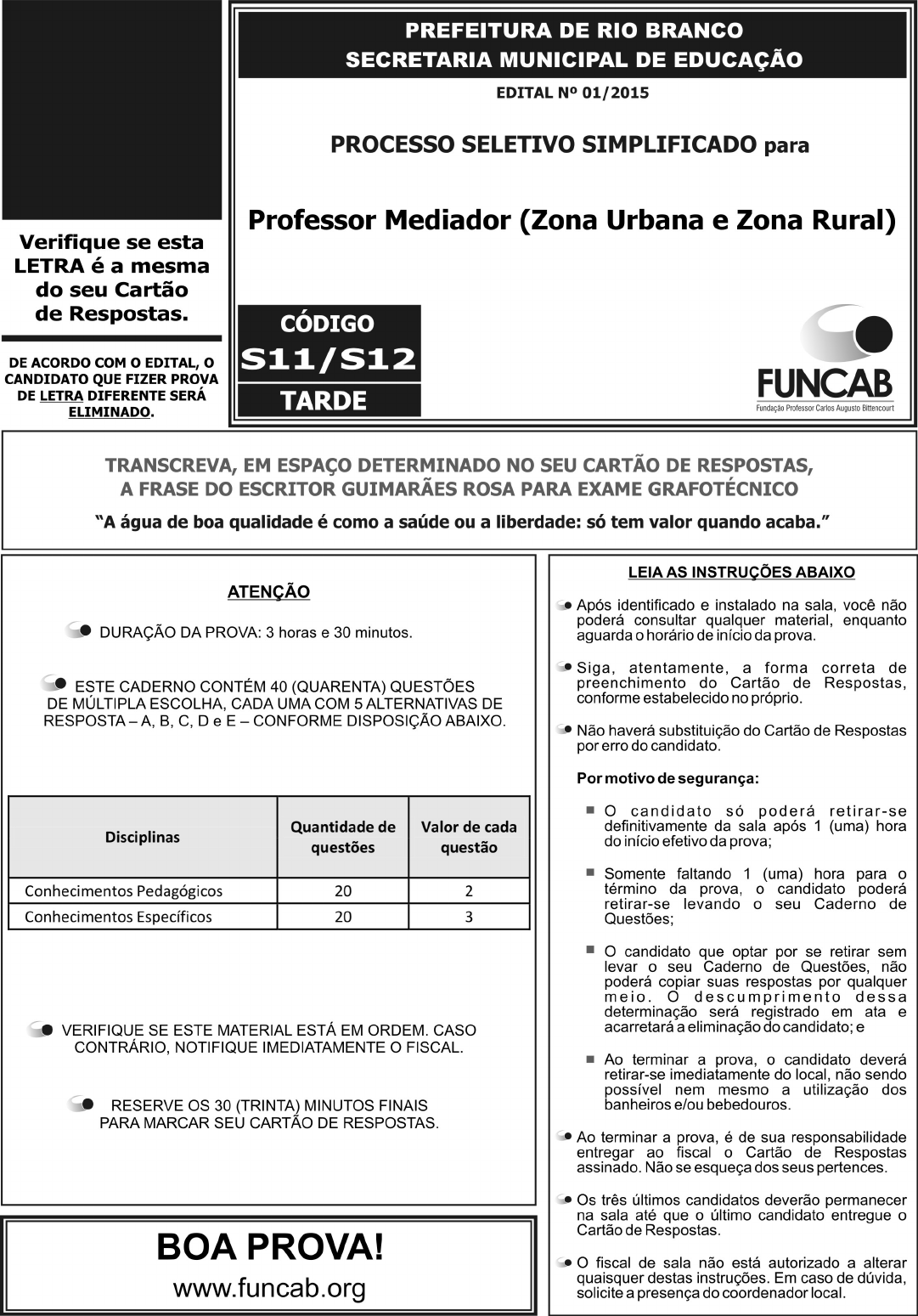 www.pciconcursos.com.br T www.pciconcursos.com.br 02 CONHECIMENTOS PEDAGÓGICOS Questão 01 A) B) C) D) E) Questão 02 A) B) C) D) E) Questão 03 A) B) C) D) E) Questão 04 A) B) C) D) E) www.pciconcursos.com.br 03 Questão 05 A) B) C) D) E) Questão 06 A) B) C) D) E) Questão 07 A) B) C) D) E) Questão 08 A) B) C) D) E) Questão 09 A) B) C) D) E) www.pciconcursos.com.br 04 Questão 10 A) B) C) D) E) Questão 11 A) B) C) D) E) Questão 12 A) B) C) D) E) Questão 13 A) B) C) D) E) www.pciconcursos.com.br 05 Questão 14 A) B) C) D) E) Questão 15 A) B) C) D) E) Questão 16 A) B) C) D) E) Questão 17 A) B) C) D) E) www.pciconcursos.com.br 06 Questão 18 A) B) C) D) E) Questão 19 A) B) C) D) E) Questão 20 A) B) C) D) E) CONHECIMENTOS ESPECÍFICOS Questão 21 A) B) C) D) E) www.pciconcursos.com.br 07 Questão 22 A) B) C) D) E) Questão 23 A) B) C) D) E) Questão 24 A) B) C) D) E) Questão 25 A) B) C) D) E) Questão 26 A) B) C) D) E) Questão 27 A) B) C) D) E) www.pciconcursos.com.br 08 Questão 28 A) B) C) D) E) Questão 29 A) B) C) D) E) Questão 30 A) B) C) D) E) Questão 31 A) B) C) D) E) Questão 32 A) B) C) D) E) Questão 33 A) B) C) D) E) www.pciconcursos.com.br 09 Questão 34 A) B) C) D) E) Questão 35 A) B) C) D) E) Questão 36 A) B) C) D) E) Questão 37 A) B) C) D) E) Questão 38 A) B) C) D) E) Questão 39 A) B) C) D) E) www.pciconcursos.com.br 10 Questão 40 A) B) C) D) E) www.pciconcursos.com.br [Tela 300 v1.0.0] GABARITO DA PROVA OBJETIVA- SECRETARIA MUNICIPAL DE EDUCAÇÃO DE RIO BRANCO - SEME Cargo: Tipo de Prova PROVA T LÍNGUA PORTUGUESA CONHECIMENTOS ESPECÍFICOS F01 - Merendeira - Zona Urbana 01 02 03 04 05 06 07 08 09 10 11 12 13 14 15 16 17 18 19 20 C E C C C C C C D C B C E C B C D D B A 21 22 23 24 25 26 27 28 29 30 31 32 33 34 35 36 37 38 39 40 E E A C A D C A C D C A C A D E B D A B GABARITO DA PROVA OBJETIVA- http://ww5.funcab.org/cargo_gabarito.asp?id=294&titulo=GABARIT... 1 de 1 18/02/2015 16:35 www.pciconcursos.com.br [Tela 300 v1.0.0] GABARITO DA PROVA OBJETIVA- SECRETARIA MUNICIPAL DE EDUCAÇÃO DE RIO BRANCO - SEME Cargo: Tipo de Prova PROVA T LÍNGUA PORTUGUESA CONHECIMENTOS ESPECÍFICOS F02 - Merendeira - Zona Rural 01 02 03 04 05 06 07 08 09 10 11 12 13 14 15 16 17 18 19 20 C E C C C C C C D C B C E C B C D D B A 21 22 23 24 25 26 27 28 29 30 31 32 33 34 35 36 37 38 39 40 E E A C A D C A C D C A C A D E B D A B GABARITO DA PROVA OBJETIVA- http://ww5.funcab.org/cargo_gabarito.asp?id=294&titulo=GABARIT... 1 de 1 18/02/2015 16:36 www.pciconcursos.com.br [Tela 300 v1.0.0] GABARITO DA PROVA OBJETIVA- SECRETARIA MUNICIPAL DE EDUCAÇÃO DE RIO BRANCO - SEME Cargo: Tipo de Prova PROVA T LÍNGUA PORTUGUESA ATUALIDADES CONHECIMENTOS PEDAGÓGICOS CONHECIMENTOS ESPECÍFICOS M01 - Atendente Pessoal - Zona Urbana 01 02 03 04 05 06 07 08 09 10 C B E B E B C D B A 11 12 13 14 15 C A D D D 16 17 18 19 20 21 22 23 24 25 A B E B D A B C E B 26 27 28 29 30 31 32 33 34 35 36 37 38 39 40 E D E C D C B C D B D B A C D GABARITO DA PROVA OBJETIVA- http://ww5.funcab.org/cargo_gabarito.asp?id=294&titulo=GABARIT... 1 de 1 18/02/2015 16:36 www.pciconcursos.com.br [Tela 300 v1.0.0] GABARITO DA PROVA OBJETIVA- SECRETARIA MUNICIPAL DE EDUCAÇÃO DE RIO BRANCO - SEME Cargo: Tipo de Prova PROVA T LÍNGUA PORTUGUESA ATUALIDADES CONHECIMENTOS PEDAGÓGICOS CONHECIMENTOS ESPECÍFICOS M02 - Atendente Pessoal - Zona Rural 01 02 03 04 05 06 07 08 09 10 C B E B E B C D B A 11 12 13 14 15 C A D D D 16 17 18 19 20 21 22 23 24 25 A B E B D A B C E B 26 27 28 29 30 31 32 33 34 35 36 37 38 39 40 E D E C D C B C D B D B A C D GABARITO DA PROVA OBJETIVA- http://ww5.funcab.org/cargo_gabarito.asp?id=294&titulo=GABARIT... 1 de 1 18/02/2015 16:36 www.pciconcursos.com.br [Tela 300 v1.0.0] GABARITO DA PROVA OBJETIVA- SECRETARIA MUNICIPAL DE EDUCAÇÃO DE RIO BRANCO - SEME Cargo: Tipo de Prova PROVA T LÍNGUA PORTUGUESA ATUALIDADES CONHECIMENTOS PEDAGÓGICOS CONHECIMENTOS ESPECÍFICOS M03 - Assistente Escolar - Zona Urbana 01 02 03 04 05 06 07 08 09 10 E E C E D D B C B D 11 12 13 14 15 D E B D C 16 17 18 19 20 21 22 23 24 25 E E B A C B E A B E 26 27 28 29 30 31 32 33 34 35 36 37 38 39 40 D B C B A B E B D A B E B C E GABARITO DA PROVA OBJETIVA- http://ww5.funcab.org/cargo_gabarito.asp?id=294&titulo=GABARIT... 1 de 1 18/02/2015 16:37 www.pciconcursos.com.br [Tela 300 v1.0.0] GABARITO DA PROVA OBJETIVA- SECRETARIA MUNICIPAL DE EDUCAÇÃO DE RIO BRANCO - SEME Cargo: Tipo de Prova PROVA T LÍNGUA PORTUGUESA ATUALIDADES CONHECIMENTOS PEDAGÓGICOS CONHECIMENTOS ESPECÍFICOS M04 - Assistente de creche - Zona Urbana 01 02 03 04 05 06 07 08 09 10 A A E D E D C E D D 11 12 13 14 15 A B A A B 16 17 18 19 20 21 22 23 24 25 A D E C B B B A B A 26 27 28 29 30 31 32 33 34 35 36 37 38 39 40 E D B B E C B D A B E A D D D GABARITO DA PROVA OBJETIVA- http://ww5.funcab.org/cargo_gabarito.asp?id=294&titulo=GABARIT... 1 de 1 18/02/2015 16:37 www.pciconcursos.com.br [Tela 300 v1.0.0] GABARITO DA PROVA OBJETIVA- SECRETARIA MUNICIPAL DE EDUCAÇÃO DE RIO BRANCO - SEME Cargo: Tipo de Prova PROVA T CONHECIMENTOS PEDAGÓGICOS CONHECIMENTOS ESPECÍFICOS S01 - Professor de Creche - Zona Urbana 01 02 03 04 05 06 07 08 09 10 11 12 13 14 15 16 17 18 19 20 B E B A C B D A D B B B C A D D D E C C 21 22 23 24 25 26 27 28 29 30 31 32 33 34 35 36 37 38 39 40 D C A E B E A C E A C C D D B D C A B D GABARITO DA PROVA OBJETIVA- http://ww5.funcab.org/cargo_gabarito.asp?id=294&titulo=GABARIT... 1 de 1 18/02/2015 16:37 www.pciconcursos.com.br [Tela 300 v1.0.0] GABARITO DA PROVA OBJETIVA- SECRETARIA MUNICIPAL DE EDUCAÇÃO DE RIO BRANCO - SEME Cargo: Tipo de Prova PROVA T CONHECIMENTOS PEDAGÓGICOS CONHECIMENTOS ESPECÍFICOS S02 - Professor de Pré-Escola - Zona Urbana 01 02 03 04 05 06 07 08 09 10 11 12 13 14 15 16 17 18 19 20 D C E D B B B B D A E E B A E E E C C E 21 22 23 24 25 26 27 28 29 30 31 32 33 34 35 36 37 38 39 40 D D C E D B D A A B C A B B B C B A E E GABARITO DA PROVA OBJETIVA- http://ww5.funcab.org/cargo_gabarito.asp?id=294&titulo=GABARIT