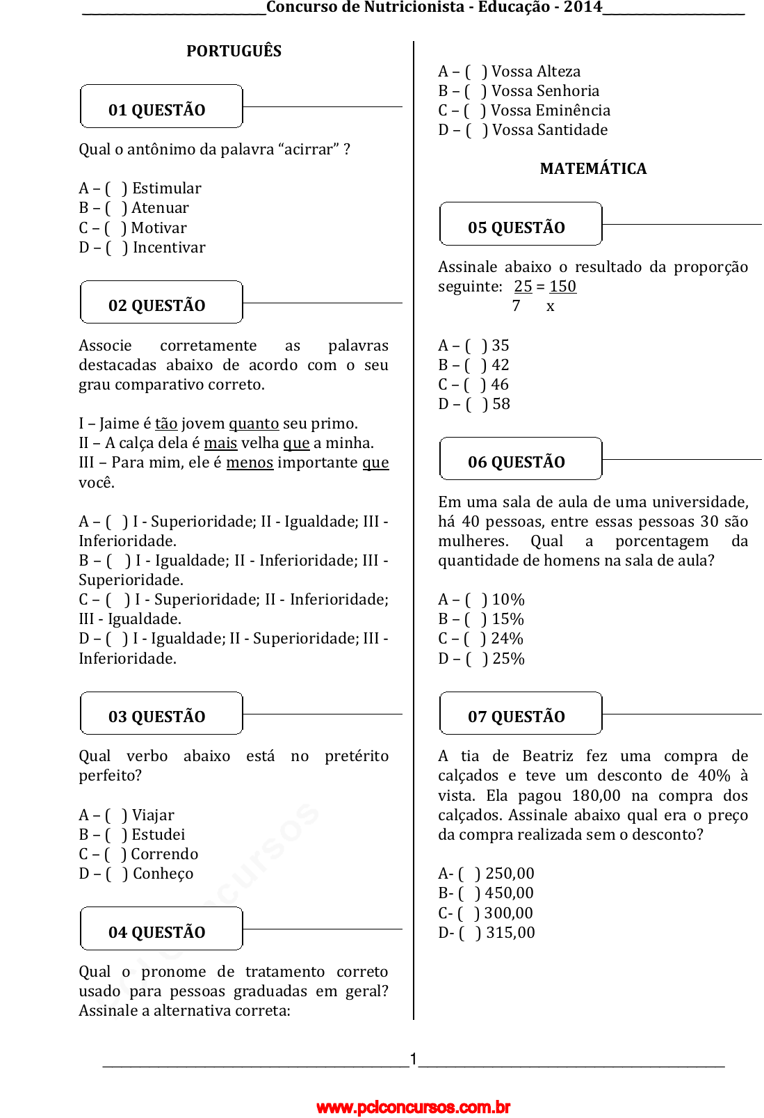 pcimarkpci MDAwMDowMDAwOjAwMDA6MDAwMDowMDAwOmZmZmY6MzZlOTpjMjU5:TW9uLCAxMyBTZXAgMjAyMSAxNzoxNToyMiAtMDMwMA== ______________________Concurso de Nutricionista - Educação - 2014_________________ _________________________________1_________________________________ PORTUGUÊS 01 QUESTÃO Qual o antônimo da palavra “acirrar” ? A – ( ) Estimular B – ( ) Atenuar C – ( ) Motivar D – ( ) Incentivar 02 QUESTÃO Associe corretamente as palavras destacadas abaixo de acordo com o seu grau comparativo correto. I – Jaime é tão jovem quanto seu primo. II – A calça dela é mais velha que a minha. III – Para mim, ele é menos importante que você. A – ( ) I - Superioridade; II - Igualdade; III - Inferioridade. B – ( ) I - Igualdade; II - Inferioridade; III - Superioridade. C – ( ) I - Superioridade; II - Inferioridade; III - Igualdade. D – ( ) I - Igualdade; II - Superioridade; III - Inferioridade. 03 QUESTÃO Qual verbo abaixo está no pretérito perfeito? A – ( ) Viajar B – ( ) Estudei C – ( ) Correndo D – ( ) Conheço 04 QUESTÃO Qual o pronome de tratamento correto usado para pessoas graduadas em geral? Assinale a alternativa correta: A – ( ) Vossa Alteza B – ( ) Vossa Senhoria C – ( ) Vossa Eminência D – ( ) Vossa Santidade MATEMÁTICA 05 QUESTÃO Assinale abaixo o resultado da proporção seguinte: 25 = 150 7 x A – ( ) 35 B – ( ) 42 C – ( ) 46 D – ( ) 58 06 QUESTÃO Em uma sala de aula de uma universidade, há 40 pessoas, entre essas pessoas 30 são mulheres. Qual a porcentagem da quantidade de homens na sala de aula? A – ( ) 10% B – ( ) 15% C – ( ) 24% D – ( ) 25% 07 QUESTÃO A tia de Beatriz fez uma compra de calçados e teve um desconto de 40% à vista. Ela pagou 180,00 na compra dos calçados. Assinale abaixo qual era o preço da compra realizada sem o desconto? A- ( ) 250,00 B- ( ) 450,00 C- ( ) 300,00 D- ( ) 315,00 www.pciconcursos.com.br pcimarkpci MDAwMDowMDAwOjAwMDA6MDAwMDowMDAwOmZmZmY6MzZlOTpjMjU5:TW9uLCAxMyBTZXAgMjAyMSAxNzoxNToyMiAtMDMwMA== ______________________Concurso de Nutricionista - Educação - 2014_________________ _________________________________2_________________________________ 08 QUESTÃO Qual a área em metros quadrados possui um lote urbano com 60 metros de frente e 60 metros de fundos? Assinale a alternativa correta: A- ( ) 3600 metros quadrados B- ( ) 3800 metros quadrados C- ( ) 4200 metros quadrados D- ( ) 5100 metros quadrados CONHECIMENTOS GERAIS 09 QUESTÃO Como se chamava o ex-premiê israelense que faleceu em janeiro de 2014, após 08 anos em coma? A - ( ) Yasser Arafat. B - ( ) Hassan Rohani. C - ( ) Ariel Sharon. D - ( ) Mahmoud Ahmadinejad. 10 QUESTÃO Recentemente, milhares de morcegos caíram do céu em um país da Oceania, por causa do calor. A Sociedade de Proteção dos Animais do país confirmou a morte de cerca de cem mil morcegos em decorrência da temperatura extrema na região. Qual o nome do país onde ocorreu esta situação? A - ( ) Nova Zelândia. B - ( ) Papua-Nova Guiné. C - ( ) Fiji. D - ( ) Austrália. 11 QUESTÃO Qual o ano de fundação do município de Alvorada do Sul? A – ( ) 1952. B – ( ) 1962. C – ( ) 1965. D – ( ) 1971. 12 QUESTÃO O município de Alvorada do Sul pertence a que microrregião? A – ( ) Astorga. B – ( ) Porecatu. C – ( ) Paranavaí. D – ( ) Apucarana. CONHECIMENTOS ESPECÍFICOS 13 QUESTÃO Distúrbios neurológicos, cicatrização demorada e diarréia são sintomas decorrentes de carência respectivamente de: A - ( ) Vitamina B1, vitamina C e vitamina B3. B - ( ) Vitamina B6, vitamina C e vitamina B5. C - ( ) Vitamina B6, vitamina C e vitamina B12. D - ( ) Vitamina B1, vitamina B6 e vitamina B12. 14 QUESTÃO Um dos tipos de avaliação nutricional e a avaliação subjetiva global que inclui, dentre outros, os seguintes itens: A -( ) Alteração na ingestão alimentar e avaliação bioquímica. B -( ) Capacidade funcional e alteração na ingestão alimentar. C -( ) Avaliação bioquímica e exame físico. D -( ) Exame físico e recordatório 24 horas. www.pciconcursos.com.br pcimarkpci MDAwMDowMDAwOjAwMDA6MDAwMDowMDAwOmZmZmY6MzZlOTpjMjU5:TW9uLCAxMyBTZXAgMjAyMSAxNzoxNToyMiAtMDMwMA== ______________________Concurso de Nutricionista - Educação - 2014_________________ _________________________________3_________________________________ 15 QUESTÃO Assinale a dieta preconizada para a paciente a seguir: mulher de 53 anos procurou assistência ambulatorial; foi atendida pelo medico e encaminhada ao nutricionista, referiu sensação de peso sobre o coração, sudorese e tonteira, em ausência de síncope. Apresenta historia pregressa de hipertensão arterial em uso irregular de medicação. Ao exame, foi constatado: PA: 130/85 mm Hg em decúbito FC: 110 bpm IMC: 28 Kg/m2 A-( ) Hipocalórica, normoproteica, hipolipídica, hipossódica moderada. B-( ) Normocalórica, normoproteica, normoglicídica, normolipídica e hipossódica severa. C-( ) Hipocalórica, hipoproteica, hipoglicídica, hipolipídica e hipossódica severa. D-( ) Hipocalórica, hiperproteica, hipolipídica, hipossódica severa. 16 QUESTÃO O marasmo é resultante da deficiência de: A - ( ) Proteína e caloria. B - ( ) Lipídios e glutamina. C - ( ) Lipídeos. D - ( ) Carboidratos. 17 QUESTÃO Uma das alterações fisiológicas observadas no idoso e: A - ( ) Hipercloridria progressiva. B - ( ) Xerostomia. C - ( ) Diarréia. D - ( ) Aumento do metabolismo. 18 QUESTÃO Promovem caráter acido na urina os seguintes alimentos: A- ( ) Peixe, laranja e cenoura. B - ( ) Tomate, limão e presunto. C - ( ) Queijo, ovo e carne. D - ( ) Queijo, melão e couve. 19 QUESTÃO A deficiência de lactase no indivíduo após consumo de leite, uma diarréia tipo: A - ( ) Secretória. B - ( ) Osmótica. C - ( ) Seletiva. D - ( ) Isotônica. 20 QUESTÃO Em relação ao aleitamento materno, o primeiro leite, o colostro, é rico em: A - ( ) Lipídios e sais minerais. B - ( ) Carboidratos e imunoglobulina. C - ( )