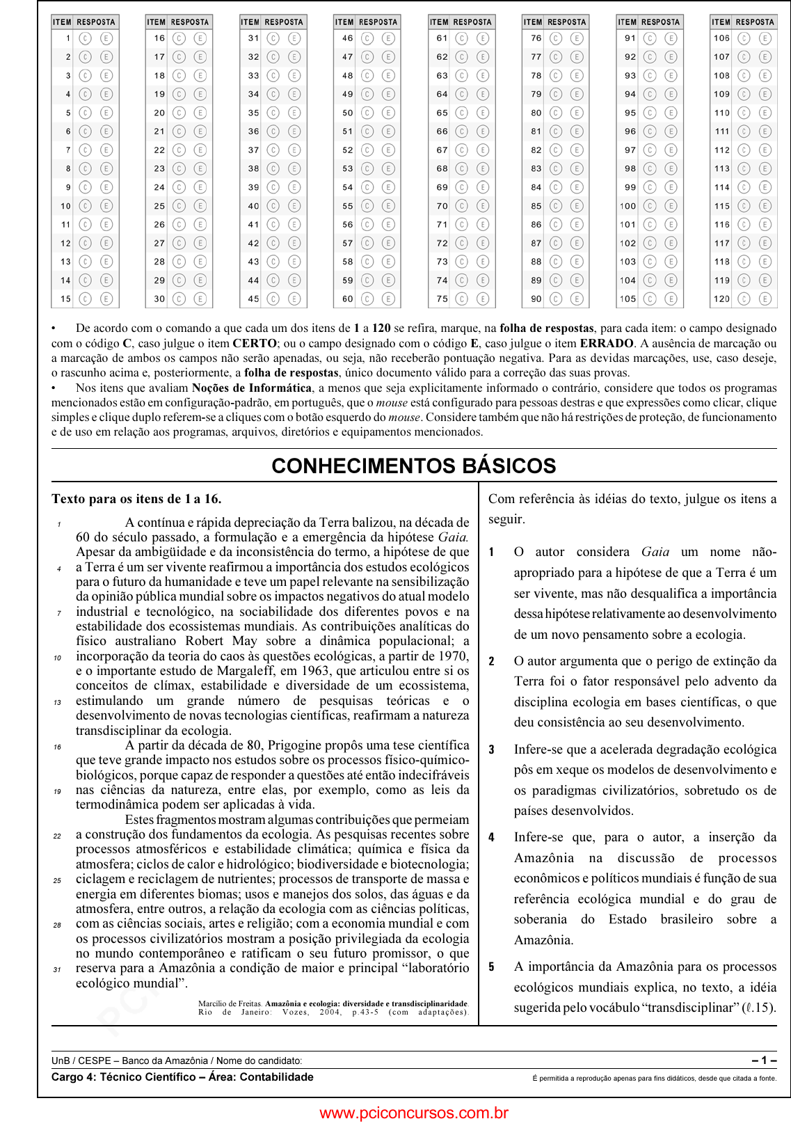 pcimarkpci MDAwMDowMDAwOjAwMDA6MDAwMDowMDAwOmZmZmY6MzZlOTpjMjU5:U2F0LCAxMSBTZXAgMjAyMSAwMjoxMjozMyAtMDMwMA== UnB / CESPE – Banco da Amazônia / Nome do candidato: – 1 – Cargo 4: Técnico Científico – Área: Contabilidade É permitida a reprodução apenas para fins didáticos, desde que citada a fonte. • De acordo com o comando a que cada um dos itens de 1 a 120 se refira, marque, na folha de respostas, para cada item: o campo designado com o código C, caso julgue o item CERTO; ou o campo designado com o código E, caso julgue o item ERRADO. A ausência de marcação ou a marcação de ambos os campos não serão apenadas, ou seja, não receberão pontuação negativa. Para as devidas marcações, use, caso deseje, o rascunho acima e, posteriormente, a folha de respostas, único documento válido para a correção das suas provas. • Nos itens que avaliam Noções de Informática, a menos que seja explicitamente informado o contrário, considere que todos os programas mencionados estão em configuração-padrão, em português, que o mouse está configurado para pessoas destras e que expressões como clicar, clique simples e clique duplo referem-se a cliques com o botão esquerdo do mouse. Considere também que não há restrições de proteção, de funcionamento e de uso em relação aos programas, arquivos, diretórios e equipamentos mencionados. CONHECIMENTOS BÁSICOS Texto para os itens de 1 a 16. A contínua e rápida depreciação da Terra balizou, na década de1 60 do século passado, a formulação e a emergência da hipótese Gaia. Apesar da ambigüidade e da inconsistência do termo, a hipótese de que a Terra é um ser vivente reafirmou a importância dos estudos ecológicos4 para o futuro da humanidade e teve um papel relevante na sensibilização da opinião pública mundial sobre os impactos negativos do atual modelo industrial e tecnológico, na sociabilidade dos diferentes povos e na7 estabilidade dos ecossistemas mundiais. As contribuições analíticas do físico australiano Robert May sobre a dinâmica populacional; a incorporação da teoria do caos às questões ecológicas, a partir de 1970,10 e o importante estudo de Margaleff, em 1963, que articulou entre si os conceitos de clímax, estabilidade e diversidade de um ecossistema, estimulando um grande número de pesquisas teóricas e o13 desenvolvimento de novas tecnologias científicas, reafirmam a natureza transdisciplinar da ecologia. A partir da década de 80, Prigogine propôs uma tese científica16 que teve grande impacto nos estudos sobre os processos físico-químico- biológicos, porque capaz de responder a questões até então indecifráveis nas ciências da natureza, entre elas, por exemplo, como as leis da19 termodinâmica podem ser aplicadas à vida. Estes fragmentos mostram algumas contribuições que permeiam a construção dos fundamentos da ecologia. As pesquisas recentes sobre22 processos atmosféricos e estabilidade climática; química e física da atmosfera; ciclos de calor e hidrológico; biodiversidade e biotecnologia; ciclagem e reciclagem de nutrientes; processos de transporte de massa e25 energia em diferentes biomas; usos e manejos dos solos, das águas e da atmosfera, entre outros, a relação da ecologia com as ciências políticas, com as ciências sociais, artes e religião; com a economia mundial e com28 os processos civilizatórios mostram a posição privilegiada da ecologia no mundo contemporâneo e ratificam o seu futuro promissor, o que reserva para a Amazônia a condição de maior e principal “laboratório31 ecológico mundial”. Marcílio de Freitas. Amazônia e ecologia: diversidade e transdisciplinaridade. Rio de Janeiro: Vozes, 2004, p.43-5 (com adaptações) . Com referência às idéias do texto, julgue os itens a seguir. � O autor considera Gaia um nome não- apropriado para a hipótese de que a Terra é um ser vivente, mas não desqualifica a importância dessa hipótese relativamente ao desenvolvimento de um novo pensamento sobre a ecologia. � O autor argumenta que o perigo de extinção da Terra foi o fator responsável pelo advento da disciplina ecologia em bases científicas, o que deu consistência ao seu desenvolvimento. � Infere-se que a acelerada degradação ecológica pôs em xeque os modelos de desenvolvimento e os paradigmas civilizatórios, sobretudo os de países desenvolvidos. � Infere-se que, para o autor, a inserção da Amazônia na discussão de processos econômicos e políticos mundiais é função de sua referência ecológica mundial e do grau de soberania do Estado brasileiro sobre a Amazônia. � A importância da Amazônia para os processos ecológicos mundiais explica, no texto, a idéia sugerida pelo vocábulo “transdisciplinar” (R.15). www.pciconcursos.com.br pcimarkpci MDAwMDowMDAwOjAwMDA6MDAwMDowMDAwOmZmZmY6MzZlOTpjMjU5:U2F0LCAxMSBTZXAgMjAyMSAwMjoxMjozMyAtMDMwMA== UnB / CESPE – Banco da Amazônia / Nome do candidato: – 2 – Cargo 4: Técnico Científico – Área: Contabilidade É permitida a reprodução apenas para fins didáticos, desde que citada a fonte. Julgue os itens subseqüentes, acerca de aspectos interpretativos e estruturais do texto. � No primeiro parágrafo do texto, há a comprovação da tese sobre a natureza transdisciplinar da ecologia, a partir de considerações sobre como compatibilizar a noção de sustentabilidade com a de crescimento econômico. � O desenvolvimento do texto exemplifica os diversos conceitos de ecologia a partir do conhecimento e da vivência do autor; no trecho de conclusão, o autor justifica as mudanças ocorridas quanto aos conceitos de ecologia a partir da ocorrida na mentalidade humana a respeito da finalidade dessa área. � De acordo com as idéias do texto, o seguinte trecho pode ser empregado, logo após o primeiro parágrafo, como parágrafo de desenvolvimento: Esta tese não é fruto de uma descoberta ou invenção. Tem sido reconhecida, gradualme