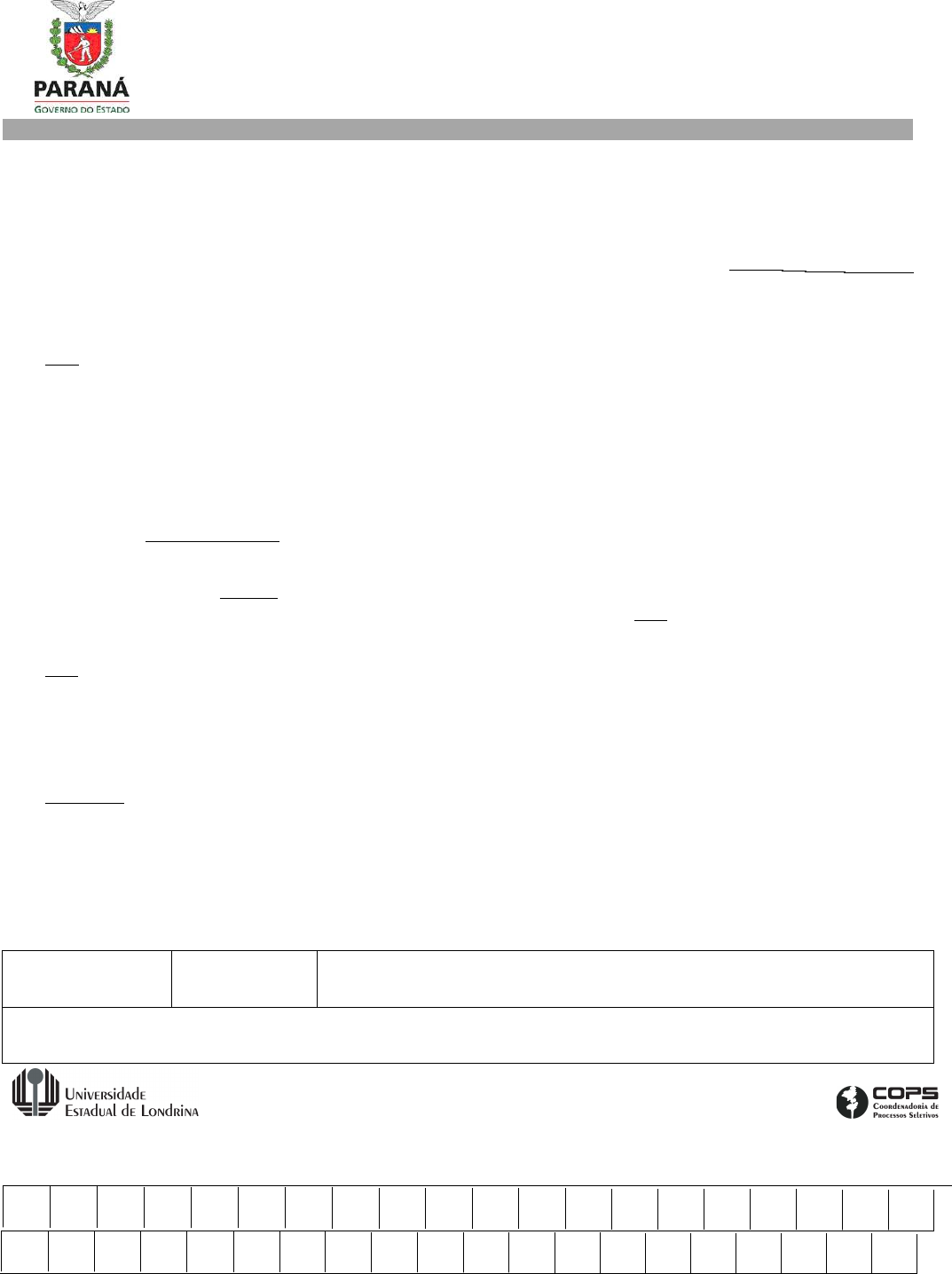 SECRETARIA DE ESTADO DA ADMINISTRAÇÃO E DA PREVIDÊNCIA CONCURSO PÚBLICO 15/06/2014 INSTRUÇÕES 1. Confira abaixo: seu nome, número de inscrição e cargo correspondente à sua inscrição. Assine no local indicado. 2. Verifique se os dados impressos no Cartão-Resposta correspondem aos seus. Em caso de irregularidade, comunique-a imediatamente ao Fiscal. 3. Não serão permitidos: empréstimos de materiais; consultas e comunicação entre os candidatos; uso de livros, apontamentos, relógios, aparelhos eletrônicos e, em especial, aparelhos celulares, os quais deverão ser desli- gados e colocados no saco plástico fornecido pelo Fiscal. O não cumprimento dessas exigências ocasionará a exclusão do candidato deste Concurso Público. 4. Aguarde o Fiscal autorizar a abertura do Caderno de Prova. Após a autorização, confira a paginação antes de iniciar a Prova. 5. Este Caderno de Prova contém 40 (quarenta) questões objetivas, cada qual com apenas 1 (uma) alternativa correta. No Cartão-Resposta, preencha, com tinta preta, o retângulo correspondente à alternativa que julgar correta para cada questão. 6. No Cartão-Resposta, anulam a questão: marcar mais de 1 (uma) alternativa em uma mesma questão; rasu- rar; preencher além dos limites do retângulo destinado a cada marcação. Não haverá substituição do Cartão- -Resposta por erro de preenchimento. 7. Não são permitidas perguntas ao Fiscal sobre as questões da prova. 8. A duração desta prova será de 4 (quatro) horas, já incluído o tempo para preenchimento do Cartão-Resposta. 9. Ao concluir a prova, permaneça em seu lugar e comunique ao Fiscal. 10. Aguarde autorização para devolver, em separado, o Caderno de Prova e o Cartão-Resposta, devidamente assinados. Transcreva abaixo as suas respostas, dobre na linha pontilhada e destaque cuidadosamente esta parte. . . . . . . . . . . . . . . . . . . . . . . . . . . . . . . . . . . . . . . . . . . . . . . . . . . . . . . . . . . . . . . . . . . . . . . . . . . . . . . . . . . . . . . . . . . . . . . . . . . . . . . . . . . . . . . . . . . . . . . . . . . . . . . . . . . . . RESPOSTAS 01 02 03 04 05 06 07 08 09 10 11 12 13 14 15 16 17 18 19 20 21 22 23 24 25 26 27 28 29 30 31 32 33 34 35 36 37 38 39 40 www.pciconcursos.com.br . . . . . . . . . . . . . . . . . . . . . . . . . . . . . . . . . . . . . . . . . . . . . . . . . . . . . . . . . . . . . . . . . . . . . . . . . . . . . . . . . . . . . . . . . . . . . . . . . . . . . . . . . . . . . . . . . . . . . . . O gabarito oficial provisório estará disponível no endereço eletrônico www.cops.uel.br a partir das 20 horas do dia 15 de junho de 2014. www.pciconcursos.com.br LÍNGUA PORTUGUESA Leia o texto a seguir e responda às questões de 1 a 3. O Brasil economizaria R$ 37,2 bilhões se atingisse uma redução de 50% nas perdas de distribuição de água até 2025, de acordo com levantamento da CNI (Confederação Nacional da Indústria). O valor é qua- tro vezes superior a todos os investimentos em saneamento básico realizados pelo país em 2011, que foi de R$ 8,9 bilhões, ainda segundo a pesquisa. Para atingir a economia apontada, a taxa de desperdício de água teria de cair dos atuais 37,4% para 18,7% – uma projeção “bastante otimista”, segundo o estudo. “O país desperdiça água porque não otimiza o serviço. A rede em muitos Estados é antiga”, explica Ilana Ferreira, analista de políticas públicas da Confederação. No Japão, país que é referência mundial em efi- ciência na distribuição do líquido, o desperdício não passa de 6%, de acordo com a CNI. “Reduzir perdas significa distribuição eficiente e menos custo no tratamento da água”, diz Ferreira. (Adaptado de: FRIAS, M. C. País pode poupar R$ 37,2 bi com redução em perda de água, diz CNI. Folha de S. Paulo. São Paulo. 27 abr. 2014. Mercado Aberto. B2.) 1 Sobre as informações apresentadas no texto, considere as afirmativas a seguir. I. A falta de serviço de distribuição de água eficiente também gera desperdício. II. A taxa ideal de desperdício de água é de 6%. III. Investimentos em saneamento básico tiveram um aumento de R$ 8,9 bilhões. IV. Um dos desafios a ser vencido no Brasil é o desperdício de água. Assinale a alternativa correta. a) Somente as afirmativas I e II são corretas. b) Somente as afirmativas I e IV são corretas. c) Somente as afirmativas III e IV são corretas. d) Somente as afirmativas I, II e III são corretas. e) Somente as afirmativas II, III e IV são corretas. 2 De acordo com o texto, assinale a alternativa correta. a) 37,4% da população brasileira desperdiçam água. b) Em 2025, o Brasil terá 50% de redução na taxa de desperdício, segundo a CNI. c) O Brasil pouparia R$ 29,93 bilhões se reduzisse as perdas em até 25%. d) A taxa de desperdício precisa passar a 6% para o Brasil poupar R$ 37,27 bilhões. e) A taxa atual de desperdício de água é a mesma de 2009, ou seja, 37,4%. 1 / 14 www.pciconcursos.com.br 3 Acerca dos recursos linguístico-semânticos presentes no texto, atribua V (verdadeiro) ou F (falso) às afir- mativas a seguir. ( ) Em “O Brasil economizaria R$ 37,2 bilhões se atingisse uma redução de 50%”, o termo sublinhado indica condição. ( ) No trecho “Para atingir a economia apontada”, o termo sublinhado indica finalidade. ( ) No fragmento “O país desperdiça água porque não otimiza o serviço”, o termo sublinhado tem sentido conclusivo. ( ) Nos trechos “desperdiça água” e “distribuição do líquido”, os termos sublinhados são sinônimos. ( ) Em “Reduzir perdas significa distribuição eficiente”, a palavra sublinhada está escrita em desacordo com a norma padrão. Assinale a alternativa que contém, de cima para baixo, a sequência correta. a) V, V, F, V, F. b) V, F, V, F, F. c) V, F, F, V, V. d) F, V, V, F, V. e) F, F, F, V, V. Leia o texto a seguir e responda às questões de 4 a 8. Se você come um hambúrguer, con