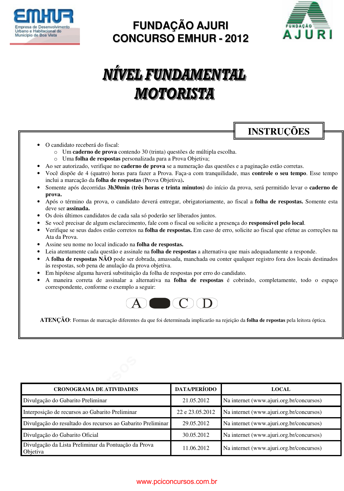 pcimarkpci MDAwMDowMDAwOjAwMDA6MDAwMDowMDAwOmZmZmY6MzZlOTpjMjU5:VHVlLCAxNCBTZXAgMjAyMSAyMzo1MjoxMSAtMDMwMA== CRONOGRAMA DE ATIVIDADES DATA/PERÍODO LOCAL Divulgação do Gabarito Preliminar 21.05.2012 Na internet (www.ajuri.org.br/concursos) Interposição de recursos ao Gabarito Preliminar 22 e 23.05.2012 Na internet (www.ajuri.org.br/concursos) Divulgação do resultado dos recursos ao Gabarito Preliminar 29.05.2012 Na internet (www.ajuri.org.br/concursos) Divulgação do Gabarito Oficial 30.05.2012 Na internet (www.ajuri.org.br/concursos) Divulgação da Lista Preliminar da Pontuação da Prova Objetiva 11.06.2012 Na internet (www.ajuri.org.br/concursos) FFUUNNDDAAÇÇÃÃOO AAJJUURRII CCOONNCCUURRSSOO EEMMHHUURR -- 22001122 • O candidato receberá do fiscal: o Um caderno de prova contendo 30 (trinta) questões de múltipla escolha. o Uma folha de respostas personalizada para a Prova Objetiva; • Ao ser autorizado, verifique no caderno de prova se a numeração das questões e a paginação estão corretas. • Você dispõe de 4 (quatro) horas para fazer a Prova. Faça-a com tranquilidade, mas controle o seu tempo. Esse tempo inclui a marcação da folha de respostas (Prova Objetiva). • Somente após decorridas 3h30min (três horas e trinta minutos) do início da prova, será permitido levar o caderno de prova. • Após o término da prova, o candidato deverá entregar, obrigatoriamente, ao fiscal a folha de respostas. Somente esta deve ser assinada. • Os dois últimos candidatos de cada sala só poderão ser liberados juntos. • Se você precisar de algum esclarecimento, fale com o fiscal ou solicite a presença do responsável pelo local. • Verifique se seus dados estão corretos na folha de respostas. Em caso de erro, solicite ao fiscal que efetue as correções na Ata da Prova. • Assine seu nome no local indicado na folha de respostas. • Leia atentamente cada questão e assinale na folha de respostas a alternativa que mais adequadamente a responde. • A folha de respostas NÃO pode ser dobrada, amassada, manchada ou conter qualquer registro fora dos locais destinados às respostas, sob pena de anulação da prova objetiva. • Em hipótese alguma haverá substituição da folha de respostas por erro do candidato. • A maneira correta de assinalar a alternativa na folha de respostas é cobrindo, completamente, todo o espaço correspondente, conforme o exemplo a seguir: ATENÇÃO: Formas de marcação diferentes da que foi determinada implicarão na rejeição da folha de repostas pela leitora óptica. INSTRUÇÕES www.pciconcursos.com.br pcimarkpci MDAwMDowMDAwOjAwMDA6MDAwMDowMDAwOmZmZmY6MzZlOTpjMjU5:VHVlLCAxNCBTZXAgMjAyMSAyMzo1MjoxMSAtMDMwMA== EMHUR – 2012 Página 1 Conhecimentos Gerais Questões: 1 a 10 Canção do Exílio – Gonçalves Dias Minha terra tem palmeiras, Onde canta o Sabiá; As aves que aqui gorjeiam, Não gorjeiam como lá. Nosso céu tem mais estrelas, Nossas várzeas têm mais flores, Nossos bosques têm mais vida, Nossa vida mais amores. Em cismar, sozinho, à noite. Mais prazer encontro eu lá; Minha terra tem palmeiras. Onde canta o Sabiá. Minha terra tem primores, Que tais não encontro eu cá; Em cismar – sozinho, à noite – Mais prazer encontro eu lá; Minha terra tem palmeiras, Onde canta o Sabiá. Não permita Deus que eu morra, Sem que eu volte para lá; Sem que desfrute os primores Que não encontro por cá; Sem qu' inda aviste as palmeiras. Onde canta o Sabiá. 1. Na poesia “Canção do Exílio”, prevalece o sentimento de: ( a ) enaltecimento; ( b ) tristeza; ( c ) arrependimento; ( d ) revolta. 2. Em relação à poesia, é incorreto afirmar que o autor: ( a ) solicita a Deus que possa ver sua Terra Natal antes de morrer; ( b ) faz uma exaltação à natureza, ao usar as palavras: “palmeiras, Sabiá, aves, céu, estrelas, várzeas e bosques”; ( c ) faz uma referência à degradação do meio ambiente, especificamente, no verso: “Sem qu’inda aviste as palmeiras”; ( d ) expressa o sentimento de saudade de sua pátria, uma vez que se encontra exilado. 3. Na frase: “prefiro ser essa metamorfose ambulante” - Raul Seixas. A palavra sublinhada equivale à: ( a ) transformação; ( b ) perfeição; ( c ) imaginação; ( d ) confusão. 4. Bendizer e maldizer são palavras antônimas. Assinale a opção cujas palavras também são antônimas: ( a ) progredir / avançar; ( b ) explícito / inativo; ( c ) esperar / desesperar; ( d ) simpático / gentil. 5. Dentre as alternativas abaixo, assinale aquela em que apresenta erro de concordância: ( a ) Os melões e as tangerinas maduros já foram colhidos. ( b ) O motorista e o cobrador fazem suas atividades conforme o Regimento Interno. ( c ) Abriu a janela e fechou-a de imediato. ( d ) Fazem duas semanas que encerraram as inscrições para o Concurso 2012. 6. Assinale a alternativa cujas palavras estão todas escritas corretamente: ( a ) Encharcar / machichi / praxe / enchada / feixe; ( b ) Chingar / xampu / fênix / xuxu / xocar; ( c ) Extenção / extranho / atravéz / expoente / extreito; ( d ) Estrangeiro / prodígio / pajem / matizar / vexame. 7. Complete as frases com um dos termos entre parênteses e assinale a alternativa que www.pciconcursos.com.br pcimarkpci MDAwMDowMDAwOjAwMDA6MDAwMDowMDAwOmZmZmY6MzZlOTpjMjU5:VHVlLCAxNCBTZXAgMjAyMSAyMzo1MjoxMSAtMDMwMA== EMHUR – 2012 Página 2 corresponde à sequência correta quanto à regência. Tenho amor _____ Deus. ( a, à, por ) Prefiro pera _____ maçã. (do que, a, à) O médico assistiu ______ jogo.(ao, o, por) ( a ) a, à, ao; ( b ) à, a, o; ( c ) por, do que, ao; ( d ) a, do que, ao. 8. “Atualmente, o processo de canalização dos igarapés de Boa Vista é considerado uma das intervenções do homem de maior agressão”. (Folha de Boa Vista, de 23 de março de 2011, http://direitoamazonico.blospot.com.br/2011/03/ambiental-bv- igarapes.html). Analise as seguintes proposições: I. A canalização dos igarapés ret