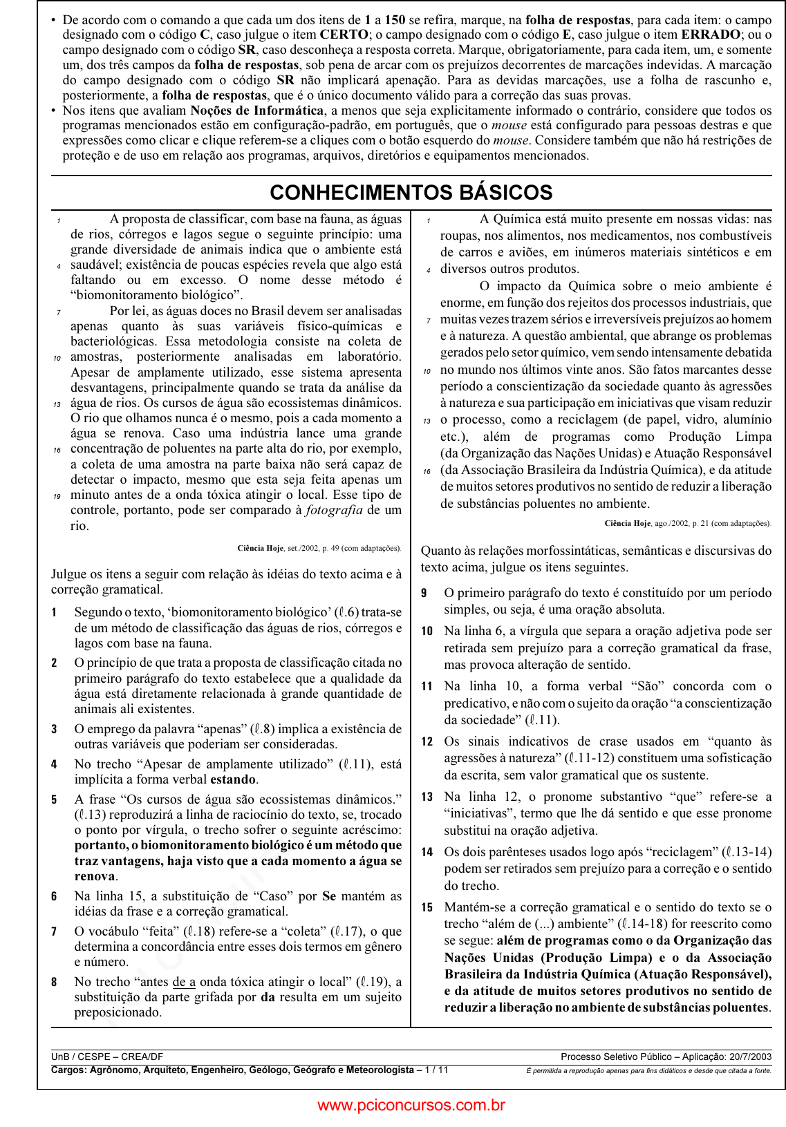 pcimarkpci MDAwMDowMDAwOjAwMDA6MDAwMDowMDAwOmZmZmY6MzZlOTpjMjU5:V2VkLCAxNSBTZXAgMjAyMSAwNTo1OToyMCAtMDMwMA== UnB / CESPE – CREA/DF Processo Seletivo Público – Aplicação: 20/7/2003 Cargos: Agrônomo, Arquiteto, Engenheiro, Geólogo, Geógrafo e Meteorologista – 1 / 11 É permitida a reprodução apenas para fins didáticos e desde que citada a fonte. • De acordo com o comando a que cada um dos itens de 1 a 150 se refira, marque, na folha de respostas, para cada item: o campo designado com o código C, caso julgue o item CERTO; o campo designado com o código E, caso julgue o item ERRADO; ou o campo designado com o código SR, caso desconheça a resposta correta. Marque, obrigatoriamente, para cada item, um, e somente um, dos três campos da folha de respostas, sob pena de arcar com os prejuízos decorrentes de marcações indevidas. A marcação do campo designado com o código SR não implicará apenação. Para as devidas marcações, use a folha de rascunho e, posteriormente, a folha de respostas, que é o único documento válido para a correção das suas provas. • Nos itens que avaliam Noções de Informática, a menos que seja explicitamente informado o contrário, considere que todos os programas mencionados estão em configuração-padrão, em português, que o mouse está configurado para pessoas destras e que expressões como clicar e clique referem-se a cliques com o botão esquerdo do mouse. Considere também que não há restrições de proteção e de uso em relação aos programas, arquivos, diretórios e equipamentos mencionados. CONHECIMENTOS BÁSICOS A proposta de classificar, com base na fauna, as águas1 de rios, córregos e lagos segue o seguinte princípio: uma grande diversidade de animais indica que o ambiente está saudável; existência de poucas espécies revela que algo está4 faltando ou em excesso. O nome desse método é “biomonitoramento biológico”. Por lei, as águas doces no Brasil devem ser analisadas7 apenas quanto às suas variáveis físico-químicas e bacteriológicas. Essa metodologia consiste na coleta de amostras, posteriormente analisadas em laboratório.10 Apesar de amplamente utilizado, esse sistema apresenta desvantagens, principalmente quando se trata da análise da água de rios. Os cursos de água são ecossistemas dinâmicos.13 O rio que olhamos nunca é o mesmo, pois a cada momento a água se renova. Caso uma indústria lance uma grande concentração de poluentes na parte alta do rio, por exemplo,16 a coleta de uma amostra na parte baixa não será capaz de detectar o impacto, mesmo que esta seja feita apenas um minuto antes de a onda tóxica atingir o local. Esse tipo de19 controle, portanto, pode ser comparado à fotografia de um rio. Ciência Hoje, set./2002, p. 49 (com adaptações). Julgue os itens a seguir com relação às idéias do texto acima e à correção gramatical. � Segundo o texto, ‘biomonitoramento biológico’ (R.6) trata-se de um método de classificação das águas de rios, córregos e lagos com base na fauna. � O princípio de que trata a proposta de classificação citada no primeiro parágrafo do texto estabelece que a qualidade da água está diretamente relacionada à grande quantidade de animais ali existentes. � O emprego da palavra “apenas” (R.8) implica a existência de outras variáveis que poderiam ser consideradas. � No trecho “Apesar de amplamente utilizado” (R.11), está implícita a forma verbal estando. � A frase “Os cursos de água são ecossistemas dinâmicos.” (R.13) reproduzirá a linha de raciocínio do texto, se, trocado o ponto por vírgula, o trecho sofrer o seguinte acréscimo: portanto, o biomonitoramento biológico é um método que traz vantagens, haja visto que a cada momento a água se renova. � Na linha 15, a substituição de “Caso” por Se mantém as idéias da frase e a correção gramatical. � O vocábulo “feita” (R.18) refere-se a “coleta” (R.17), o que determina a concordância entre esses dois termos em gênero e número. � No trecho “antes de a onda tóxica atingir o local” (R.19), a substituição da parte grifada por da resulta em um sujeito preposicionado. A Química está muito presente em nossas vidas: nas1 roupas, nos alimentos, nos medicamentos, nos combustíveis de carros e aviões, em inúmeros materiais sintéticos e em diversos outros produtos. 4 O impacto da Química sobre o meio ambiente é enorme, em função dos rejeitos dos processos industriais, que muitas vezes trazem sérios e irreversíveis prejuízos ao homem7 e à natureza. A questão ambiental, que abrange os problemas gerados pelo setor químico, vem sendo intensamente debatida no mundo nos últimos vinte anos. São fatos marcantes desse10 período a conscientização da sociedade quanto às agressões à natureza e sua participação em iniciativas que visam reduzir o processo, como a reciclagem (de papel, vidro, alumínio13 etc.), além de programas como Produção Limpa (da Organização das Nações Unidas) e Atuação Responsável (da Associação Brasileira da Indústria Química), e da atitude16 de muitos setores produtivos no sentido de reduzir a liberação de substâncias poluentes no ambiente. Ciência Hoje, ago./2002, p. 21 (com adaptações). Quanto às relações morfossintáticas, semânticas e discursivas do texto acima, julgue os itens seguintes. O primeiro parágrafo do texto é constituído por um período simples, ou seja, é uma oração absoluta. � Na linha 6, a vírgula que separa a oração adjetiva pode ser retirada sem prejuízo para a correção gramatical da frase, mas provoca alteração de sentido. �� Na linha 10, a forma verbal “São” concorda com o predicativo, e não com o sujeito da oração “a conscientização da sociedade” (R.11). �� Os sinais indicativos de crase usados em “quanto às agressões à natureza” (R.11-12) constituem uma sofisticação da escrita, sem valor gramatical q