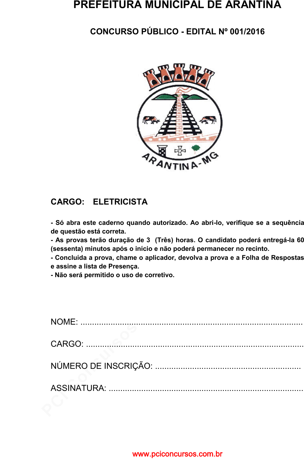 pcimarkpci MDAwMDowMDAwOjAwMDA6MDAwMDowMDAwOmZmZmY6MzZlOTpjMjU5:V2VkLCAxNSBTZXAgMjAyMSAwOTozMToxNSAtMDMwMA== PREFEITURA MUNICIPAL DE ARANTINA CONCURSO PÚBLICO - EDITAL Nº 001/2016 CARGO: ELETRICISTA - Só abra este caderno quando autorizado. Ao abri-lo, verifique se a sequência de questão está correta. - As provas terão duração de 3 (Três) horas. O candidato poderá entregá-la 60 (sessenta) minutos após o início e não poderá permanecer no recinto. - Concluída a prova, chame o aplicador, devolva a prova e a Folha de Respostas e assine a lista de Presença. - Não será permitido o uso de corretivo. NOME: ................................................................................................ CARGO: .............................................................................................. NÚMERO DE INSCRIÇÃO: ............................................................... ASSINATURA: .................................................................................... www.pciconcursos.com.br pcimarkpci MDAwMDowMDAwOjAwMDA6MDAwMDowMDAwOmZmZmY6MzZlOTpjMjU5:V2VkLCAxNSBTZXAgMjAyMSAwOTozMToxNSAtMDMwMA== 2 PROVA ESPECÍFICA – ELETRICISTA 1. Considerando os seus conhecimentos. I. Tensão elétrica é a força que impulsiona ou movimenta os elétrons. II. Corrente elétrica é o movimento ordenado dos elétrons em uma unidade de tempo. III. Resistência elétrica é a dificuldade oferecida por um material a passagem da corrente elétrica. IV. Resistor ou resistência é um componente elétrico que tem por finalidade limitar o valor da corrente elétrica. Marque a alternativa CORRETA: A I,II e IV estão corretas B II,III e IV estão corretas C I,III e IV estão corretas D I,II,III e IV estão corretas 2. Considerando os instrumentos de medidas - Toda grandeza pode ser medida. Numere a segunda coluna de acordo com a primeira: 1ª COLUNA 2ª COLUNA Grandeza elétrica Instrumento de Medida 1 Tesão elétrica Amperímetro 2 Corrente elétrica Ohmímetro 3 Resistência elétrica Voltímetro Marque a alternativa CORRETA: A 2, 3 e 1 B 1, 3 e 2 C 2, 3 e 1 D 3, 2 e 1 www.pciconcursos.com.br pcimarkpci MDAwMDowMDAwOjAwMDA6MDAwMDowMDAwOmZmZmY6MzZlOTpjMjU5:V2VkLCAxNSBTZXAgMjAyMSAwOTozMToxNSAtMDMwMA== 3 3. A intensidade da corrente elétrica é diretamente proporcional à variação da tensão elétrica e inversamente proporcional à resistência elétrica. A afirmativa acima refere-se: A) A definição de eletricidade monofásica B) A definição de eletricidade bifásica C) A definição de eletricidade trifásica D) A Lei de Ohm 4. Considerando os componentes de um circuito elétrico. Numere a segunda coluna de acordo com a primeira. 1ª COLUNA 2ª COLUNA 1 É responsável por gerar e fornecer tensão elétrica ao circuito. Consumidor de carga 2 Elemento responsável em conduzir a corrente elétrica pelo circuito. Dispositivo de manobra 3 Pode ser um interruptor, chave, seccionador ou outro componente que tenha por finalidade abrir e fechar o circuito, comandando-o. Fonte 4 Elemento responsável em transformar energia elétrica em outro tipo de energia (calor, luz, movimento, etc.). Exemplos: lâmpadas, chuveiros, motores elétricos, computadores, etc. Condutor Marque a alternativa CORRETA: A 3, 4, 1 e 2 B 2, 1, 3 e 4 C 4, 3, 1 e 2 D 2, 1, 4 e 3 www.pciconcursos.com.br pcimarkpci MDAwMDowMDAwOjAwMDA6MDAwMDowMDAwOmZmZmY6MzZlOTpjMjU5:V2VkLCAxNSBTZXAgMjAyMSAwOTozMToxNSAtMDMwMA== 4 5. De acordo com os seus conhecimentos sobre os tipos de Circuitos, numere a segunda coluna de acordo com a primeira: 1ª COLUNA 2ª COLUNA 1 Circuito Série É aquele em que cada carga tem seu próprio caminho para a passagem da corrente elétrica. Nele, a entrada e a saída de cada carga estão ligadas diretamente à fonte sem passar por nenhuma outra. 2 Circuito Paralelo É aquele em que a corrente tem apenas um caminho para percorrer. A saída de um componente está lida à entrada do componente seguinte e assim sucessivamente. 3 Circuito Misto É aquele que apresenta as características dos dois circuitos. Possui uma parte ligada em série e outra em paralelo. Marque a alternativa CORRETA: A 3, 1 e 2 B 1, 3 e 2 C 2, 3 e 1 D 3, 2 e 1 6. Segundo a Norma Brasileira, as tensões são classificadas em quatro níveis (Baixa Tensão, Média Tensão, Alta Tensão e Extra-Alta Tensão). Em qual nível de tensão está acima de 1.000V até 72.500V? A) Baixa Tensão B) Média Tensão C) Alta Tensão D) Extra-Alta Tensão 7. O número de condutores a considerar num circuito é de condutores efetivamente percorridos por corrente. Marque a alternativa INCORRETA: A) Circuito monofásico a 2 condutores = 2 condutores carregados Circuito monofásico a 3 condutores = 3 condutores carregados www.pciconcursos.com.br pcimarkpci MDAwMDowMDAwOjAwMDA6MDAwMDowMDAwOmZmZmY6MzZlOTpjMjU5:V2VkLCAxNSBTZXAgMjAyMSAwOTozMToxNSAtMDMwMA== 5 B) Circuito bifásico a 2 condutores = 2 condutores carregados Circuito bifásico a 3 condutores = 3 condutores carregados C) Circuito trifásico sem neutro = 3 condutores carregados D) Circuito trifásico com neutro = 5 condutores carregados 8. Marque V para Verdadeiro e F para Falso. I. Energia alternada quer dizer que ela periodicamente tem um valor máximo positivo e máximo negativo ( ). II. Os Valores de tensão 127 e 220 V são padronizados pela ANEEL – Agencia Nacional de Energia Elétrica ( ). III. A chegada de energia vem por uma derivação da fiação da concessionária e é fixada num poste. O poste pode ser de concreto ou metálico e obedece o padrão da concessionária ( ). IV. Nos Quadros de Distribuição instalam-se: Dispositivo geral de manobra e proteção (chave geral), podendo ser disjuntor ou seccionadora com fusível. Dispositivos de proteção (fusíveis e disjuntores) ( ). Marque a resposta que está na ordem CORRETA: A) V, V, F, V. B) F, F, V, V. C) V, V, V, V. D) V, F, V, F. 9. De acordo com os seus conhecimentos sobre Condutores e, considerando as situações mais com