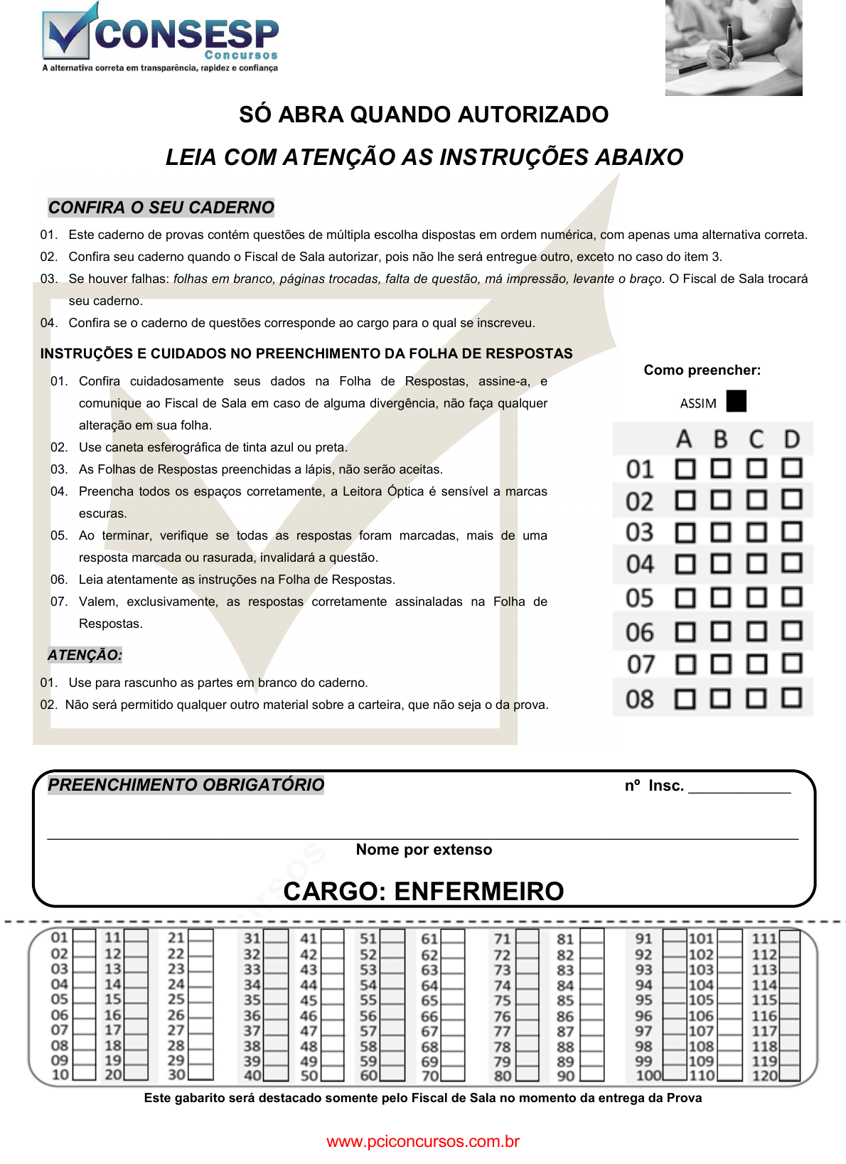 pcimarkpci MDAwMDowMDAwOjAwMDA6MDAwMDowMDAwOmZmZmY6MzZlOTpjMjU5:V2VkLCAxNSBTZXAgMjAyMSAxMTo1OTo0OSAtMDMwMA== SÓ ABRA QUANDO AUTORIZADO LEIA COM ATENÇÃO AS INSTRUÇÕES ABAIXO CONFIRA O SEU CADERNO 01. Este caderno de provas contém questões de múltipla escolha dispostas em ordem numérica, com apenas uma alternativa correta. 02. Confira seu caderno quando o Fiscal de Sala autorizar, pois não lhe será entregue outro, exceto no caso do item 3. 03. Se houver falhas: folhas em branco, páginas trocadas, falta de questão, má impressão, levante o braço. O Fiscal de Sala trocará seu caderno. 04. Confira se o caderno de questões corresponde ao cargo para o qual se inscreveu. INSTRUÇÕES E CUIDADOS NO PREENCHIMENTO DA FOLHA DE RESPOSTAS Como preench er: ATENÇÃO: 01. Use para rascunho as partes em branco do caderno. 02. Não será permitido qualquer outro material sobre a carteira, que não seja o da prova. PREENCHIMENTO OBRIGATÓRIO nº Insc. _____________ _______________________________________________________________________________________________ Nome por extenso CARGO: ENFERMEIRO Este gabarito será destacado somente pelo Fiscal de Sala no momento da entrega da Prova 01. Confira cuidadosamente seus dados na Folha de Respostas, assine-a, e comunique ao Fiscal de Sala em caso de alguma divergência, não faça qualquer alteração em sua folha. 02. Use caneta esferográfica de tinta azul ou preta. 03. As Folhas de Respostas preenchidas a lápis, não serão aceitas. 04. Preencha todos os espaços corretamente, a Leitora Óptica é sensível a marcas escuras. 05. Ao terminar, verifique se todas as respostas foram marcadas, mais de uma resposta marcada ou rasurada, invalidará a questão. 06. Leia atentamente as instruções na Folha de Respostas. 07. Valem, exclusivamente, as respostas corretamente assinaladas na Folha de Respostas. www.pciconcursos.com.br pcimarkpci MDAwMDowMDAwOjAwMDA6MDAwMDowMDAwOmZmZmY6MzZlOTpjMjU5:V2VkLCAxNSBTZXAgMjAyMSAxMTo1OTo0OSAtMDMwMA== www.pciconcursos.com.br pcimarkpci MDAwMDowMDAwOjAwMDA6MDAwMDowMDAwOmZmZmY6MzZlOTpjMjU5:V2VkLCAxNSBTZXAgMjAyMSAxMTo1OTo0OSAtMDMwMA== ENFERMEIRO CONHECIMENTOS ESPECÍFICOS 01. O SINAN (Sistema Nacional de Agravos de Notificação) é o Sistema de Informação utilizado pelo Ministério da Saúde no armazenamento e processamento de dados referentes às doenças de Notificação Compulsória. Das doenças descritas abaixo, assinale a alternativa das que devem ser notificadas. (A) Cólera, Tuberculose, Hanseníase, Dengue, Febre Amarela. (B) Varíola, Coqueluche, Febre Maculosa, Caxumba, Aids. (C) Hantavirose, Hepatite A, B e C, Malária, Meningite. (D) Doença de Chagas, Esquistossomose, Caxumba, Hepatite A e C. 02. Notificação é a comunicação da ocorrência de determinada doença ou agravo à saúde, feito à autoridade sanitária por profissional da saúde ou qualquer cidadão, para fim de adoção de medidas de intervenção pertinentes. Deve ser notificada a simples suspeita de qualquer doença de Notificação Compulsória, com exceção de algumas que são notificadas somente quando confirmado diagnóstico. Que são elas: (A) AIDS, Leishmaniose, Febre Maculosa, Tuberculose e Peste. (B) AIDS, Esquistossomose, Hanseníase, Tracoma, Tuberculose. (C) Hanseníase, Leptospirose, Peste, Dengue, Cólera. (D) Esquistossomose, Hanseníase, AIDS, Hantavírus, Malária. 03. Em relação à Hanseníase, assinale a alternativa correta. (A) Período de incubação da hanseníase é em média de 02 a 07 meses, podendo ser mais curto ou mais longo. (B) O homem é tido como única fonte de infecção, embora tenham sido encontrados animais naturalmente infectados. (C) A bactéria Mycobacterium leprae é mais facilmente eliminada pela lesão e comumente adquirida pelo contato com outra pessoa. (D) Todas as alternativas estão incorretas. 04. É toda e qualquer substância estranha ao organismo e que provoca no mesmo a formação de anticorpos: (A) Imunidade (B) Toxinas (C) Anticorpos (D) Antígeno 05. Fato vivo ou inanimado, cuja presença ou ausência é indispensável ao início de um processo mórbido: (A) Hospedeiro (B) Agente etiológico (C) Agente infeccioso (D) Portador 06. As regras de conduta para uma adequada relação entre os seres humanos e dos seres humanos com a comunidade, consideradas, entretanto, para determinadas épocas, determinadas culturas e determinadas regiões, denominam-se: (A) Ética (B) Moral (C) Deontologia (D) Bioética 07. Um paciente agitado apresenta problemas do ponto de vista das necessidades psicobiológicas afetadas: insônia, logorreia, irritabilidade, tendência maior ao alcoolismo e o tabagismo, agressividade, desalinho, taquicardia, sudorese, angústia e emagrecimento. Do ponto de vista das necessidades psicossociais, ele apresenta: uso de termos abusivos, alegria ou fúria, taquipneia, fuga de ideias, autoritarismo, ambivalência, onipotência e autossuficiência. Assinale qual item não deve fazer parte da prescrição de Enfermagem para esse paciente. (A) Prevenir acidentes. (B) Diminuir estímulos. (C) Incentivar visitas. (D) Estar alerta para a manipulação do paciente. 08. Atualmente muito se tem discutido sobre célula-tronco. A célula-tronco surge como elemento de ilimitada capacidade de ser utilizada na Engenharia de Tecidos em Cirurgia Plástica. Sobre essa célula, considere as afirmações abaixo e responda: 1. A célula-tronco deve exibir ilimitada capacidade de renovação por divisão simétrica. 2. A célula-tronco deve possuir capacidade de divisão assimétrica, ou seja, uma das células filhas deve ser capaz de originar células representantes dos três folhetos embrionários (ectoderma, mesoderma e endoderma). 3. Ser originária de outra célula-tronco, embrionária ou de organismo adulto. (A) As afirmativas 1, 2 e 3 estão corretas. (B) Somente as afirmativas 2 e 3 estão corretas. (C) Somente as afirmativas 1 e 2 estão corretas. (D) Somente a afirmativa 1 está cor