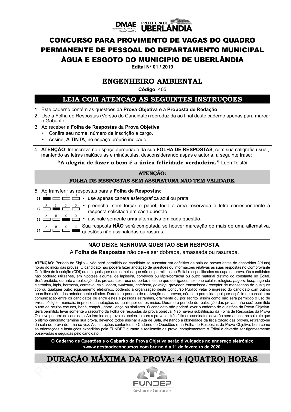 pcimarkpci MDAwMDowMDAwOjAwMDA6MDAwMDowMDAwOmZmZmY6MzZlOTpjMjU5:V2VkLCAxNSBTZXAgMjAyMSAxNjoxNDo1NCAtMDMwMA== CONCURSO PARA PROVIMENTO DE VAGAS DO QUADRO PERMANENTE DE PESSOAL DO DEPARTAMENTO MUNICIPAL ÁGUA E ESGOTO DO MUNICIPIO DE UBERLÂNDIA Edital Nº 01 / 2019 ENGENHEIRO AMBIENTAL Código: 405 LEIA COM ATENÇÃO AS SEGUINTES INSTRUÇÕES 1. Este caderno contém as questões da Prova Objetiva e a Proposta de Redação. 2. Use a Folha de Respostas (Versão do Candidato) reproduzida ao final deste caderno apenas para marcar o Gabarito. 3. Ao receber a Folha de Respostas da Prova Objetiva: • Confira seu nome, número de inscrição e cargo. • Assine, A TINTA, no espaço próprio indicado. 4. ATENÇÃO: transcreva no espaço apropriado da sua FOLHA DE RESPOSTAS, com sua caligrafia usual, mantendo as letras maiúsculas e minúsculas, desconsiderando aspas e autoria, a seguinte frase: “A alegria de fazer o bem é a única felicidade verdadeira.” Leon Tolstói ATENÇÃO: FOLHA DE RESPOSTAS SEM ASSINATURA NÃO TEM VALIDADE. 5. Ao transferir as respostas para a Folha de Respostas: • use apenas caneta esferográfica azul ou preta. • preencha, sem forçar o papel, toda a área reservada à letra correspondente à resposta solicitada em cada questão. • assinale somente uma alternativa em cada questão. Sua resposta NÃO será computada se houver marcação de mais de uma alternativa, questões não assinaladas ou rasuras. NÃO DEIXE NENHUMA QUESTÃO SEM RESPOSTA. A Folha de Respostas não deve ser dobrada, amassada ou rasurada. ATENÇÃO: Período de Sigilo – Não será permitido ao candidato se ausentar em definitivo da sala de provas antes de decorridas 2(duas) horas do início das provas. O candidato não poderá fazer anotação de questões ou informações relativas às suas respostas no Comprovante Definitivo de Inscrição (CDI) ou em quaisquer outros meios, que não os permitidos no Edital e especificados na capa da prova. Os candidatos não poderão utilizar-se, em hipótese alguma, de lapiseira, corretivos ou lápis-borracha ou outro material distinto do constante no Edital. Será proibido, durante a realização das provas, fazer uso ou portar, mesmo que desligados, telefone celular, relógios, pagers, beep, agenda eletrônica, lápis, borracha, corretivo, calculadora, walkman, notebook, palmtop, gravador, transmissor / receptor de mensagens de qualquer tipo ou qualquer outro equipamento eletrônico, podendo a organização deste Concurso Público vetar o ingresso do candidato com outros aparelhos além dos anteriormente citados. Durante o período de realização das provas, não será permitida qualquer espécie de consulta ou comunicação entre os candidatos ou entre estes e pessoas estranhas, oralmente ou por escrito, assim como não será permitido o uso de livros, códigos, manuais, impressos, anotações ou quaisquer outros meios. Durante o período de realização das provas, não será permitido o uso de óculos escuros, boné, chapéu, gorro, lenço ou similares. O candidato não poderá levar o caderno de questões da Prova Objetiva. Será permitido levar somente o rascunho da Folha de respostas da prova objetiva. Não haverá substituição da Folha de Respostas da Prova Objetiva por erro do candidato. Ao término do prazo estabelecido para a prova, os três últimos candidatos deverão permanecer na sala até que o último candidato termine sua prova, devendo todos assinar a Ata de Sala, atestando a idoneidade da fiscalização das provas, retirando-se da sala de prova de uma só vez. As instruções contantes no Caderno de Questões e na Folha de Respostas da Prova Objetiva, bem como as orientações e instruções expedidas pela FUNDEP durante a realização da prova, complementam o Edital e deverão ser rigorosamente observadas e seguidas pelo candidato. O Caderno de Questões e o Gabarito da Prova Objetiva serão divulgados no endereço eletrônico <www.gestaodeconcursos.com.br> no dia 11 de fevereiro de 2020. DURAÇÃO MÁXIMA DA PROVA: 4 (QUATRO) HORAS pcimarkpci MDAwMDowMDAwOjAwMDA6MDAwMDowMDAwOmZmZmY6MzZlOTpjMjU5:V2VkLCAxNSBTZXAgMjAyMSAxNjoxNDo1NCAtMDMwMA== ATENÇÃO Sr.(a) Candidato(a), Antes de começar a fazer a prova, confira se este caderno contém, ao todo, 45 (quarenta e cinco) questões de múltipla escolha, cada uma constituída de 4 (quatro) alternativas de respostas, assim distribuídas: 10 (dez) questões de Português, 10 (dez) questões de Raciocínio Lógico, 5 (cinco) questões de Atualidades, 5 (cinco) questões de Legislação, 15 (quinze) questões de Conhecimentos Específicos e Proposta de Redação, todas perfeitamente legíveis. Havendo algum problema, informe imediatamente ao aplicador de provas para que ele tome as providências necessárias. Caso não observe essa recomendação, não lhe caberá qualquer reclamação ou recursos posteriores. pcimarkpci MDAwMDowMDAwOjAwMDA6MDAwMDowMDAwOmZmZmY6MzZlOTpjMjU5:V2VkLCAxNSBTZXAgMjAyMSAxNjoxNDo1NCAtMDMwMA== 3 PORTUGUêS INSTRUÇÃO: Leia o texto I a seguir para responder às questões de 1 a 3. TEXTO I “Só Gabriela parecia não sentir a caminhada, seus pés como que deslizando pela picada muitas vezes aberta na hora a golpes de facão, na mata virgem. Como se não existissem as pedras, os tocos, os cipós emaranhados. A poeira dos caminhos da caatinga a cobrira tão por completo que era impossível distinguir seus traços. Nos cabelos já não penetrava o pedaço de pente, tanto pó se acumulara. Parecia uma demente perdida nos caminhos. Mas Clemente sabia como ela era deveras e o sabia em cada partícula de seu ser, na ponta dos dedos e na pele do peito. Quando os dois grupos se encontraram, no começo da viagem, a cor do rosto de Gabriela e de suas pernas era ainda visível e os cabelos rolavam sobre o cangote, espalhando perfume. Ainda agora, através da sujeira a envolvê-la, ele a enxergava como a vira no primeiro dia, encostada numa árvore, o corpo esguio, o rosto sorr