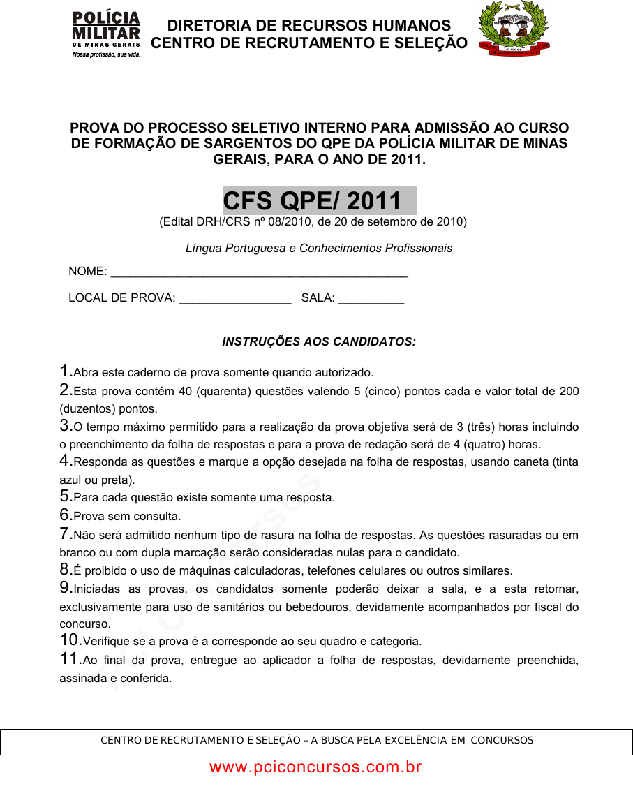 pcimarkpci MDAwMDowMDAwOjAwMDA6MDAwMDowMDAwOmZmZmY6MzZlOTpjMjU5:RnJpLCAxMCBTZXAgMjAyMSAyMTowODoyMiAtMDMwMA== PROVA DO PROCESSO SELETIVO INTERNO PARA ADMISSÃO AO CURSO DE FORMAÇÃO DE SARGENTOS DO QPE DA POLÍCIA MILITAR DE MINAS GERAIS, PARA O ANO DE 2011. CFS QPE/ 2011 (Edital DRH/CRS nº 08/2010, de 20 de setembro de 2010) Língua Portuguesa e Conhecimentos Profissionais INSTRUÇÕES AOS CANDIDATOS: 1.Abra este caderno de prova somente quando autorizado. 2.Esta prova contém 40 (quarenta) questões valendo 5 (cinco) pontos cada e valor total de 200 (duzentos) pontos. 3.O tempo máximo permitido para a realização da prova objetiva será de 3 (três) horas incluindo o preenchimento da folha de respostas e para a prova de redação será de 4 (quatro) horas. 4.Responda as questões e marque a opção desejada na folha de respostas, usando caneta (tinta azul ou preta). 5.Para cada questão existe somente uma resposta. 6.Prova sem consulta. 7.Não será admitido nenhum tipo de rasura na folha de respostas. As questões rasuradas ou em branco ou com dupla marcação serão consideradas nulas para o candidato. 8.É proibido o uso de máquinas calculadoras, telefones celulares ou outros similares. 9.Iniciadas as provas, os candidatos somente poderão deixar a sala, e a esta retornar, exclusivamente para uso de sanitários ou bebedouros, devidamente acompanhados por fiscal do concurso. 10.Verifique se a prova é a corresponde ao seu quadro e categoria. 11.Ao final da prova, entregue ao aplicador a folha de respostas, devidamente preenchida, assinada e conferida. CENTRO DE RECRUTAMENTO E SELEÇÃO – A BUSCA PELA EXCELÊNCIA EM CONCURSOS CONCURSOS . NOME: _____________________________________________ LOCAL DE PROVA: _________________ SALA: __________ DIRETORIA DE RECURSOS HUMANOS CENTRO DE RECRUTAMENTO E SELEÇÃO www.pciconcursos.com.br www.pciconcursos.com.br pcimarkpci MDAwMDowMDAwOjAwMDA6MDAwMDowMDAwOmZmZmY6MzZlOTpjMjU5:RnJpLCAxMCBTZXAgMjAyMSAyMTowODoyMiAtMDMwMA== PROVA DO PROCESSO SELETIVO INTERNO PARA ADMISSÃO AO CFS QPE - 2011 LÍNGUA PORTUGUESA A era das mãos entrelaçadas Envolverde 19 de agosto de 2010 às 11:48h Sentimentos como a angústia nos faz repensar e buscar novos caminhos Por Leonardo Boff Meus artigos sobre a situação ecológica da Terra poderão ter suscitado nos leitores e nas leitoras não poucas angústias. E é bom que assim seja, pois são as angústias que nos tiram da inércia, nos fazem pensar, ler, conversar, discutir e buscar novos caminhos. A tranquilidade em tempos sombrios como os nossos se afigura como uma irresponsabilidade. Cada um e todos devemos agir rápido e juntos porque tudo é urgente. Temos que nos mobilizar para definir um novo rumo à nossa vida neste Planeta, caso quisermos continuar habitando nele. Os tempos de abundância e comodidade pertencem ao passado. O que está ocorrendo não é uma simples crise, mas uma irreversibilidade. A Terra mudou de modo que não tem mais retorno e nós temos que mudar com ela. Começou o tempo da consciência da finitude de todas as coisas, também daquilo que nos parecia mais perene: a persistência da vitalidade da Terra, o equilíbrio da biosfera e a imortalidade da espécie humana. Todas estas realidades estão experimentando um processo de caos. No início ele se apresenta destrutivo, deixando cair tudo que é acidental e meramente agregado, mas em seguida, se revela criativo, dando forma nova ao que é perene e essencial para a vida. Até agora vivíamos sob a era do punho cerrado para dominar, subjugar e destruir. Agora começa a era da mão estendida e aberta para se entrelaçar com outras mãos e, na colaboração e na solidariedade, construir “o bem viver comunitário” e o bem comum da Terra e da humanidade. Adeus ao inveterado individualismo e bem-vinda a cooperação de todos com todos. Como os astrofísicos e os cosmólogos nos asseguram, o universo está ainda em gênese, em processo de expansão e de auto-criação. Há uma Energia de Fundo que subjaz a todos os eventos, sustenta cada ser e ordena todas as energias para frente e para cima rumo a formas cada vez mais complexas e conscientes. Nós somos uma emergência criativa dela. Ela está sempre em ação mas se mostra especialmente ativa em momentos de crise sistêmica quando se acumulam as forças para provocar rupturas e possibilitar saltos de qualidade. É então que ocorrem as “emergências”: algo novo, ainda não existente mas contido nas virtualidades do Universo. Estimo que estamos às portas de uma destas “emergências”: a noosfera (mentes e corações unidos), a fase planetária da consciência e a unificação da espécie humana, reunida na mesma Casa Comum, o planeta Terra. Então, nos identificaremos como irmãos e irmãs que se sentam juntos à mesa, para conviver, comer, beber e desfrutar dos frutos da Mãe Terra, depois de haver trabalhado de forma cooperativa e respeitando a natureza. Confirmaremos assim o que disse o filósofo do Princípio Esperança, Ernst Bloch:”o gênesis não está no começo mas no fim”. CENTRO DE RECRUTAMENTO E SELEÇÃO – A BUSCA PELA EXCELÊNCIA EM CONCURSOS 2 www.pciconcursos.com.br www.pciconcursos.com.br pcimarkpci MDAwMDowMDAwOjAwMDA6MDAwMDowMDAwOmZmZmY6MzZlOTpjMjU5:RnJpLCAxMCBTZXAgMjAyMSAyMTowODoyMiAtMDMwMA== PROVA DO PROCESSO SELETIVO INTERNO PARA ADMISSÃO AO CFS QPE - 2011 Faço minhas as palavras do pai da ecologia norte-americana, o antropólogo das culturas e teólogo Thomas Berry: “Não nos faltarão nunca as energias necessárias para forjar o futuro. Vivemos, na verdade, imersos num oceano de Energia, maior do que podemos imaginar. Esta Energia nos pertence, não pela via da dominação mas pela via da invocação”. Temos que invocar esta Energia de Fundo. Ela sempre está ai, disponível. Basta abrir- se a ela com a disposição de acolhê-la e de fazer as transformações que ela inspira. Pelo fato de ser uma Energia benfazeja e criadora, ela nos permite p