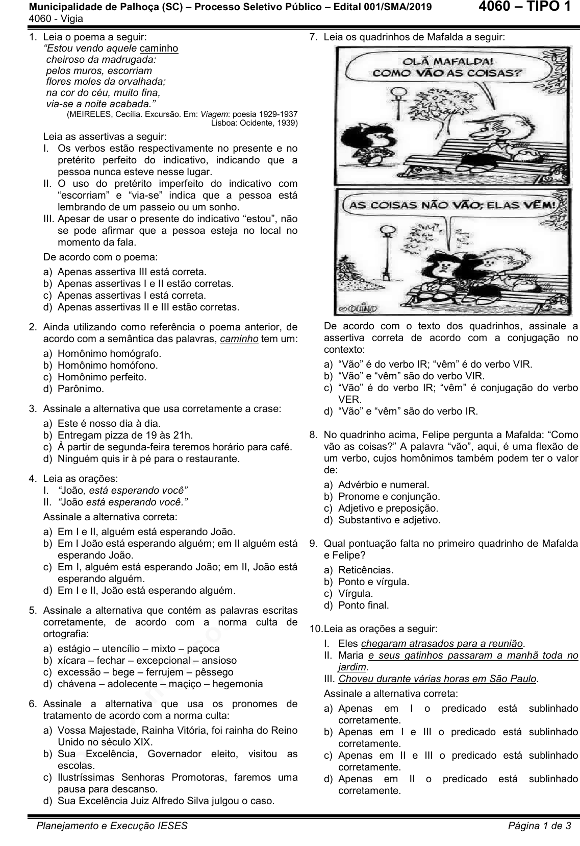 pcimarkpci MDAwMDowMDAwOjAwMDA6MDAwMDowMDAwOmZmZmY6MzZlOTpjMjU5:RnJpLCAxMCBTZXAgMjAyMSAxODoyOTo0MSAtMDMwMA== Municipalidade de Palhoça (SC) – Processo Seletivo Público – Edital 001/SMA/2019 4060 - Vigia Planejamento e Execução IESES Página 1 de 3 4060 – TIPO 1 1. Leia o poema a seguir: “Estou vendo aquele caminho cheiroso da madrugada: pelos muros, escorriam flores moles da orvalhada; na cor do céu, muito fina, via-se a noite acabada.” (MEIRELES, Cecília. Excursão. Em: Viagem: poesia 1929-1937 Lisboa: Ocidente, 1939) Leia as assertivas a seguir: I. Os verbos estão respectivamente no presente e no pretérito perfeito do indicativo, indicando que a pessoa nunca esteve nesse lugar. II. O uso do pretérito imperfeito do indicativo com “escorriam” e “via-se” indica que a pessoa está lembrando de um passeio ou um sonho. III. Apesar de usar o presente do indicativo “estou”, não se pode afirmar que a pessoa esteja no local no momento da fala. De acordo com o poema: a) Apenas assertiva III está correta. b) Apenas assertivas I e II estão corretas. c) Apenas assertivas I está correta. d) Apenas assertivas II e III estão corretas. 2. Ainda utilizando como referência o poema anterior, de acordo com a semântica das palavras, caminho tem um: a) Homônimo homógrafo. b) Homônimo homófono. c) Homônimo perfeito. d) Parônimo. 3. Assinale a alternativa que usa corretamente a crase: a) Este é nosso dia à dia. b) Entregam pizza de 19 às 21h. c) À partir de segunda-feira teremos horário para café. d) Ninguém quis ir à pé para o restaurante. 4. Leia as orações: I. “João, está esperando você” II. “João está esperando você.” Assinale a alternativa correta: a) Em I e II, alguém está esperando João. b) Em I João está esperando alguém; em II alguém está esperando João. c) Em I, alguém está esperando João; em II, João está esperando alguém. d) Em I e II, João está esperando alguém. 5. Assinale a alternativa que contém as palavras escritas corretamente, de acordo com a norma culta de ortografia: a) estágio – utencílio – mixto – paçoca b) xícara – fechar – excepcional – ansioso c) excessão – bege – ferrujem – pêssego d) chávena – adolecente – maçiço – hegemonia 6. Assinale a alternativa que usa os pronomes de tratamento de acordo com a norma culta: a) Vossa Majestade, Rainha Vitória, foi rainha do Reino Unido no século XIX. b) Sua Excelência, Governador eleito, visitou as escolas. c) Ilustríssimas Senhoras Promotoras, faremos uma pausa para descanso. d) Sua Excelência Juiz Alfredo Silva julgou o caso. 7. Leia os quadrinhos de Mafalda a seguir: De acordo com o texto dos quadrinhos, assinale a assertiva correta de acordo com a conjugação no contexto: a) “Vão” é do verbo IR; “vêm” é do verbo VIR. b) “Vão” e “vêm” são do verbo VIR. c) “Vão” é do verbo IR; “vêm” é conjugação do verbo VER. d) “Vão” e “vêm” são do verbo IR. 8. No quadrinho acima, Felipe pergunta a Mafalda: “Como vão as coisas?” A palavra “vão”, aqui, é uma flexão de um verbo, cujos homônimos também podem ter o valor de: a) Advérbio e numeral. b) Pronome e conjunção. c) Adjetivo e preposição. d) Substantivo e adjetivo. 9. Qual pontuação falta no primeiro quadrinho de Mafalda e Felipe? a) Reticências. b) Ponto e vírgula. c) Vírgula. d) Ponto final. 10. Leia as orações a seguir: I. Eles chegaram atrasados para a reunião. II. Maria e seus gatinhos passaram a manhã toda no jardim. III. Choveu durante várias horas em São Paulo. Assinale a alternativa correta: a) Apenas em I o predicado está sublinhado corretamente. b) Apenas em I e III o predicado está sublinhado corretamente. c) Apenas em II e III o predicado está sublinhado corretamente. d) Apenas em II o predicado está sublinhado corretamente. pcimarkpci MDAwMDowMDAwOjAwMDA6MDAwMDowMDAwOmZmZmY6MzZlOTpjMjU5:RnJpLCAxMCBTZXAgMjAyMSAxODoyOTo0MSAtMDMwMA== Municipalidade de Palhoça (SC) – Processo Seletivo Público – Edital 001/SMA/2019 4060 - Vigia Planejamento e Execução IESES Página 2 de 3 4060 – TIPO 1 11. Sendo a = 3 e b = 9 a razão inversa de a para b é igual: a) 3 b) 0,5 c) 1 d) 1,5 12. O Acre é uma medida de: a) Distância. b) Volume. c) Pressão. d) Área. 13. Três hectômetros equivalem a quantos metros? a) 300 metros. b) 3000 metros. c) 30.000 metros. d) 30 metros. 14. Qual é o perímetro de um retângulo que 8 cm em um lado e 3 cm em outro? a) 12 cm. b) 24 cm. c) 22 cm. d) 11 cm. 15. Sabendo que temos os conjuntos A e B é INCORRETO afirmar sobre a teoria dos conjuntos: a) Se B é um subconjunto de A, a complementar de A em B é igual a B – A. b) União de A e B é o conjunto formado por elementos que pertencem a A e a B. c) Intersecção de A com B é o conjunto dos elementos em comum a A e a B. d) A e B são considerados conjuntos disjuntos quando não possuírem intersecção. 16. Qual é o resultado da expressão numérica abaixo? 5 + 2 – 7 . 2 + 12 a) 5 b) 33 c) 14 d) 12 17. Uma mercadoria era anunciada com o preço de venda igual a $ 1300,00, posteriormente ela sofreu dois reajustes consecutivos de 5% e outro de 8%. Qual é o novo preço deste produto? a) $ 1.469,00 b) $ 1.458,75 c) $ 1.474,20 d) $ 1.483,92 18. Qual das medidas a seguir NÃO É uma unidade de Massa? a) Gramas b) Joules c) Libras d) Onças 19. Qual é resultado da expressão numérica abaixo? 20 + (40 – 25 / 5 + 4 + 6 . 10) – 5 a) 89 b) 119 c) 82 d) 114 20. A razão de 9 para 36 é igual a: a) 1/8 b) 1/2 c) 1/6 d) 1/4 21. Conforme o manual do vigilante da Policia Federal, é postura correta do vigilante no trabalho: a) Usar gírias e estar de cara fechada. b) Tocar o cliente para chamar sua atenção. c) Estar com o uniforme desalinhado e sujo. d) Manter o corpo reto, ombros e braços para trás e cabeça erguida. 22. O incêndio só existe onde a prevenção falha. São métodos preventivos mais comuns, EX