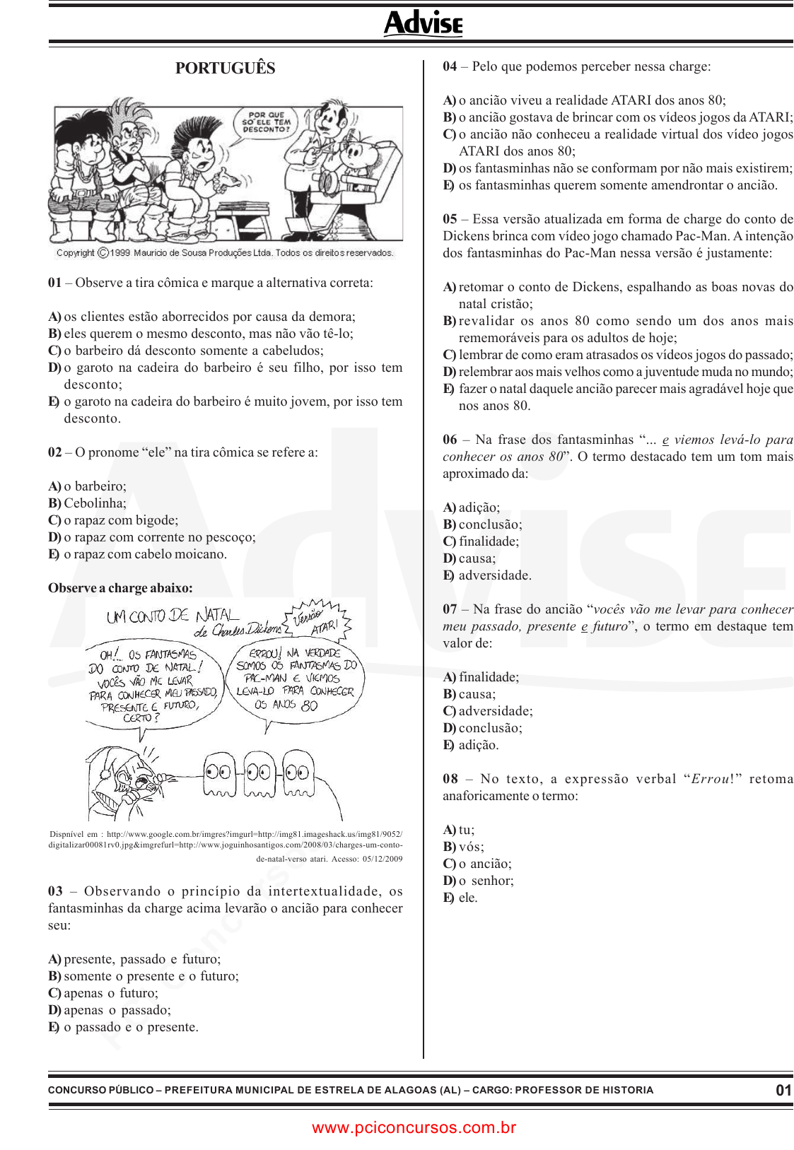 pcimarkpci MDAwMDowMDAwOjAwMDA6MDAwMDowMDAwOmZmZmY6MzZlOTpjMjU5:U3VuLCAxMiBTZXAgMjAyMSAyMzo1MDo0MCAtMDMwMA== CONCURSO PÚBLICO – PREFEITURA MUNICIPAL DE ESTRELA DE ALAGOAS (AL) – CARGO: PROFESSOR DE HISTORIA 01 PORTUGUÊS 01 – Observe a tira cômica e marque a alternativa correta: A) os clientes estão aborrecidos por causa da demora; B) eles querem o mesmo desconto, mas não vão tê-lo; C) o barbeiro dá desconto somente a cabeludos; D) o garoto na cadeira do barbeiro é seu filho, por isso tem desconto; E) o garoto na cadeira do barbeiro é muito jovem, por isso tem desconto. 02 – O pronome “ele” na tira cômica se refere a: A) o barbeiro; B) Cebolinha; C) o rapaz com bigode; D) o rapaz com corrente no pescoço; E) o rapaz com cabelo moicano. Observe a charge abaixo: Dispnível em : http://www.google.com.br/imgres?imgurl=http://img81.imageshack.us/img81/9052/ digitalizar00081rv0.jpg&imgrefurl=http://www.joguinhosantigos.com/2008/03/charges-um-conto- de-natal-verso atari. Acesso: 05/12/2009 03 – Observando o princípio da intertextualidade, os fantasminhas da charge acima levarão o ancião para conhecer seu: A) presente, passado e futuro; B) somente o presente e o futuro; C) apenas o futuro; D) apenas o passado; E) o passado e o presente. 04 – Pelo que podemos perceber nessa charge: A) o ancião viveu a realidade ATARI dos anos 80; B) o ancião gostava de brincar com os vídeos jogos da ATARI; C) o ancião não conheceu a realidade virtual dos vídeo jogos ATARI dos anos 80; D) os fantasminhas não se conformam por não mais existirem; E) os fantasminhas querem somente amendrontar o ancião. 05 – Essa versão atualizada em forma de charge do conto de Dickens brinca com vídeo jogo chamado Pac-Man. A intenção dos fantasminhas do Pac-Man nessa versão é justamente: A) retomar o conto de Dickens, espalhando as boas novas do natal cristão; B) revalidar os anos 80 como sendo um dos anos mais rememoráveis para os adultos de hoje; C) lembrar de como eram atrasados os vídeos jogos do passado; D) relembrar aos mais velhos como a juventude muda no mundo; E) fazer o natal daquele ancião parecer mais agradável hoje que nos anos 80. 06 – Na frase dos fantasminhas “... e viemos levá-lo para conhecer os anos 80”. O termo destacado tem um tom mais aproximado da: A) adição; B) conclusão; C) finalidade; D) causa; E) adversidade. 07 – Na frase do ancião “vocês vão me levar para conhecer meu passado, presente e futuro”, o termo em destaque tem valor de: A) finalidade; B) causa; C) adversidade; D) conclusão; E) adição. 08 – No texto, a expressão verbal “Errou!” retoma anaforicamente o termo: A) tu; B) vós; C) o ancião; D) o senhor; E) ele. www.pciconcursos.com.br pcimarkpci MDAwMDowMDAwOjAwMDA6MDAwMDowMDAwOmZmZmY6MzZlOTpjMjU5:U3VuLCAxMiBTZXAgMjAyMSAyMzo1MDo0MCAtMDMwMA== CONCURSO PÚBLICO – PREFEITURA MUNICIPAL DE ESTRELA DE ALAGOAS (AL) – CARGO: PROFESSOR DE HISTORIA 02 09 – Na charge que segue podemos perceber a ironia do homem como sendo: Disponível em: http://www.mondopalmeiras.net/blog/wp-content/uploads/2008/12/ natal_palmeiras.jpg. Acesso em 08/12/2009 A) uma crítica à má economia pela qual passa o país na atualidade; B) uma ação ufanista em relação à verdadeira árvore de natal brasileira; C) uma ação fanática em relação a sua devoção pelo seu time de futebol; D) à falta de dinheiro para se comprar um pinheiro; E) uma implicância com sua mulher que fazia questão pelo pinheiro. 10 – Na fala da mulher, o termo “isso” refere-se anaforicamente, porém de forma extra textual a: A) pinheiro; B) árvore; C) o palmeiras; D) palmeira; E) o natal. FUNDAMENTOS DA EDUCAÇÃO 11 – Marque V (verdadeiro) ou F (falso) nas afirmações abaixo. ( )Antes do aparecimento da escrita os conhecimentos eram transmitidos oralmente; ( )Na idade média o saber era transmitido somente para a plebe; ( )Na idade média a educação era exclusividade dos cléricos e dos nobres; ( )Havia uma marginalização sobre os pobres e consequentemente a educação para estes era prioridade. A ordem correta dos itens é: A) V F V F B) F V V F C) V F V V D) F F V F E) V V V F 12 – Segundo a filosofia de Ovide Decroly a educação girava em torno da: I. criança II. família III. saúde IV. alimentação V. escola Estão corretos os itens: A) I, II e III; B) I, III e IV; C) I, IV e V; D) I, II e V; E) II, IIII e IV. 13 – No Brasil a pedagogia Libertadora se caracteriza por: A) ser uma pedagogia institucional que pretende ser uma forma de resistência contra a burocracia do estado dominador; B) difundir os conteúdos de forma que estejam ligados as realidades sociais dos educandos; C) ser um ensino humanístico onde o aluno é ensinado para atingir sua realização pelo seu próprio esforço; D) desenvolver as aptidões individuais partindo dos interesses de cada um para adaptar-se ao meio; E) ser conhecida pela pedagogia de Paulo Freire e que é baseada na alfabetização para a conscientização. 14 – João é um menino que adora música e decifra facilmente os sons, as letras das musicas, os ritmos e além de outras características musicais ela canta para si mesmo. Essa característica diz que João tem uma das inteligências múltiplas de foi denominado por Gardner. A inteligência de João é a: A) linguística; B) lógico-matemática; C) intrapessoal; D) musical; E) interpessoal. 15 – A cooperação dentro de uma instituição escolar se caracteriza por: A) os alunos tentarem superar uns aos outros; B) os competidores (alunos) procurarem superar uns aos outros em busca de recompensa e eliminando os outros competidores; C) ajustar um acordo temporário entre indivíduos ou grupos em vista da recuperação de um problema; D) assimilar um conjunto de mudanças psíquicas e culturais que são resultantes de transferências de conhecimentos de um indivíduo para outro grupo ou outro indivíduo; E) o grupo ou pessoas trabalharem em conjunto, po