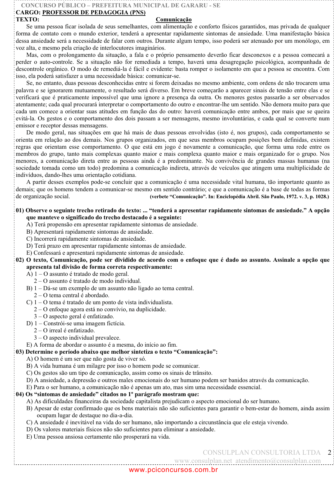 pcimarkpci MDAwMDowMDAwOjAwMDA6MDAwMDowMDAwOmZmZmY6MzZlOTpjMjU5:TW9uLCAxMyBTZXAgMjAyMSAwMzo1MTo0MiAtMDMwMA== CONCURSO PÚBLICO – PREFEITURA MUNICIPAL DE GARARU - SE CONSULPLAN CONSULTORIA LTDA www.consulplan.net atendimento@consulplan.com 2 CARGO: PROFESSOR DE PEDAGOGIA (PNS) TEXTO: Comunicação Se uma pessoa ficar isolada de seus semelhantes, com alimentação e conforto físicos garantidos, mas privada de qualquer forma de contato com o mundo exterior, tenderá a apresentar rapidamente sintomas de ansiedade. Uma manifestação básica dessa ansiedade será a necessidade de falar com outros. Durante algum tempo, isso poderá ser atenuado por um monólogo, em voz alta, e mesmo pela criação de interlocutores imaginários. Mas, com o prolongamento da situação, a fala e o próprio pensamento deverão ficar desconexos e a pessoa comecará a perder o auto-controle. Se a situação não for remediada a tempo, haverá uma desagregação psicológica, acompanhada de descontrole orgânico. O modo de remediá-la é fácil e evidente: basta romper o isolamento em que a pessoa se encontra. Com isso, ela poderá satisfazer a uma necessidade básica: comunicar-se. Se, no entanto, duas pessoas desconhecidas entre si forem deixadas no mesmo ambiente, com ordens de não trocarem uma palavra e se ignorarem mutuamente, o resultado será diverso. Em breve começarão a aparecer sinais de tensão entre elas e se verificará que é praticamente impossível que uma ignore a presença da outra. Os menores gestos passarão a ser observados atentamente; cada qual procurará interpretar o comportamento do outro e encontrar-lhe um sentido. Não demora muito para que cada um comece a orientar suas atitudes em função das do outro: haverá comunicação entre ambos, por mais que se queira evitá-la. Os gestos e o comportamento dos dois passam a ser mensagens, mesmo involuntárias, e cada qual se converte num emissor e receptor dessas mensagens. De modo geral, nas situações em que há mais de duas pessoas envolvidas (isto é, nos grupos), cada comportamento se orienta em relação ao dos demais. Nos grupos organizados, em que seus membros ocupam posições bem definidas, existem regras que orientam esse comportamento. O que está em jogo é novamente a comunicação, que forma uma rede entre os membros do grupo, tanto mais complexas quanto maior e mais complexa quanto maior e mais organizado for o grupo. Nos menores, a comunicação direta entre as pessoas ainda é a predominante. Na convivência de grandes massas humanas (na sociedade tomada como um todo) predomina a comunicação indireta, através de veículos que atingem uma multiplicidade de indivíduos, dando-lhes uma orientação cotidiana. A partir desses exemplos pode-se concluir que a comunicação é uma necessidade vital humana, tão importante quanto as demais; que os homens tendem a comunicar-se mesmo em sentido contrário; e que a comunicação é a base de todas as formas de organização social. (verbete “Comunicação”. In: Enciclopédia Abril. São Paulo, 1972. v. 3, p. 1028.) 01) Observe o seguinte trecho retirado do texto: ... “tenderá a apresentar rapidamente sintomas de ansiedade.” A opção que manteve o significado do trecho destacado é a seguinte: A) Terá propensão em apresentar rapidamente sintomas de ansiedade. B) Apresentará rapidamente sintomas de ansiedade. C) Incorrerá rapidamente sintomas de ansiedade. D) Terá prazo em apresentar rapidamente sintomas de ansiedade. E) Confessará e apresentará rapidamente sintomas de ansiedade. 02) O texto, Comunicação, pode ser dividido de acordo com o enfoque que é dado ao assunto. Assinale a opção que apresenta tal divisão de forma correta respectivamente: A) 1 – O assunto é tratado de modo geral. 2 – O assunto é tratado de modo individual. B) 1 – Dá-se um exemplo de um assunto não ligado ao tema central. 2 – O tema central é abordado. C) 1 – O tema é tratado de um ponto de vista individualista. 2 – O enfoque agora está no convívio, na duplicidade. 3 – O aspecto geral é enfatizado. D) 1 – Constrói-se uma imagem fictícia. 2 – O irreal é enfatizado. 3 – O aspecto individual prevalece. E) A forma de abordar o assunto é a mesma, do início ao fim. 03) Determine o período abaixo que melhor sintetiza o texto “Comunicação”: A) O homem é um ser que não gosta de viver só. B) A vida humana é um milagre por isso o homem pode se comunicar. C) Os gestos são um tipo de comunicação, assim como os sinais de trânsito. D) A ansiedade, a depressão e outros males emocionais do ser humano podem ser banidos através da comunicação. E) Para o ser humano, a comunicação não é apenas um ato, mas sim uma necessidade essencial. 04) Os “sintomas de ansiedade” citados no 1º parágrafo mostram que: A) As dificuldades financeiras da sociedade capitalista prejudicam o aspecto emocional do ser humano. B) Apesar de estar confirmado que os bens materiais não são suficientes para garantir o bem-estar do homem, ainda assim ocupam lugar de destaque no dia-a-dia. C) A ansiedade é inevitável na vida do ser humano, não importando a circunstância que ele esteja vivendo. D) Os valores materiais físicos não são suficientes para eliminar a ansiedade. E) Uma pessoa ansiosa certamente não prosperará na vida. www.pciconcursos.com.br pcimarkpci MDAwMDowMDAwOjAwMDA6MDAwMDowMDAwOmZmZmY6MzZlOTpjMjU5:TW9uLCAxMyBTZXAgMjAyMSAwMzo1MTo0MiAtMDMwMA== CONCURSO PÚBLICO – PREFEITURA MUNICIPAL DE GARARU - SE CONSULPLAN CONSULTORIA LTDA www.consulplan.net atendimento@consulplan.com 3 05) Dizer que a “comunicação é a base de todas as formas de organização social” é o mesmo que dizer que: A) A base da comunicação é a organização social. B) As formas de comunicação são organizadas socialmente. C) A sociedade organiza a base da comunicação. D) Todas as formas de organização social são baseadas na comunicação. E) A comunicação e a organiz