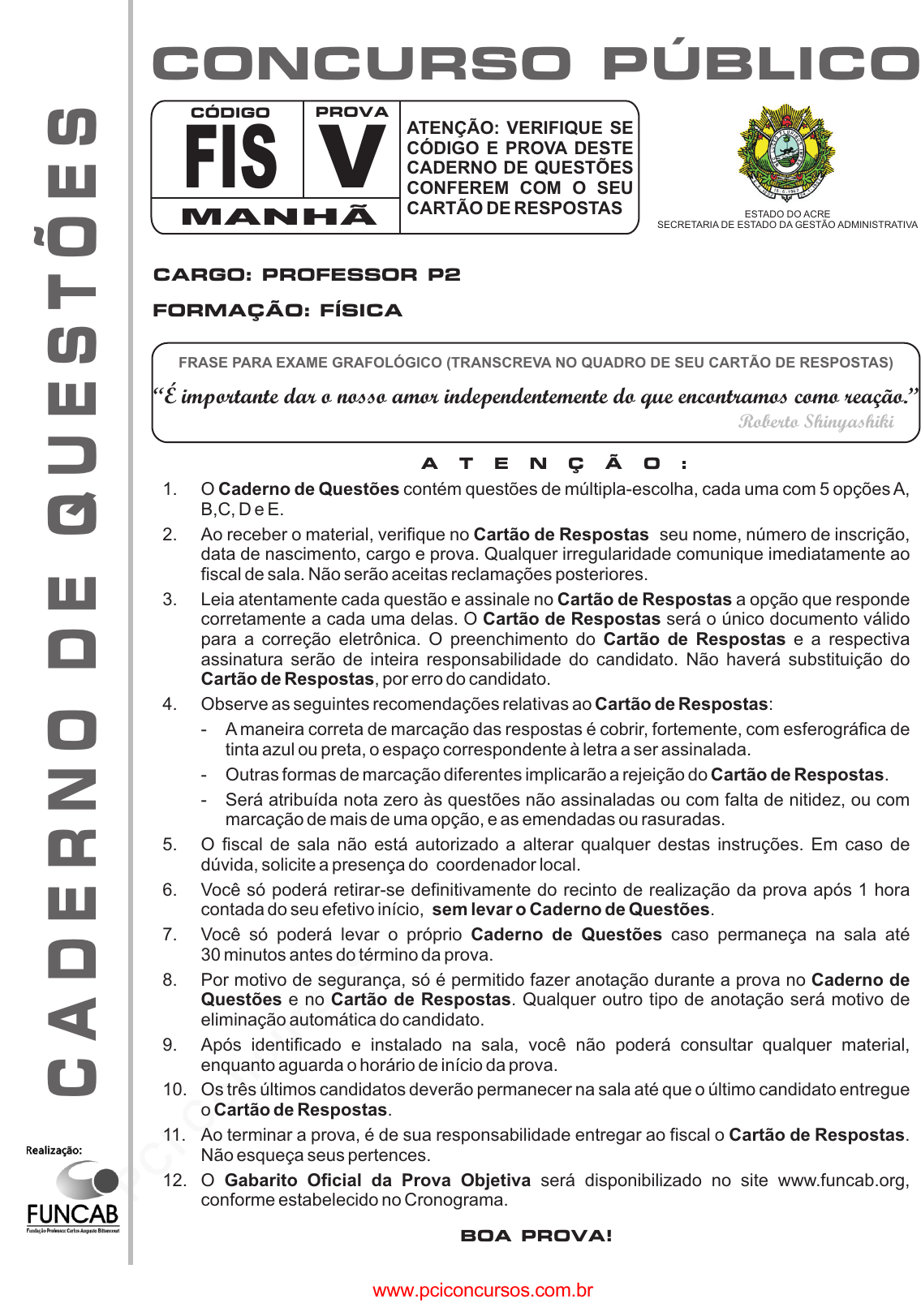 pcimarkpci MDAwMDowMDAwOjAwMDA6MDAwMDowMDAwOmZmZmY6MzZlOTpjMjU5:TW9uLCAxMyBTZXAgMjAyMSAwNzozNjo0NCAtMDMwMA== BOA PROVA! CARGO: PROFESSOR P2 FRASE PARA EXAME GRAFOLÓGICO (TRANSCREVA NO QUADRO DE SEU CARTÃO DE RESPOSTAS) “É importante dar o nosso amor independentemente do que encontramos como reação.” Roberto Shinyashiki C A D E R N O D E Q U E S T Õ E S CONCURSO PÚBLICO A T E N Ç Ã O : 1. O contém questões de múltipla-escolha, cada uma com 5 opções A, B,C, D e E. 2. Ao receber o material, verifique no seu nome, número de inscrição, data de nascimento, cargo e prova. Qualquer irregularidade comunique imediatamente ao fiscal de sala. Não serão aceitas reclamações posteriores. 3. Leia atentamente cada questão e assinale no a opção que responde corretamente a cada uma delas. O será o único documento válido para a correção eletrônica. O preenchimento do e a respectiva assinatura serão de inteira responsabilidade do candidato. Não haverá substituição do , por erro do candidato. 4. Observe as seguintes recomendações relativas ao : - A maneira correta de marcação das respostas é cobrir, fortemente, com esferográfica de tinta azul ou preta, o espaço correspondente à letra a ser assinalada. - Outras formas de marcação diferentes implicarão a rejeição do . - Será atribuída nota zero às questões não assinaladas ou com falta de nitidez, ou com marcação de mais de uma opção, e as emendadas ou rasuradas. 5. O fiscal de sala não está autorizado a alterar qualquer destas instruções. Em caso de dúvida, solicite a presença do coordenador local. 6. Você só poderá retirar-se definitivamente do recinto de realização da prova após 1 hora contada do seu efetivo início, . 7. Você só poderá levar o próprio caso permaneça na sala até 30 minutos antes do término da prova. 8. Por motivo de segurança, só é permitido fazer anotação durante a prova no e no . Qualquer outro tipo de anotação será motivo de eliminação automática do candidato. 9. Após identificado e instalado na sala, você não poderá consultar qualquer material, enquanto aguarda o horário de início da prova. 10. Os três últimos candidatos deverão permanecer na sala até que o último candidato entregue o . 11. Ao terminar a prova, é de sua responsabilidade entregar ao fiscal o . Não esqueça seus pertences. 12. O será disponibilizado no site www.funcab.org, conforme estabelecido no Cronograma. Caderno de Questões Cartão de Respostas Cartão de Respostas Cartão de Respostas Cartão de Respostas Cartão de Respostas Cartão de Respostas Cartão de Respostas sem levar o Caderno de Questões Caderno de Questões Caderno de Questões Cartão de Respostas Cartão de Respostas Cartão de Respostas Gabarito Oficial da Prova Objetiva VFIS ATENÇÃO: VERIFIQUE SE CÓDIGO E PROVA DESTE CADERNO DE QUESTÕES CONFEREM COM O SEU CARTÃO DE RESPOSTAS PROVACÓDIGO MANHÃ FORMAÇÃO: FÍSICA ESTADO DO ACRE SECRETARIA DE ESTADO DA GESTÃO ADMINISTRATIVA www.pciconcursos.com.br pcimarkpci MDAwMDowMDAwOjAwMDA6MDAwMDowMDAwOmZmZmY6MzZlOTpjMjU5:TW9uLCAxMyBTZXAgMjAyMSAwNzozNjo0NCAtMDMwMA== 02 CONHECIMENTOS GERAIS Leia o texto abaixo e responda às questões propostas. Texto 1: Cada idioma do mundo tem suas próprias características e diferenças ou “individualidade”. O português difere do francês em ter dois verbos de ligação, ser e estar; o português se distingue do francês, do italiano e do espanhol por ter infinitivos conjugados (para vocês falarem, para nós falarmos, para eles falarem). A língua portuguesa, diferentemente de outros idiomas, recorre ao futuro do subjuntivo, que tem, em certos casos, formas verbais irregulares que atrapalham tanto falantes nativos como os aprendizes do idioma. Se o juiz der a autorização, procederemos à investigação. Se eles virem os estragos realizados pelas inundações, tomarão logo as devidas providências. Se eles vierem para dialogar e não brigar, poderemos chegar a um acordo. Outra marca do “gênio da língua portuguesa”, para usar as palavras do gramático Evanildo Bechara, é o emprego do gerúndio precedido do verbo estar (além de outros verbos como andar, ir, vir, ficar) para “... trazer atos que se realizam paulatinamente, em vez do uso de formas simples do verbo, como faz o francês”. É como ilustra um exemplo de Bechara: “Jeanne nous regard/Joana está-nos olhando ou olha”, em Moderna Gramática Portuguesa (2001, página 232). Um fenômeno também específico do português é a mesóclise, isto é, a intercalação de pronomes átonos nos verbos no futuro do presente ou no futuro do pretérito: “dir-se-á” e “calar-me-ia”. Alguns falantes de português lamentam o fato de que a mesóclise esteja sendo cada dia menos usada na língua contemporânea. Alguns jornais de ampla circulação recomendam que os jornalistas não usem a mesóclise em suas reportagens. É uma realidade que as línguas mudem através do tempo e as mudanças ocorrem paulatinamente sem os usuários perceberem. Algumas construções desaparecem enquanto outras surgem. É a vida. O QUE SÓ O PORTUGUÊS TEM (John Robert Schmitz. In A Lingua. Ano I – Número 9 /2006. In www.iilp- cplp.cv/index.php?.) 2. A intertextualidade é um dos recursos usado por autores para mostrar a validade de seus argumentos, como acontece no texto 1. Nesse caso, a intertextualidade ocorre: A) através da comparação de estruturas gramaticais da língua portuguesa com as de outras línguas. B) c o m a c i t a ç ã o d e u m g r a m á t i c o reconhecidamente conhecido pelos estudiosos da Língua Portuguesa. C) quando o autor aponta a recomendação de jornais de ampla circulação para que se evite o uso da mesóclise nas reportagens. D) na exemplificação dos diversos usos de verbos irregulares no futuro do subjuntivo, como dar, ver e vir. E) nos diferentes usos de aspas para marcar os termos que mereceram destaque pelo autor em sua argum