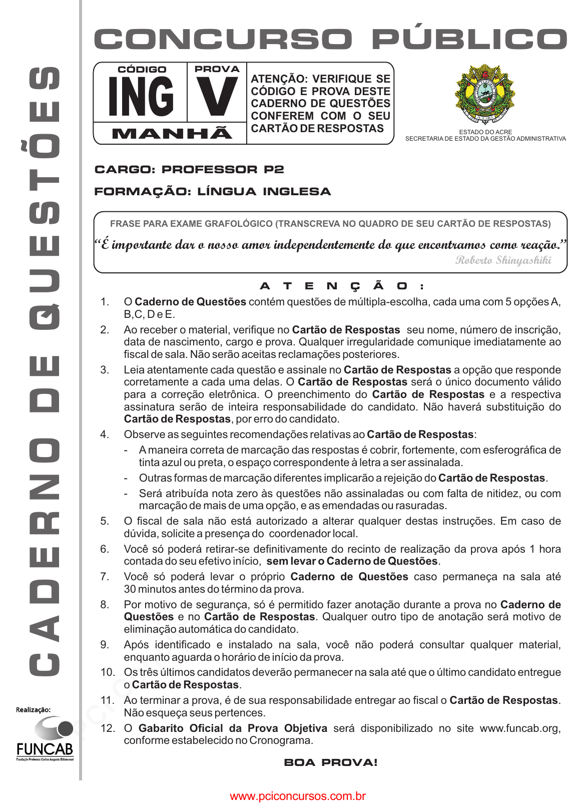 pcimarkpci MDAwMDowMDAwOjAwMDA6MDAwMDowMDAwOmZmZmY6MzZlOTpjMjU5:TW9uLCAxMyBTZXAgMjAyMSAwNzo1NzoxMCAtMDMwMA== BOA PROVA! CARGO: PROFESSOR P2 FRASE PARA EXAME GRAFOLÓGICO (TRANSCREVA NO QUADRO DE SEU CARTÃO DE RESPOSTAS) “É importante dar o nosso amor independentemente do que encontramos como reação.” Roberto Shinyashiki C A D E R N O D E Q U E S T Õ E S CONCURSO PÚBLICO A T E N Ç Ã O : 1. O contém questões de múltipla-escolha, cada uma com 5 opções A, B,C, D e E. 2. Ao receber o material, verifique no seu nome, número de inscrição, data de nascimento, cargo e prova. Qualquer irregularidade comunique imediatamente ao fiscal de sala. Não serão aceitas reclamações posteriores. 3. Leia atentamente cada questão e assinale no a opção que responde corretamente a cada uma delas. O será o único documento válido para a correção eletrônica. O preenchimento do e a respectiva assinatura serão de inteira responsabilidade do candidato. Não haverá substituição do , por erro do candidato. 4. Observe as seguintes recomendações relativas ao : - A maneira correta de marcação das respostas é cobrir, fortemente, com esferográfica de tinta azul ou preta, o espaço correspondente à letra a ser assinalada. - Outras formas de marcação diferentes implicarão a rejeição do . - Será atribuída nota zero às questões não assinaladas ou com falta de nitidez, ou com marcação de mais de uma opção, e as emendadas ou rasuradas. 5. O fiscal de sala não está autorizado a alterar qualquer destas instruções. Em caso de dúvida, solicite a presença do coordenador local. 6. Você só poderá retirar-se definitivamente do recinto de realização da prova após 1 hora contada do seu efetivo início, . 7. Você só poderá levar o próprio caso permaneça na sala até 30 minutos antes do término da prova. 8. Por motivo de segurança, só é permitido fazer anotação durante a prova no e no . Qualquer outro tipo de anotação será motivo de eliminação automática do candidato. 9. Após identificado e instalado na sala, você não poderá consultar qualquer material, enquanto aguarda o horário de início da prova. 10. Os três últimos candidatos deverão permanecer na sala até que o último candidato entregue o . 11. Ao terminar a prova, é de sua responsabilidade entregar ao fiscal o . Não esqueça seus pertences. 12. O será disponibilizado no site www.funcab.org, conforme estabelecido no Cronograma. Caderno de Questões Cartão de Respostas Cartão de Respostas Cartão de Respostas Cartão de Respostas Cartão de Respostas Cartão de Respostas Cartão de Respostas sem levar o Caderno de Questões Caderno de Questões Caderno de Questões Cartão de Respostas Cartão de Respostas Cartão de Respostas Gabarito Oficial da Prova Objetiva VING ATENÇÃO: VERIFIQUE SE CÓDIGO E PROVA DESTE CADERNO DE QUESTÕES CONFEREM COM O SEU CARTÃO DE RESPOSTAS PROVACÓDIGO MANHÃ FORMAÇÃO: LÍNGUA INGLESA ESTADO DO ACRE SECRETARIA DE ESTADO DA GESTÃO ADMINISTRATIVA www.pciconcursos.com.br pcimarkpci MDAwMDowMDAwOjAwMDA6MDAwMDowMDAwOmZmZmY6MzZlOTpjMjU5:TW9uLCAxMyBTZXAgMjAyMSAwNzo1NzoxMCAtMDMwMA== 02 CONHECIMENTOS GERAIS Leia o texto abaixo e responda às questões propostas. Texto 1: Cada idioma do mundo tem suas próprias características e diferenças ou “individualidade”. O português difere do francês em ter dois verbos de ligação, ser e estar; o português se distingue do francês, do italiano e do espanhol por ter infinitivos conjugados (para vocês falarem, para nós falarmos, para eles falarem). A língua portuguesa, diferentemente de outros idiomas, recorre ao futuro do subjuntivo, que tem, em certos casos, formas verbais irregulares que atrapalham tanto falantes nativos como os aprendizes do idioma. Se o juiz der a autorização, procederemos à investigação. Se eles virem os estragos realizados pelas inundações, tomarão logo as devidas providências. Se eles vierem para dialogar e não brigar, poderemos chegar a um acordo. Outra marca do “gênio da língua portuguesa”, para usar as palavras do gramático Evanildo Bechara, é o emprego do gerúndio precedido do verbo estar (além de outros verbos como andar, ir, vir, ficar) para “... trazer atos que se realizam paulatinamente, em vez do uso de formas simples do verbo, como faz o francês”. É como ilustra um exemplo de Bechara: “Jeanne nous regard/Joana está-nos olhando ou olha”, em Moderna Gramática Portuguesa (2001, página 232). Um fenômeno também específico do português é a mesóclise, isto é, a intercalação de pronomes átonos nos verbos no futuro do presente ou no futuro do pretérito: “dir-se-á” e “calar-me-ia”. Alguns falantes de português lamentam o fato de que a mesóclise esteja sendo cada dia menos usada na língua contemporânea. Alguns jornais de ampla circulação recomendam que os jornalistas não usem a mesóclise em suas reportagens. É uma realidade que as línguas mudem através do tempo e as mudanças ocorrem paulatinamente sem os usuários perceberem. Algumas construções desaparecem enquanto outras surgem. É a vida. O QUE SÓ O PORTUGUÊS TEM (John Robert Schmitz. In A Lingua. Ano I – Número 9 /2006. In www.iilp- cplp.cv/index.php?.) 2. A intertextualidade é um dos recursos usado por autores para mostrar a validade de seus argumentos, como acontece no texto 1. Nesse caso, a intertextualidade ocorre: A) através da comparação de estruturas gramaticais da língua portuguesa com as de outras línguas. B) c o m a c i t a ç ã o d e u m g r a m á t i c o reconhecidamente conhecido pelos estudiosos da Língua Portuguesa. C) quando o autor aponta a recomendação de jornais de ampla circulação para que se evite o uso da mesóclise nas reportagens. D) na exemplificação dos diversos usos de verbos irregulares no futuro do subjuntivo, como dar, ver e vir. E) nos diferentes usos de aspas para marcar os termos que mereceram destaque pelo autor em s