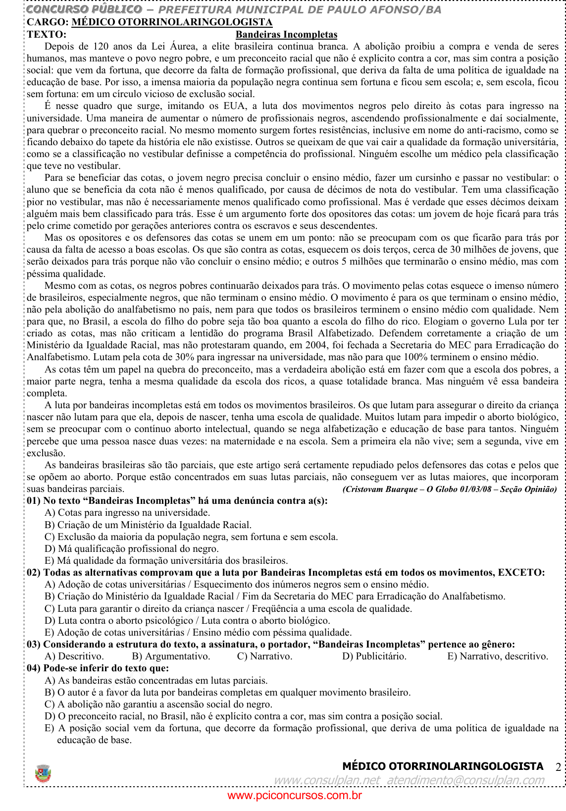 pcimarkpci MDAwMDowMDAwOjAwMDA6MDAwMDowMDAwOmZmZmY6MzZlOTpjMjU5:VHVlLCAxNCBTZXAgMjAyMSAxNToxNDoxNyAtMDMwMA== CCCOOONNNCCCUUURRRSSSOOO PPPÚÚÚBBBLLLIIICCCOOO − PREFEITURA MUNICIPAL DE PAULO AFONSO/BA MÉDICO OTORRINOLARINGOLOGISTA www.consulplan.net atendimento@consulplan.com 2 CARGO: MÉDICO OTORRINOLARINGOLOGISTA TEXTO: Bandeiras Incompletas Depois de 120 anos da Lei Áurea, a elite brasileira continua branca. A abolição proibiu a compra e venda de seres humanos, mas manteve o povo negro pobre, e um preconceito racial que não é explícito contra a cor, mas sim contra a posição social: que vem da fortuna, que decorre da falta de formação profissional, que deriva da falta de uma política de igualdade na educação de base. Por isso, a imensa maioria da população negra continua sem fortuna e ficou sem escola; e, sem escola, ficou sem fortuna: em um círculo vicioso de exclusão social. É nesse quadro que surge, imitando os EUA, a luta dos movimentos negros pelo direito às cotas para ingresso na universidade. Uma maneira de aumentar o número de profissionais negros, ascendendo profissionalmente e daí socialmente, para quebrar o preconceito racial. No mesmo momento surgem fortes resistências, inclusive em nome do anti-racismo, como se ficando debaixo do tapete da história ele não existisse. Outros se queixam de que vai cair a qualidade da formação universitária, como se a classificação no vestibular definisse a competência do profissional. Ninguém escolhe um médico pela classificação que teve no vestibular. Para se beneficiar das cotas, o jovem negro precisa concluir o ensino médio, fazer um cursinho e passar no vestibular: o aluno que se beneficia da cota não é menos qualificado, por causa de décimos de nota do vestibular. Tem uma classificação pior no vestibular, mas não é necessariamente menos qualificado como profissional. Mas é verdade que esses décimos deixam alguém mais bem classificado para trás. Esse é um argumento forte dos opositores das cotas: um jovem de hoje ficará para trás pelo crime cometido por gerações anteriores contra os escravos e seus descendentes. Mas os opositores e os defensores das cotas se unem em um ponto: não se preocupam com os que ficarão para trás por causa da falta de acesso a boas escolas. Os que são contra as cotas, esquecem os dois terços, cerca de 30 milhões de jovens, que serão deixados para trás porque não vão concluir o ensino médio; e outros 5 milhões que terminarão o ensino médio, mas com péssima qualidade. Mesmo com as cotas, os negros pobres continuarão deixados para trás. O movimento pelas cotas esquece o imenso número de brasileiros, especialmente negros, que não terminam o ensino médio. O movimento é para os que terminam o ensino médio, não pela abolição do analfabetismo no país, nem para que todos os brasileiros terminem o ensino médio com qualidade. Nem para que, no Brasil, a escola do filho do pobre seja tão boa quanto a escola do filho do rico. Elogiam o governo Lula por ter criado as cotas, mas não criticam a lentidão do programa Brasil Alfabetizado. Defendem corretamente a criação de um Ministério da Igualdade Racial, mas não protestaram quando, em 2004, foi fechada a Secretaria do MEC para Erradicação do Analfabetismo. Lutam pela cota de 30% para ingressar na universidade, mas não para que 100% terminem o ensino médio. As cotas têm um papel na quebra do preconceito, mas a verdadeira abolição está em fazer com que a escola dos pobres, a maior parte negra, tenha a mesma qualidade da escola dos ricos, a quase totalidade branca. Mas ninguém vê essa bandeira completa. A luta por bandeiras incompletas está em todos os movimentos brasileiros. Os que lutam para assegurar o direito da criança nascer não lutam para que ela, depois de nascer, tenha uma escola de qualidade. Muitos lutam para impedir o aborto biológico, sem se preocupar com o contínuo aborto intelectual, quando se nega alfabetização e educação de base para tantos. Ninguém percebe que uma pessoa nasce duas vezes: na maternidade e na escola. Sem a primeira ela não vive; sem a segunda, vive em exclusão. As bandeiras brasileiras são tão parciais, que este artigo será certamente repudiado pelos defensores das cotas e pelos que se opõem ao aborto. Porque estão concentrados em suas lutas parciais, não conseguem ver as lutas maiores, que incorporam suas bandeiras parciais. (Cristovam Buarque – O Globo 01/03/08 – Seção Opinião) 01) No texto “Bandeiras Incompletas” há uma denúncia contra a(s): A) Cotas para ingresso na universidade. B) Criação de um Ministério da Igualdade Racial. C) Exclusão da maioria da população negra, sem fortuna e sem escola. D) Má qualificação profissional do negro. E) Má qualidade da formação universitária dos brasileiros. 02) Todas as alternativas comprovam que a luta por Bandeiras Incompletas está em todos os movimentos, EXCETO: A) Adoção de cotas universitárias / Esquecimento dos inúmeros negros sem o ensino médio. B) Criação do Ministério da Igualdade Racial / Fim da Secretaria do MEC para Erradicação do Analfabetismo. C) Luta para garantir o direito da criança nascer / Freqüência a uma escola de qualidade. D) Luta contra o aborto psicológico / Luta contra o aborto biológico. E) Adoção de cotas universitárias / Ensino médio com péssima qualidade. 03) Considerando a estrutura do texto, a assinatura, o portador, “Bandeiras Incompletas” pertence ao gênero: A) Descritivo. B) Argumentativo. C) Narrativo. D) Publicitário. E) Narrativo, descritivo. 04) Pode-se inferir do texto que: A) As bandeiras estão concentradas em lutas parciais. B) O autor é a favor da luta por bandeiras completas em qualquer movimento brasileiro. C) A abolição não garantiu a ascensão social do negro. D) O preconceito racial, no Brasil, não é explícito contra a cor, mas sim contra a posição social. E) A posição social vem da 