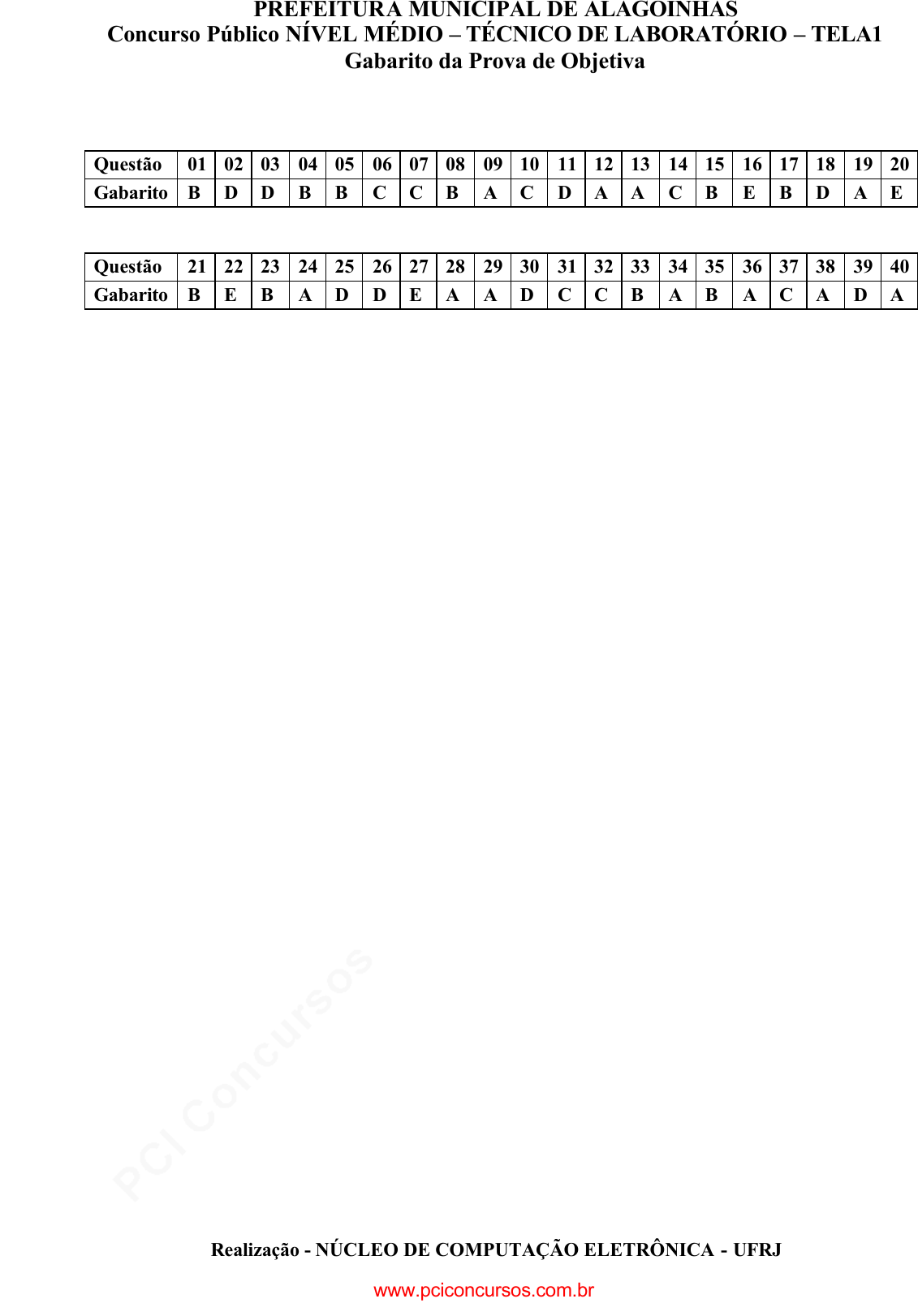 pcimarkpci MDAwMDowMDAwOjAwMDA6MDAwMDowMDAwOmZmZmY6MzZlOTpjMjU5:U2F0LCAxMSBTZXAgMjAyMSAwMzo1Nzo1MiAtMDMwMA== PREFEITURA MUNICIPAL DE ALAGOINHAS Concurso Público NÍVEL MÉDIO – TÉCNICO DE LABORATÓRIO – TELA1 Gabarito da Prova de Objetiva Realização - NÚCLEO DE COMPUTAÇÃO ELETRÔNICA - UFRJ Questão 01 02 03 04 05 06 07 08 09 10 11 12 13 14 15 16 17 18 19 20 Gabarito B D D B B C C B A C D A A C B E B D A E Questão 21 22 23 24 25 26 27 28 29 30 31 32 33 34 35 36 37 38 39 40 Gabarito B E B A D D E A A D C C B A B A C A D A www.pciconcursos.com.br pcimarkpci MDAwMDowMDAwOjAwMDA6MDAwMDowMDAwOmZmZmY6MzZlOTpjMjU5:U2F0LCAxMSBTZXAgMjAyMSAwMzo1Nzo1NiAtMDMwMA== 3 REALIZAÇÃO PROVA OBJETIVA LÍNGUA PORTUGUESA DE PAI PARA FILHO Pense bem antes de comprar: jabuti é bom, mas dura muito Se você procura um animal simpático, que dá pouco trabalho e praticamente não faz barulho, pode abrir espaço no seu jardim para um jabuti. Desde que o Ibama regularizou sua venda em 1997, o réptil passou a disputar vitrines e compradores com os tradicionais cachorros e gatos. O reflexo no preço não demorou: em 2000, um filhote custava cerca de R$120; hoje, não sai por menos que o dobro. Antes de bater o martelo, no entanto, é bom pensar duas vezes: se bem tratado, o jabuti pode viver cerca de 80 anos, longevidade que o torna, literalmente, um animal de estimação para a vida toda. Abandoná-lo num parque qualquer, como fazem muitos que querem se livrar de seus bichos, pode ficar feio para o dono: cada animal carrega um microchip de controle implantado sob a pele, e seu comprador tem de assinar um termo de compromisso na hora da compra e guardar a nota fiscal. Em breve, esse sistema de controle deve mudar, porque o microchip foi considerado muito agressivo pelos criadores, elevando o índice de mortalidade da espécie. O que se estuda é algum tipo de marcação externa do casco. “Enquanto isso não é decidido, resolvemos interromper a venda dos animais para evitar mortes”, afirma Juracy Pereira, o maior criador de jabutis do Brasil, que produz cerca de 2.700 filhotes por ano em Queimados (Bahia). Como são apenas cinco os criadores nacionais, quem se interessar em adquirir um vai precisar de paciência. São poucas as lojas que comercializam o bicho em São Paulo e ele não costuma esquentar a vitrine muito tempo. “Toda semana, recebemos uns seis pedidos e o estoque acaba assim que chega”, anima-se Leonardo Crespo, diretor do portal www.animaisonline.com. Quem encontra garante que o bicho é bom. O estudante de veterinária Rodrigo Prazeres, 22, por exemplo, é um dos entusiasmados: está no sexto jabuti, todos legalizados. “É uma ótima companhia”, acha. O único problema é que o nome só pode ser escolhido lá pelos quatro anos, quando é possível definir com segurança o sexo do bicho. Pensando bem, para quem chega aos 80 naquele passo do “devagar e sempre”, até que não é muito. MORI, Kiyomori. In: Revista da Folha, Folha de São Paulo, n.562, 23 mar. 2003, p.22 01 - O título do texto – “De pai para filho” – se justifica porque: (A) o amor aos animais se transmite pelas gerações; (B) o jabuti tem uma vida muito longa; (C) o comércio de animais é muito antigo; (D) as características dos jabutis permanecem idênticas; (E) o índice de mortalidade dos jabutis é muito pequeno. 02 - O subtítulo “Pense bem antes de comprar: jabuti é bom, mas dura muito” representa um(a): (A) conselho; (B) pedido; (C) ordem; (D) alerta; (E) repreensão. 03 - A segunda parte do subtítulo – “mas dura muito” – traz uma adversativa (mas) que introduz uma idéia: (A) positiva, pois a vida do jabuti é longa; (B) positiva, pois o jabuti será sempre uma companhia; (C) positiva, porque o jabuti é bom e barato; (D) negativa, pois a longevidade traz problemas; (E) negativa, já que o jabuti causa despesas por longo tempo. 04 - Ao utilizar o verbo “durar”, o autor trata um ser vivo, o jabuti, como uma coisa, num processo denominado reificação. O processo ocorre de novo em: (A) “Quem encontra garante que o bicho é bom”; (B) “...e o estoque acaba assim que chega...”; (C) “...esse sistema de controle deve mudar...”; (D) “Se você procura um animal simpático...”; (E) “...pode abrir espaço no seu jardim para um jabuti”. www.pciconcursos.com.br pcimarkpci MDAwMDowMDAwOjAwMDA6MDAwMDowMDAwOmZmZmY6MzZlOTpjMjU5:U2F0LCAxMSBTZXAgMjAyMSAwMzo1Nzo1NiAtMDMwMA== 4 REALIZAÇÃO PROVA OBJETIVA 05 - “Se você procura um animal simpático, que dá pouco trabalho e praticamente não faz barulho, pode abrir espaço no seu jardim para um jabuti”. Sobre os pronomes e determinantes desse segmento do texto, pode-se dizer que: (A) o você se refere a uma pessoa específica; (B) o que tem por antecedente um animal simpático; (C) pouco indica uma quantidade determinada; (D) seu se relaciona ao jabuti; (E) um, anteposto a animal, é um numeral. 06 - Ao dizer-se que o jabuti “praticamente não faz barulho”, isso significa que o animal: (A) não faz qualquer barulho; (B) só faz barulho quando anda; (C) faz pouco barulho; (D) faz muito barulho; (E) faz barulho, mas não dá trabalho. 07 - “Desde que o Ibama regularizou sua venda em 1997, o réptil passou a disputar vitrines e compradores com os tradicionais cachorros e gatos”; NÃO pode deduzir-se desse segmento do texto que: (A) havia vendas irregulares de jabutis antes de 1997; (B) os jabutis, antes de 1997, não podiam ser comercializados legalmente; (C) cachorros e gatos não podem ser colocados junto de jabutis; (D) cachorros e gatos já eram comercializados antes dos jabutis; (E) muitas lojas expõem os animais à venda nas vitrines. 08 - “...hoje não sai por menos que o dobro”; o advérbio sublinhado se refere: (A) ao tempo atual; (B) ao tempo da redação do texto; (C) ao momento da leitura do texto; (D) ao momento presente; (E) ao momento passado. 09 - Ao dizer que “o reflexo no preço não demorou