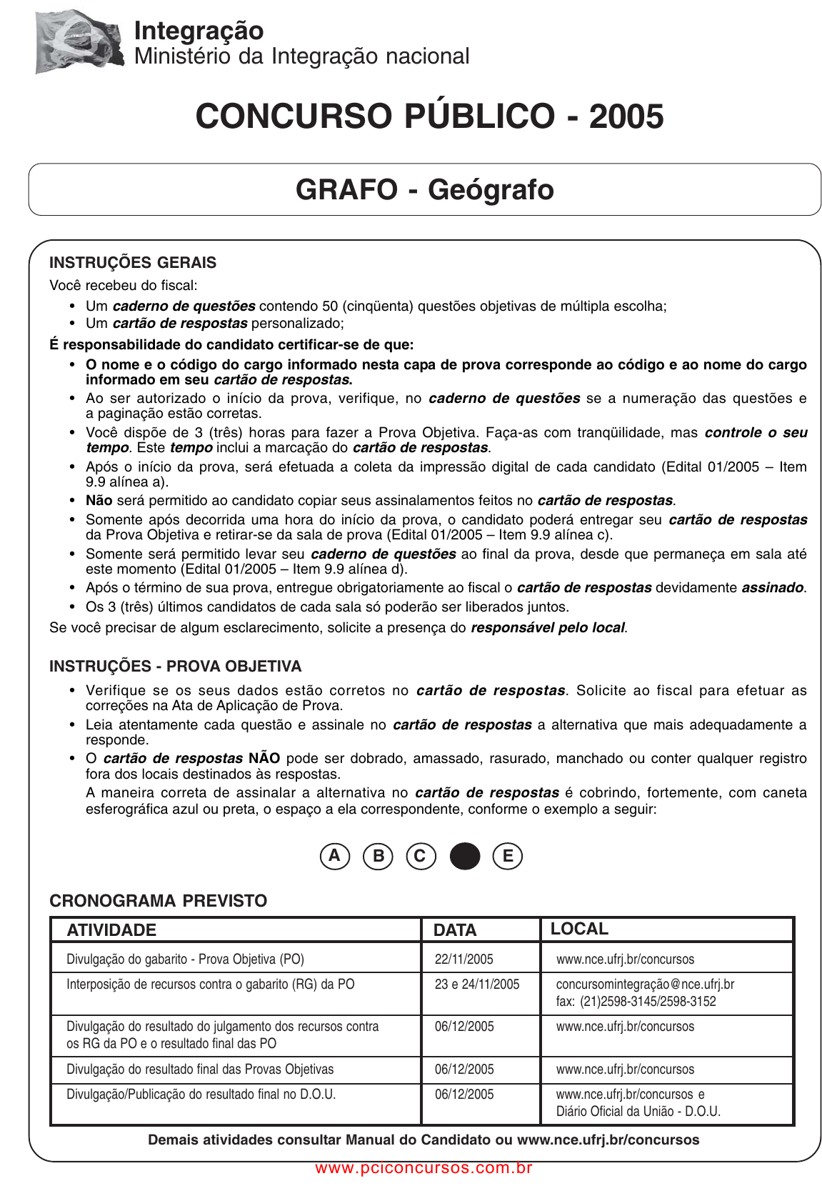 pcimarkpci MDAwMDowMDAwOjAwMDA6MDAwMDowMDAwOmZmZmY6MzZlOTpjMjU5:V2VkLCAxNSBTZXAgMjAyMSAwNTo1OTozNiAtMDMwMA== INSTRUÇÕES GERAIS Você recebeu do fiscal: • Um caderno de questões contendo 50 (cinqüenta) questões objetivas de múltipla escolha; • Um cartão de respostas personalizado; É responsabilidade do candidato certificar-se de que: • O nome e o código do cargo informado nesta capa de prova corresponde ao código e ao nome do cargo informado em seu cartão de respostas. • Ao ser autorizado o início da prova, verifique, no caderno de questões se a numeração das questões e a paginação estão corretas. • Você dispõe de 3 (três) horas para fazer a Prova Objetiva. Faça-as com tranqüilidade, mas controle o seu tempo. Este tempo inclui a marcação do cartão de respostas. • Após o início da prova, será efetuada a coleta da impressão digital de cada candidato (Edital 01/2005 – Item 9.9 alínea a). • Não será permitido ao candidato copiar seus assinalamentos feitos no cartão de respostas. • Somente após decorrida uma hora do início da prova, o candidato poderá entregar seu cartão de respostas da Prova Objetiva e retirar-se da sala de prova (Edital 01/2005 – Item 9.9 alínea c). • Somente será permitido levar seu caderno de questões ao final da prova, desde que permaneça em sala até este momento (Edital 01/2005 – Item 9.9 alínea d). • Após o término de sua prova, entregue obrigatoriamente ao fiscal o cartão de respostas devidamente assinado. • Os 3 (três) últimos candidatos de cada sala só poderão ser liberados juntos. Se você precisar de algum esclarecimento, solicite a presença do responsável pelo local. INSTRUÇÕES - PROVA OBJETIVA • Verifique se os seus dados estão corretos no cartão de respostas. Solicite ao fiscal para efetuar as correções na Ata de Aplicação de Prova. • Leia atentamente cada questão e assinale no cartão de respostas a alternativa que mais adequadamente a responde. • O cartão de respostas NÃO pode ser dobrado, amassado, rasurado, manchado ou conter qualquer registro fora dos locais destinados às respostas. A maneira correta de assinalar a alternativa no cartão de respostas é cobrindo, fortemente, com caneta esferográfica azul ou preta, o espaço a ela correspondente, conforme o exemplo a seguir: Demais atividades consultar Manual do Candidato ou www.nce.ufrj.br/concursos A B C E CONCURSO PÚBLICO - 2005 Integração Ministério da Integração nacional ATIVIDADE DATA LOCAL Divulgação do gabarito - Prova Objetiva (PO) 22/11/2005 www.nce.ufrj.br/concursos Interposição de recursos contra o gabarito (RG) da PO 23 e 24/11/2005 concursomintegração@nce.ufrj.br fax: (21)2598-3145/2598-3152 Divulgação do resultado do julgamento dos recursos contra 06/12/2005 www.nce.ufrj.br/concursos os RG da PO e o resultado final das PO Divulgação do resultado final das Provas Objetivas 06/12/2005 www.nce.ufrj.br/concursos Divulgação/Publicação do resultado final no D.O.U. 06/12/2005 www.nce.ufrj.br/concursos e Diário Oficial da União - D.O.U. CRONOGRAMA PREVISTO GRAFO - Geógrafo www.pciconcursos.com.br pcimarkpci MDAwMDowMDAwOjAwMDA6MDAwMDowMDAwOmZmZmY6MzZlOTpjMjU5:V2VkLCAxNSBTZXAgMjAyMSAwNTo1OTozNiAtMDMwMA== 2 GEÓGRAFO - GRAFO LÍNGUA PORTUGUESA TEXTO 1 – COLAPSO Jared Diamond As ruínas monumentais deixadas pelas sociedades do passado inspiram um fascínio romântico em todos nós. Quando crianças, nos maravilhamos ao ver as primeiras fotografias de tais ruínas. Ao crescermos, planejamos viagens de férias para conhecê-las como turistas. Sentimo-nos atraídos por sua beleza espetacular e perturbadora, e também pelos mistérios que propõem. A dimensão das ruínas fala em favor da antiga prosperidade e do poder de seus construtores – como se gritassem “Olhem para os meus feitos pujantes e desesperem- se!”, nas palavras de Shelley. Contudo, os construtores desapareceram, abandonando as grandes estruturas que criaram com tanto esforço. Como pode uma sociedade outrora tão pujante acabar entrando em colapso? Qual foi o destino dos seus indivíduos? Foram embora, e (neste caso) por quê? Ou será que morreram ali mesmo, de modo miserável? Por trás deste mistério romântico oculta-se um pensamento perturbador: será que nossa próspera sociedade acabará tendo o mesmo destino? Será que, algum dia, os turistas olharão fascinados para as torres enferrujadas dos arranha-céus de Nova York do mesmo modo que hoje olhamos para as ruínas das cidades maias cobertas pela vegetação? Há muito se suspeita que a maior parte desses misteriosos abandonos tenha sido provocada por problemas ecológicos, pelo fato de as pessoas terem destruído inadvertidamente os recursos ambientais dos quais as suas sociedades dependiam. A suspeita do suicídio ecológico não intencional – ecocídio – vem sendo confirmada por descobertas em décadas recentes feitas por arqueólogos, climatologistas, historiadores, paleontólogos e palinologistas (cientistas especializados em pólen). Os processos através dos quais as sociedades do passado minaram a si mesmas, danificando o meio ambiente, dividem-se em oito categorias, cuja importância relativa difere de caso para caso: desmatamento e destruição do habitat, problemas com o solo (erosão, salinização e perda de fertilidade), problemas com o controle da água, sobrecaça, sobrepesca, efeitos da introdução de outras espécies sobre as espécies nativas e aumento per capita do impacto do crescimento demográfico. 01 - Lendo o texto, podemos justificar o seu título pelo fato de: (A) muitas sociedades antigas e modernas terem entrado em colapso; (B) o colapso das antigas civilizações ser um ponto de atração para turistas; (C) o declínio de civilizações ser um fato preocupante para os modernos; (D) a decadência e fim das civilizações não ter explicação adequada; (E) o colapso ser um final obrigatório de todas as civilizações h