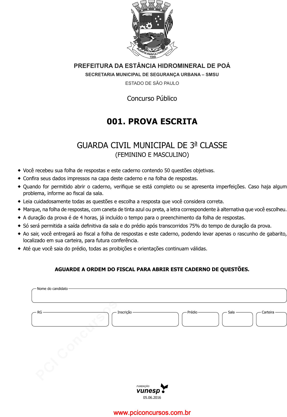 pcimarkpci MDAwMDowMDAwOjAwMDA6MDAwMDowMDAwOmZmZmY6MzZlOTpjMjU5:V2VkLCAxNSBTZXAgMjAyMSAwNjo1OToxOSAtMDMwMA== PREFEITURA DA ESTÂNCIA HIDROMINERAL DE POÁ ESTADO DE SÃO PAULO SECRETARIA MUNICIPAL DE SEGURANÇA URBANA – SMSU Concurso Público 001. Prova escrita guarda Civil muniCiPal de 3a Classe (Feminino e masCulino) � você recebeu sua folha de respostas e este caderno contendo 50 questões objetivas. � Confira seus dados impressos na capa deste caderno e na folha de respostas. � Quando for permitido abrir o caderno, verifique se está completo ou se apresenta imperfeições. Caso haja algum problema, informe ao fiscal da sala. � Leia cuidadosamente todas as questões e escolha a resposta que você considera correta. � Marque, na folha de respostas, com caneta de tinta azul ou preta, a letra correspondente à alternativa que você escolheu. � A duração da prova é de 4 horas, já incluído o tempo para o preenchimento da folha de respostas. � Só será permitida a saída definitiva da sala e do prédio após transcorridos 75% do tempo de duração da prova. � Ao sair, você entregará ao fiscal a folha de respostas e este caderno, podendo levar apenas o rascunho de gabarito, localizado em sua carteira, para futura conferência. � Até que você saia do prédio, todas as proibições e orientações continuam válidas. aguarde a ordem do fiscal Para abrir este caderno de questões. 05.06.2016 Nome do candidato Prédio sala CarteiraInscriçãorg www.pciconcursos.com.br pcimarkpci MDAwMDowMDAwOjAwMDA6MDAwMDowMDAwOmZmZmY6MzZlOTpjMjU5:V2VkLCAxNSBTZXAgMjAyMSAwNjo1OToxOSAtMDMwMA== www.pciconcursos.com.br pcimarkpci MDAwMDowMDAwOjAwMDA6MDAwMDowMDAwOmZmZmY6MzZlOTpjMjU5:V2VkLCAxNSBTZXAgMjAyMSAwNjo1OToxOSAtMDMwMA== 3 pehp1501/001-GuardaCivilMunic3aClasse língua Portuguesa Leia o texto a seguir para responder às questões de números 01 a 07. O geógrafo britânico David Harvey, adepto de uma geografia mais humanista, disse que é necessário que as pessoas sejam menos violentas. Pois é, acho que aí está a grande questão. Estamos vivendo um tempo, em todo o mundo, em que a empatia tem sido um sentimento pouquís- simo exercitado. Não há quase o desejo do diálogo, da troca e da observação do outro. Talvez esteja na hora de empre- garmos todas as energias no fortalecimento das nossas instituições de ensino, haja vista a onda que vem se fortale- cendo com a ocupação destes espaços por estudantes que não se contentam mais com o que temos hoje. Aliás, não podemos pensar que existe uma só violência. Precisamos pensar no que fazer com os usuários de craque, ou com as crianças que estão à mercê de todas as violên- cias possíveis nas ruas… Nosso esforço deve ser bem maior e mais orientado do que apenas aumentar o efetivo policial, para que, de fato, possamos ver, de alguma maneira, um ho- rizonte mais favorável no que se refere à segurança pública. Talvez devamos conversar mais e buscar entender me- lhor o que é segurança pública, pois esta vai além da ação, começa na reflexão e no diálogo entre os cidadãos e suas instituições. O que de fato precisamos é ampliar o debate sobre qual é a segurança pública que queremos e que pode- mos, juntos – sociedade, instituições de segurança, acade- mias e demais instituições da sociedade –, construir para as gerações futuras. (Mônica Brasil. Qual é a segurança pública que queremos? 16.03.2016. www.jb.com.br. Adaptado) 01. De acordo com o primeiro parágrafo do texto, é correto afirmar que (A) as pessoas não são tão violentas hoje em dia quanto eram antigamente. (B) somente uma geografia mais humanista solucionará o problema da violência. (C) estudantes não estão satisfeitos com a educação que têm recebido. (D) o diálogo e a troca de experiências são atitudes mui- to praticadas. (E) é necessário observar com antipatia a violência pra- ticada pelas pessoas. 02. A autora do texto afirma que (A) usuários de craque e crianças estão, nas ruas, ex- postos a diversas formas de violência. (B) aumentar o efetivo policial é a única solução para combater as drogas. (C) crianças de rua são frequentemente violentadas pe- los usuários de craque. (D) não há, atualmente, caminhos que conduzam à solu- ção para o problema da violência. (E) não é necessário aumentar o efetivo policial para combater a violência infantil. 03. No último parágrafo do texto, a autora defende que (A) a sociedade e as várias instituições que a compõem não são capazes de trabalhar junto a instituições de segurança por uma segurança pública favorável. (B) os cidadãos e as várias instituições que os repre- sentam precisam dialogar e refletir, além de apenas agirem, para que se estabeleça a segurança pública. (C) a reflexão e o diálogo praticado entre os cidadãos e suas instituições de trabalho podem interferir de ma- neira conflituosa no estabelecimento da segurança. (D) é necessário um debate sobre qual segurança públi- ca a população pode dispensar, já que não é possí- vel combater todas as violências ao mesmo tempo. (E) as instituições de segurança e as empresas são as únicas responsáveis por estabelecer a segurança pública para as gerações futuras. 04. No trecho – Estamos vivendo um tempo, em todo o mun- do, em que a empatia tem sido um sentimento pouquíssi- mo exercitado. –, o termo destacado, no contexto em que foi inserido, refere-se a um sentimento de (A) arrogância. (B) apatia. (C) antipatia. (D) astúcia. (E) compreensão. 05. Assinale a alternativa que completa o trecho reescrito, de acordo com a norma-padrão, quanto ao acento indicativo de crase. As crianças de rua estão expostas (A) à todas as violências. (B) à uma violência cruel. (C) à serem violentadas. (D) à violência urbana. (E) à possíveis violências. 06. No trecho – Talvez devamos conversar mais e buscar entender melhor o que é segurança pública… 