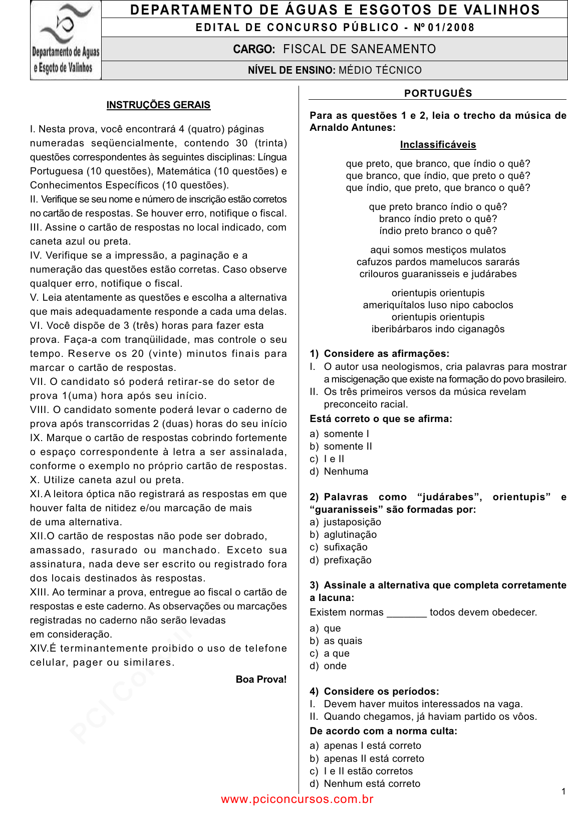 pcimarkpci MDAwMDowMDAwOjAwMDA6MDAwMDowMDAwOmZmZmY6MzZlOTpjMjU5:VGh1LCAxNiBTZXAgMjAyMSAwNDoyODoyMSAtMDMwMA== INSTRUÇÕES GERAIS I. Nesta prova, você encontrará 4 (quatro) páginas numeradas seqüencialmente, contendo 30 (trinta) questões correspondentes às seguintes disciplinas: Língua Portuguesa (10 questões), Matemática (10 questões) e Conhecimentos Específicos (10 questões). II. Verifique se seu nome e número de inscrição estão corretos no cartão de respostas. Se houver erro, notifique o fiscal. III. Assine o cartão de respostas no local indicado, com caneta azul ou preta. IV. Verifique se a impressão, a paginação e a numeração das questões estão corretas. Caso observe qualquer erro, notifique o fiscal. V. Leia atentamente as questões e escolha a alternativa que mais adequadamente responde a cada uma delas. VI. Você dispõe de 3 (três) horas para fazer esta prova. Faça-a com tranqüilidade, mas controle o seu tempo. Reserve os 20 (vinte) minutos f inais para marcar o cartão de respostas. VII. O candidato só poderá retirar-se do setor de prova 1(uma) hora após seu início. VIII. O candidato somente poderá levar o caderno de prova após transcorridas 2 (duas) horas do seu início IX. Marque o cartão de respostas cobrindo fortemente o espaço correspondente à letra a ser assinalada, conforme o exemplo no próprio cartão de respostas. X. Utilize caneta azul ou preta. XI.A leitora óptica não registrará as respostas em que houver falta de nitidez e/ou marcação de mais de uma alternativa. XII.O cartão de respostas não pode ser dobrado, amassado, rasurado ou manchado. Exceto sua assinatura, nada deve ser escrito ou registrado fora dos locais destinados às respostas. XIII. Ao terminar a prova, entregue ao fiscal o cartão de respostas e este caderno. As observações ou marcações registradas no caderno não serão levadas em consideração. XIV.É terminantemente proibido o uso de telefone celular, pager ou simi lares. Boa Prova! PORTUGUÊS Para as questões 1 e 2, leia o trecho da música de Arnaldo Antunes: Inclassificáveis que preto, que branco, que índio o quê? que branco, que índio, que preto o quê? que índio, que preto, que branco o quê? que preto branco índio o quê? branco índio preto o quê? índio preto branco o quê? aqui somos mestiços mulatos cafuzos pardos mamelucos sararás crilouros guaranisseis e judárabes orientupis orientupis ameriquítalos luso nipo caboclos orientupis orientupis iberibárbaros indo ciganagôs 1) Considere as afirmações: I. O autor usa neologismos, cria palavras para mostrar a miscigenação que existe na formação do povo brasileiro. II. Os três primeiros versos da música revelam preconceito racial. Está correto o que se afirma: a) somente I b) somente II c) I e II d) Nenhuma 2) Palavras como “judárabes”, orientupis” e “guaranisseis” são formadas por: a) justaposição b) aglutinação c) sufixação d) prefixação 3) Assinale a alternativa que completa corretamente a lacuna: Existem normas _______ todos devem obedecer. a) que b) as quais c) a que d) onde 4) Considere os períodos: I. Devem haver muitos interessados na vaga. II. Quando chegamos, já haviam partido os vôos. De acordo com a norma culta: a) apenas I está correto b) apenas II está correto c) I e II estão corretos d) Nenhum está correto 1 DEPARTAMENTO DE ÁGUAS E ESGOTOS DE VALINHOS E D I TA L D E C O N C U R S O P Ú B L I C O - Nº 0 1 / 2 0 0 8 NÍVEL DE ENSINO: MÉDIO TÉCNICO CARGO: FISCAL DE SANEAMENTO www.pciconcursos.com.br pcimarkpci MDAwMDowMDAwOjAwMDA6MDAwMDowMDAwOmZmZmY6MzZlOTpjMjU5:VGh1LCAxNiBTZXAgMjAyMSAwNDoyODoyMSAtMDMwMA== 2 5) Assinale a alternativa que completa correta e respectivamente as lacunas: I. __________ logo seus pais. II. Não ________ teus problemas para mim. a) Avisa – traz b) Avisa – tragas c) Avise – traz d) Avise – tragas 6) Assinale a alternativa em que aparece uma locução adverbial de causa: a) O menino chorou de dor. b) Aquele rapaz trabalha à noite. c) Ela chegou de repente. d) O bom aluno fez a prova com calma. 7) Indique a alternativa que contém a figura de linguagem presente nos versos abaixo: “Quero ser a cicatriz Risonha e corrosiva Marcada a frio Ferro e fogo Em carne viva...” a) eufemismo b) ironia c) metáfora d) personificação 8) Assinale a alternativa em que o sujeito é inexistente: a) Assassinaram um rapaz ontem na favela. b) Houve um tumulto durante a manifestação. c) Vive-se bem em Paris. d) Comentou-se muito aquele crime. 9) Considere o período e as afirmações que se seguem: O governo decidiu que será investigado o caso. I. O período é composto apenas por subordinação. II. O sujeito da segunda oração é simples. Está correto o que se afirma em: a) somente I b) somente II c) I e II d) nenhuma 10) Considere as duas orações abaixo: I. Verificou-se as instalações do prédio. II. A maioria dos alunos estuda pouco. De acordo com a norma culta: a) somente I está correta b) somente II está correta c) I e II estão corretas d) Nenhuma está correta MATEMÁTICA 11) O resultado de é: a) 0 b) 1 c) 2 d) 3 12) Uma torneira enche um tanque em 20 minutos, com uma vazão de 15 litros por minuto. Se a torneira diminuir a vazão para 5 litros por minuto, o tempo que levará para encher o tanque é: a) 25 min b) 30 min c) 45 min d) 60 min 13) O resultado de é: 14) As raízes da equação são: a) 0 e 1 b) 2 e 3 c) 6 e 7 d) 7 e 9 15) 16) O termo geral da P.A.( 4 , 7 ,…) é: a) 3n b) 3n +1 c) 2n – 1 d) 2n 17) O número de anagramas que a palavra BODE tem é: a) 20 b) 24 c) 64 d) 120 18) Um capital de R$ 3.000,00, aplicado a juros simples durante 5 meses, a uma taxa de 2% ao mês, produziu: a) R$ 300,00 b) R$ 350,00 c) R$ 400,00 d) R$ 500,00 ( )222222 86:105:)34( +−+ ( ) axy yxayxa 3 945 234962 − 04213 2 =−+− xx o valor para )2(f é: a) 2 b) 23 c) 231− d) 233 − Na função RRf →: , com 13)( 2 +−= xxxf , a) 3451073 315 yxayxa −