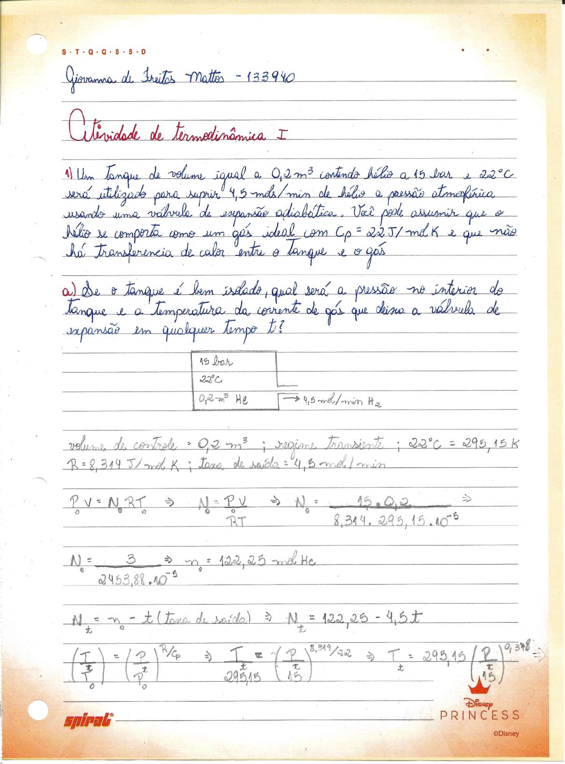 Temperatura Pressão saturada T °C Psat Kpa Vf Vg Uf Ufg Ug Hf Hfg Hg 75 38,597 0,001026 4,1291 313,99 2161,3 2475,3 314,03 2320,6 2634,6 75,86 40 0,001026 3,9933 317,58 2158,8 2476,3 317,62 2318,4 2636,1 81,32 50 0,00103 3,2403 340,49 2142,7 2483,2 340,54 2304,7 2645,2 91,76 75 0,001037 2,2172 384,36 2111,8 2496,1 384,44 2278 2662,4 99,61 100 0,001043 1,6941 417,4 2088,2 2505,6 417,51 2257,5 2675 99,97 101,325 0,001043 1,6734 418,95 2087 2506 419,06 2256,5 2675,6 150,97 125 0,001048 1,375 444,23 2068,8 2513 444,36 2240,6 2684,9 111,35 150 0,001053 1,1594 466,97 2052,3 2519,2 467,13 2226 2693,1 116,04 175 0,001057 1,0037 486,82 2037,7 2524,5 487,01 2213,1 2700,2 120,21 200 0,001061 0,88578 504,5 2024,6 2529,1 504,71 2201,6 2706,3 Dados do problema Ml (kg) Mv (kg) MT (kg) Vl (m³) Vv (m³) fl fv V i l (m³) 0,2 194,9317739 14,48257 209,4143 0,2 59,8 0,930842 0,069158 V i v (m³) 59,8 195,2719557 14,975 210,247 0,200349 59,79965 0,928774 0,071226 Qualidade do vapor 0,9 197,4490245 18,45404 215,9031 0,203372 59,79663 0,914526 0,085474 201,694751 26,96682 228,6616 0,209157 59,79084 0,882067 0,117933 205,0072048 35,29082 240,298 0,213823 59,78618 0,853137 0,146863 Fração do líquido 0,760465098 205,1668758 35,72727 240,8941 0,213989 59,78601 0,851689 0,148311 Massa final de vapor 67,48029783 207,7744092 43,478 251,2524 0,217748 59,78225 0,826955 0,173045 Tabela A-4 (Saturated water—Temperature table) Entalpia kJ/kgEnergia interna kJ/kgVolume específico m³/kg Respostas Atividade de termodinâmica I - Giovanna de Freitas Mattos - 133940 4) Um tanque de estocagem bem isolado com volume igual a 60 m³ contém 200L de água líquida a 75°C. O restante do tanque contém vapor em equilíbrio com a água. Vapor gasto em processo com 2 bar de pressão e qualidade igual a 90% entra no tanque de estocagem até que a pressão atinja 2 bar. Assumindo que não perdas de calor do tanque para o ambiente, calcule a quantidade total de vapor que entra no tanque durante o processo de enchimento e a fração de água líquida presente no final do processo. 210,1701287 51,56002 261,7302 0,221309 59,77869 0,803003 0,196997 212,3020964 59,55524 271,8573 0,224403 59,7756 0,780932 0,219068 214,2335456 67,4803 281,7138 0,227302 59,7727 0,760465 0,239535 Sf Sfg Sg 1,0158 6,6655 7,6812 1,0261 6,643 7,6691 1,0912 6,5019 7,5931 1,2132 6,2426 7,4558 1,3028 6,0562 7,3589 1,3069 6,0476 7,3545 1,3741 5,91 7,2841 1,4337 5,7894 7,2231 1,485 5,6865 7,1716 1,5302 5,5968 7,127 Tabela A-4 (Saturated water—Temperature table) Entropia kJ/kg K Atividade de termodinâmica I - Giovanna de Freitas Mattos - 133940 4) Um tanque de estocagem bem isolado com volume igual a 60 m³ contém 200L de água líquida a 75°C. O restante do tanque contém vapor em equilíbrio com a água. Vapor gasto em processo com 2 bar de pressão e qualidade igual a 90% entra no tanque de estocagem até que a pressão atinja 2 bar. Assumindo que não perdas de calor do tanque para o ambiente, calcule a quantidade total de vapor que entra no tanque durante o processo de enchimento e a fração de água líquida presente no final do processo.