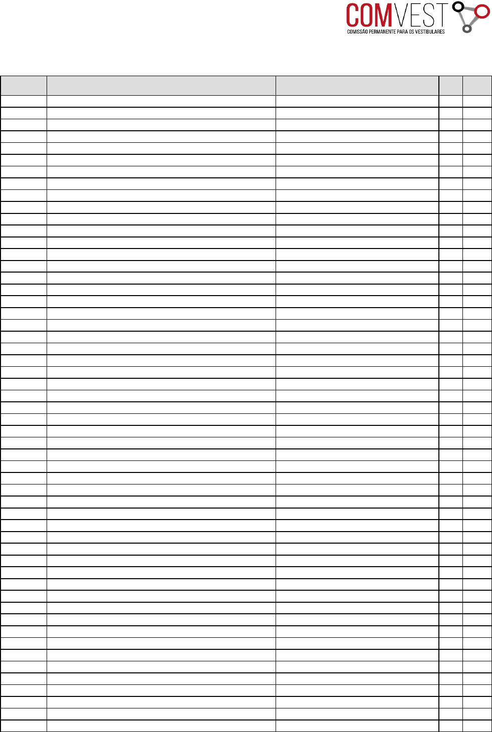 Veja, no final da tabela, o endereço completo do local onde será realizada a prova. Inscrição Nome Cidade / Prova Sala Lugar 194000036 ABNEGO COSTOLIO INACIO CAMPINAS-SP 1 1 194006911 ADANA ORLENE DELGADO DA SILVA SAO GABRIEL DA CACHOEIRA-AM 1 1 194006492 ADELMARA GABRIEL DA SILVA SAO GABRIEL DA CACHOEIRA-AM 1 2 194005499 ADIANA BILITAO BIBIANO MANAUS-AM 1 1 194003868 ADILCE JOELMA VEIGA FERRAZ CAMPINAS-SP 1 2 194008092 ADILSON SILVEIRA CAMPINAS-SP 1 3 194003615 ADONIAS OHXO MANAUS-AM 1 2 194001787 ADRIANA GOMES FRANCA SAO GABRIEL DA CACHOEIRA-AM 1 3 194001688 ADRIANE NAYNE LEAO NASCIMENTO MANAUS-AM 1 3 194007280 AGHATA CRISTINA VIEIRA LOPES SAO GABRIEL DA CACHOEIRA-AM 1 4 194001855 AHUAUGU KUIKURO CAMPINAS-SP 1 4 194006607 ALAIR DE JESUS PENA SAO GABRIEL DA CACHOEIRA-AM 1 5 194005154 ALBERTA MIRANDA DELGADO SAO GABRIEL DA CACHOEIRA-AM 1 6 194007426 ALCIMAR GALVAO MASSA SAO GABRIEL DA CACHOEIRA-AM 1 7 194000142 ALCINEIDE MOREIRA CORDEIRO SAO GABRIEL DA CACHOEIRA-AM 1 8 194003851 ALCIONES JANUARIO PEREIRA MANAUS-AM 1 4 194007631 ALCIR BATISTA COSTA SAO GABRIEL DA CACHOEIRA-AM 1 9 194000692 ALDIANE MOREIRA CORDEIRO SAO GABRIEL DA CACHOEIRA-AM 1 10 194005772 ALDNEIA MARCELINO DA SILVA SAO GABRIEL DA CACHOEIRA-AM 1 11 194005130 ALDO FERREIRA CAMPINAS-SP 1 5 194006973 ALDRIM PONTES ARAUJO SAO GABRIEL DA CACHOEIRA-AM 1 12 194005949 ALESSANDRA SANCHES CASTILHO SAO GABRIEL DA CACHOEIRA-AM 1 13 194007341 ALESSANDRO LUCIANO MACHADO SAO GABRIEL DA CACHOEIRA-AM 1 14 194000494 ALEX JOVINO ARBINO MANAUS-AM 1 5 194006454 ALEXANDRA ALVES FERRAZ MANAUS-AM 1 6 194001831 ALEXANDRO GOMES DE LIMA CAMPINAS-SP 1 6 194003950 ALEXIA GABRIELLE MIGUEL PINTO SAO GABRIEL DA CACHOEIRA-AM 1 15 194002490 ALICE MARCELLY DE OLIVEIRA SOBRINHO SAO GABRIEL DA CACHOEIRA-AM 1 16 194005703 ALIOMARA CORDEIRO DE LIMA SAO GABRIEL DA CACHOEIRA-AM 1 17 194006041 ALIPIO CALIXTRATO CANDIDO SAO GABRIEL DA CACHOEIRA-AM 1 18 194002216 ALKSON BATISTA DOURADOS-MS 1 1 194001350 AMANDA DA SILVA PEREIRA RECIFE-PE 1 1 194007099 AMANDA DE JESUS PIMENTEL CALDAS SAO GABRIEL DA CACHOEIRA-AM 1 19 194004830 AMANDA LIPU SAMPAIO CAMPINAS-SP 1 7 194003516 AMARINO CANDIDO LANA MESQUITA SAO GABRIEL DA CACHOEIRA-AM 1 20 194006478 ANA BEATRIZ SANTOS DOS SANTOS MANAUS-AM 1 7 194008207 ANA BEATRIZ VIEIRA ROCHA CAMPINAS-SP 1 8 194005918 ANA JULIA DE SA LEAL RECIFE-PE 1 2 194000838 ANA KATIA CASTILHO FREITAS SAO GABRIEL DA CACHOEIRA-AM 1 21 194004205 ANA MARIA ALVES DA SILVA RECIFE-PE 1 3 194004021 ANA MILKA MENDES CAMPINAS-SP 1 9 194006850 ANA PAULA SILVA MORAIS SAO GABRIEL DA CACHOEIRA-AM 1 22 194003806 ANANJARA ANTONIO INDUBRASIL CAMPINAS-SP 1 10 194007884 ANDERSON EMANUEL MARANHAO VASCONCELOS MANAUS-AM 1 8 194005765 ANDERSON JESUS VIANA ARANTES MANAUS-AM 1 9 194007006 ANDRE LUIZ BORGES DA SILVA MANAUS-AM 1 10 194005420 ANDREIA CORDEIRO CRUZ SAO GABRIEL DA CACHOEIRA-AM 1 23 194002353 ANDREY KIMOURA ARAUJO REIS SAO GABRIEL DA CACHOEIRA-AM 1 24 194003738 ANDREZA RODRIGUES DELGADO SAO GABRIEL DA CACHOEIRA-AM 1 25 194001817 ANGELO GABRIEL SANCHES CASTILHO SAO GABRIEL DA CACHOEIRA-AM 1 26 194003486 ANTHONY GONCALVES CORDEIRO SAO GABRIEL DA CACHOEIRA-AM 1 27 194004366 ANTONIO CARLOS MELGUEIRO PONTES FILHO MANAUS-AM 1 11 194005758 ANTONIO GERDISON MELGUEIRO MUNIZ SAO GABRIEL DA CACHOEIRA-AM 1 28 194007051 ANY MENDES CARVALHO MANAUS-AM 1 12 Vestibular Indígena 2019 Locais de Prova Veja, no final da tabela, o endereço completo do local onde será realizada a prova. Inscrição Nome Cidade / Prova Sala Lugar Vestibular Indígena 2019 Locais de Prova 194006270 ARCELINA PERDONO MARTINS SAO GABRIEL DA CACHOEIRA-AM 1 29 194008009 ARLEQUIM DA SILVA BENJAMIM SAO GABRIEL DA CACHOEIRA-AM 1 30 194003844 ARLINDO ALEMAO GREGORIO MANAUS-AM 1 13 194002896 ARLISSON MARINHO FERRAZ SAO GABRIEL DA CACHOEIRA-AM 1 31 194007655 AUXILIADORA DOMINGAS CARDOSO MANAUS-AM 1 14 194006706 AUXILIADORA FERREIRA FIGUEIREDO SAO GABRIEL DA CACHOEIRA-AM 1 32 194007440 BENJAMIN FERREIRA LIMA SAO GABRIEL DA CACHOEIRA-AM 1 33 194005437 BIANCA ALDECIA BITENCOURT FONTES SAO GABRIEL DA CACHOEIRA-AM 1 34 194006348 BONIFACIO DE LIMA BRAZAO SAO GABRIEL DA CACHOEIRA-AM 1 35 194007211 BRASILEIA PENHA BARRETO SAO GABRIEL DA CACHOEIRA-AM 2 1 194003691 BRENDA ANDRADE DA CRUZ SAO GABRIEL DA CACHOEIRA-AM 2 2 194002377 BRUNAYRA MAIA SAMPAIO SAO GABRIEL DA CACHOEIRA-AM 2 3 194002599 BRUNO GABRIEL HENRIQUE DA SILVA RECIFE-PE 1 4 194007709 BRUNO MAIAWAI SUYA TRUMAI CAMPINAS-SP 1 11 194003769 BRUNO MAX DE MELLO SOUZA RECIFE-PE 1 5 194006058 BRUNO VICTOR RODRIGUES DE LIMA SAO GABRIEL DA CACHOEIRA-AM 2 4 194000043 CAIQUE SANTOS FAUSTINO CAMPINAS-SP 1 12 194002339 CAMILA ELIZA FELIPE DA SILVA SAO GABRIEL DA CACHOEIRA-AM 2 5 194002155 CARLOS LEIONI SAMPAIO VELOSO SAO GABRIEL DA CACHOEIRA-AM 2 6 194007198 CARLOS ROBERTO LIMA ORJUELA SAO GABRIEL DA CACHOEIRA-AM 2 7 194005925 CAROLINE LIZARDO DA SILVA SAO GABRIEL DA CACHOEIRA-AM 2 8 194000258 CAUA NOBREGA DA CRUZ MANAUS-AM 1 15 194002315 CELSO RUDNEY LIZARDO SAO GABRIEL DA CACHOEIRA-AM 2 9 194005444 CLAUDEMIR CORDEIRO SAO GABRIEL DA CACHOEIRA-AM 2 10 194005888 CLAUDIA ARAI MARIANO AQUILES CAMPINAS-SP 1 13 194004557 CLEICIANE ALGUSTINHO DO NASCIMENTO MANAUS-AM 1 16 194003974 CLEICIANE TEIXEIRA MOURAO SAO GABRIEL DA CACHOEIRA-AM 2 11 194004090 CLEIDIANA PENHA BARRETO SAO GABRIEL DA CACHOEIRA-AM 2 12 194006263 CLENIO TSEREBUTUWE CAMPINAS-SP 1 14 194003295 CLEODEMAR ALISON DOS SANTOS PENA SAO GABRIEL DA CACHOEIRA-AM 2 13 194005178 CLEOVANIA BRAZAO NEVES SAO GABRIEL DA CACHOEIRA-AM 2 14 194002384 CLEYCE MAIA SAMPAIO SAO GABRIEL DA CACHOEIRA-AM 2 15 194001275 CLEYMARA DE SOUZA FERREIRA MANAUS-AM 1 17 194003714 CRISTIANO JOSE MONTEIRO MARINHO SAO GABRIEL DA CACHOEIRA-AM 2 16 194001572 DAIANE MICHELLE FERREIRA DA SILVA RECIFE-PE 1 6 194002773 DANIELA PATRICIA VILLEGAS BARBOSA SAO GABRIEL DA CACHOEIRA-AM 2 17 194006140 DANIELA RODRIGUES ANDRADE SAO GABRIEL DA CACHOEIRA-AM 2 18 194006843 DANIELE PEDROSA ARAUJO SAO GABRIEL DA CACHOEIRA-AM 2 19 194005208 DANYELLE CRISTINA DE SA SILV