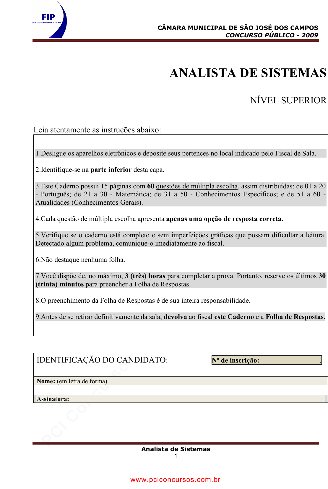 pcimarkpci MDAwMDowMDAwOjAwMDA6MDAwMDowMDAwOmZmZmY6MzZlOTpjMjU5:RnJpLCAxNyBTZXAgMjAyMSAxMjo0OToyNiAtMDMwMA== CÂMARA MUNICIPAL DE SÃO JOSÉ DOS CAMPOS CONCURSO PÚBLICO - 2009 Analista de Sistemas 1 ANALISTA DE SISTEMAS NÍVEL SUPERIOR Leia atentamente as instruções abaixo: 1.Desligue os aparelhos eletrônicos e deposite seus pertences no local indicado pelo Fiscal de Sala. 2.Identifique-se na parte inferior desta capa. 3.Este Caderno possui 15 páginas com 60 questões de múltipla escolha, assim distribuídas: de 01 a 20 - Português; de 21 a 30 - Matemática; de 31 a 50 - Conhecimentos Específicos; e de 51 a 60 - Atualidades (Conhecimentos Gerais). 4.Cada questão de múltipla escolha apresenta apenas uma opção de resposta correta. 5.Verifique se o caderno está completo e sem imperfeições gráficas que possam dificultar a leitura. Detectado algum problema, comunique-o imediatamente ao fiscal. 6.Não destaque nenhuma folha. 7.Você dispõe de, no máximo, 3 (três) horas para completar a prova. Portanto, reserve os últimos 30 (trinta) minutos para preencher a Folha de Respostas. 8.O preenchimento da Folha de Respostas é de sua inteira responsabilidade. 9.Antes de se retirar definitivamente da sala, devolva ao fiscal este Caderno e a Folha de Respostas. IDENTIFICAÇÃO DO CANDIDATO: Nº de inscrição: . Nome: (em letra de forma) Assinatura: www.pciconcursos.com.br pcimarkpci MDAwMDowMDAwOjAwMDA6MDAwMDowMDAwOmZmZmY6MzZlOTpjMjU5:RnJpLCAxNyBTZXAgMjAyMSAxMjo0OToyNiAtMDMwMA== CÂMARA MUNICIPAL DE SÃO JOSÉ DOS CAMPOS CONCURSO PÚBLICO - 2009 Analista de Sistemas 2 PORTUGUÊS Para responder às seis questões seguintes, leia o texto abaixo. LEITE DERRAMADO (Chico Buarque) Não sei por que você não me alivia a dor. Todo dia a senhora levanta a persiana com bruteza e joga sol no meu rosto. Não sei que graça pode achar nos meus esgares, é uma pontada cada vez que respiro. Às vezes aspiro fundo e encho os pulmões de um ar insuportável, para ter alguns segundos de conforto, expelindo a dor. Mas bem antes da doença e da velhice, talvez minha vida já fosse um pouco assim, uma dorzinha chata a me espetar o tempo todo e de repente uma lambada atroz. E qualquer coisa que eu recorde agora, vai doer, a memória é uma vasta ferida. [...] Eu próprio poderia arcar com viagem e tratamento no estrangeiro, se o seu marido não me tivesse arruinado. Poderia me estabelecer no estrangeiro, passar o resto dos meus dias em Paris. Se me desse na veneta, poderia morrer na mesma cama do Ritz onde dormi quando menino. Porque nas férias de verão o seu avô, meu pai, sempre me levava à Europa de vapor. Mais tarde, cada vez que eu via um deles ao largo, na rota da Argentina, chamava sua mãe e apontava: lá vai Arlanza!, o Cap Polonio!, o Lutétia!, enchia a boca para contar como era um transatlântico por dentro. Sua mãe nunca tinha visto um navio de perto, depois de casada ela mal saía de Copacabana. E quando lhe anunciei que iríamos em breve ao cais do porto, para receber o engenheiro francês, ela se fez de rogada. Porque você era recém-nascida, e ela não podia largar a criança e coisa e tal, mas logo tomou o bonde para cidade e cortou os cabelos à la garçonne. [...] E quando vi sua mãe naquele estado, falei, você não vai. Por quê, ela perguntou com voz fina, e não lhe dei satisfação, peguei meu chapéu e saí. Nem parei para pensar de onde vinha a minha raiva repentina, só senti que era alaranjada a raiva cega que tive da alegria dela. E vou deixar de falação porque a dor só faz piorar. (Fonte: BUARQUE, Chico. Leite derramado. São Paulo: Companhia das Letras, 2009. p. 10-12) 01. Assinale a única alternativa correta. Após a análise do contexto e das coesões textuais presentes no texto, pode-se afirmar que: a) a mulher que todo dia levanta a persiana é a esposa do narrador. b) quem levava o narrador à Europa era o avô de sua irmã. c) a mãe da recém-nascida nunca tinha visto um navio de perto. d) o narrador é neto do homem que o arruinou. e) o engenheiro recebido no cais do porto é avô da recém-nascida. 02. Assinale a única alternativa correta. Com relação ao narrador, pode-se afirmar que: a) ele é doente, e a enfermeira sempre o agride, ao invés de aliviar suas dores. b) ele quer ser levado por seu avô para morrer em um hotel em Paris. c) ele relembra o ciúmes que tinha de sua esposa, pois ela tivera uma filha com um engenheiro. d) ele é um homem velho e doente, que depende de outros e rememora tristezas de sua vida. e) ele é um engenheiro arruinado, e a história é centrada nas lembranças de sua vida com seu pai. 03. O texto apresenta características que possibilitariam sua classificação como: a) uma fábula. b) um romance. c) um poema. d) uma canção. e) uma anedota. www.pciconcursos.com.br pcimarkpci MDAwMDowMDAwOjAwMDA6MDAwMDowMDAwOmZmZmY6MzZlOTpjMjU5:RnJpLCAxNyBTZXAgMjAyMSAxMjo0OToyNiAtMDMwMA== CÂMARA MUNICIPAL DE SÃO JOSÉ DOS CAMPOS CONCURSO PÚBLICO - 2009 Analista de Sistemas 3 04. O texto apresenta premissas que possibilitam observarmos que ele está fundamentado no raciocínio lógico: a) hiperativo. b) indutivo. c) emotivo. d) dedutivo. e) permissivo. 05. Na frase: “[...] senti que era alaranjada a raiva cega que tive da alegria dela [...]”, encontra-se uma oposição de sentimentos que poderia ser fundamentada nos seguintes antônimos: a) alaranjado / amarelado. b) perturbação / tranquilidade. c) ódio / devoção. d) laranja / maçã. e) escuridão / ganância. 06. Observe a sequência de frases abaixo e responda a seguir. (1) Porque nas férias de verão o seu avô, meu pai, sempre me levava à Europa de vapor. (2) Porque você era recém-nascida [...]. (3) Por quê, ela perguntou com voz fina, e não lhe dei satisfação [...]. Comparando-as, percebe-se que: a) em (1) e (2), encontram-se afirmações; em (3), uma interrogação narrada de modo indireto. b) em (1), (2) e (3), encontram-se interrogações narradas de mod
