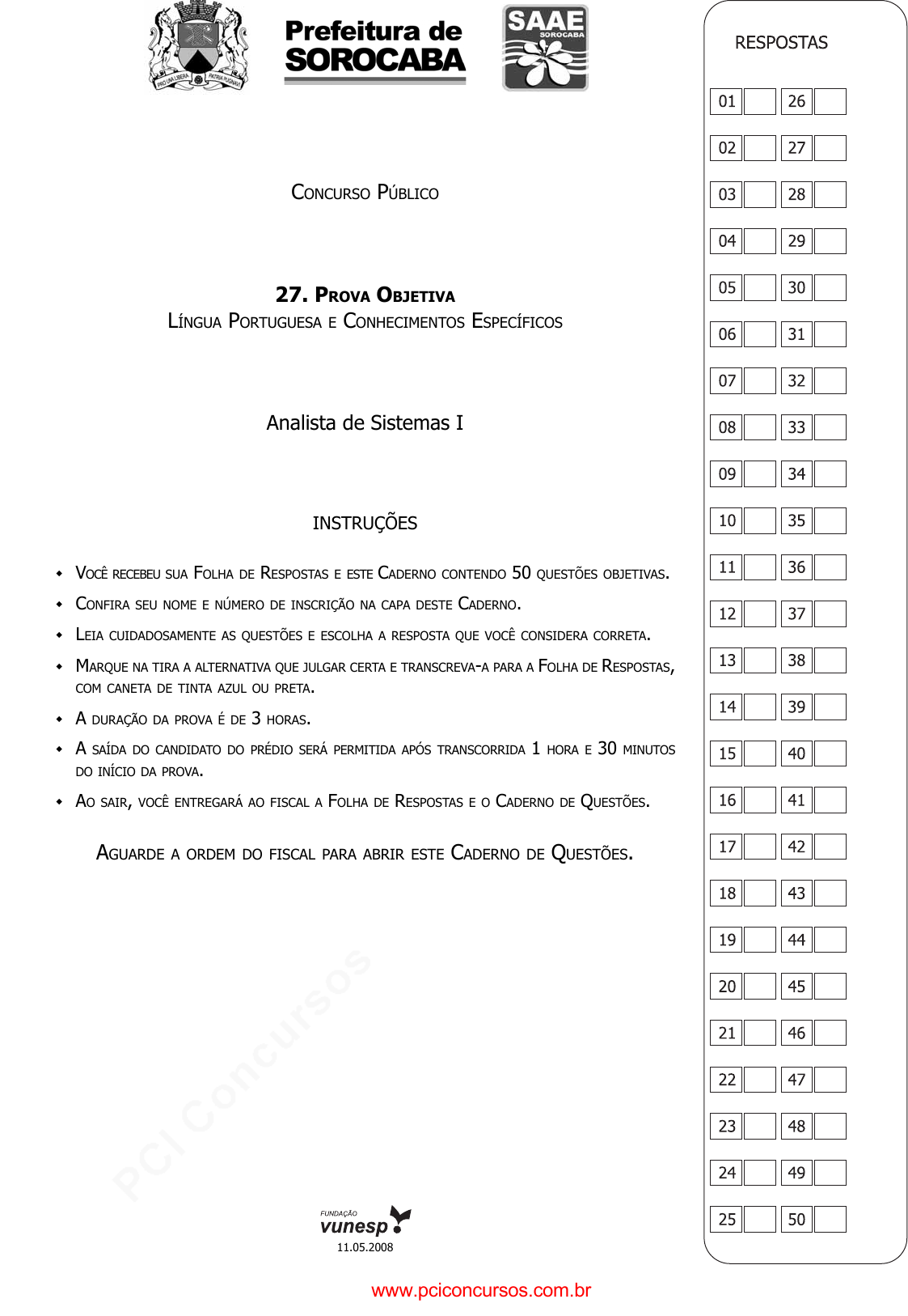 pcimarkpci MDAwMDowMDAwOjAwMDA6MDAwMDowMDAwOmZmZmY6MzZlOTpjMjU5:RnJpLCAxNyBTZXAgMjAyMSAxMzoxMDozMiAtMDMwMA== CONCURSO PÚBLICO 27. PROVA OBJETIVA LÍNGUA PORTUGUESA E CONHECIMENTOS ESPECÍFICOS Analista de Sistemas I INSTRUÇÕES VOCÊ RECEBEU SUA FOLHA DE RESPOSTAS E ESTE CADERNO CONTENDO 50 QUESTÕES OBJETIVAS. CONFIRA SEU NOME E NÚMERO DE INSCRIÇÃO NA CAPA DESTE CADERNO. LEIA CUIDADOSAMENTE AS QUESTÕES E ESCOLHA A RESPOSTA QUE VOCÊ CONSIDERA CORRETA. MARQUE NA TIRA A ALTERNATIVA QUE JULGAR CERTA E TRANSCREVA-A PARA A FOLHA DE RESPOSTAS, COM CANETA DE TINTA AZUL OU PRETA. A DURAÇÃO DA PROVA É DE 3 HORAS. A SAÍDA DO CANDIDATO DO PRÉDIO SERÁ PERMITIDA APÓS TRANSCORRIDA 1 HORA E 30 MINUTOS DO INÍCIO DA PROVA. AO SAIR, VOCÊ ENTREGARÁ AO FISCAL A FOLHA DE RESPOSTAS E O CADERNO DE QUESTÕES. AGUARDE A ORDEM DO FISCAL PARA ABRIR ESTE CADERNO DE QUESTÕES. 11.05.2008 www.pciconcursos.com.br pcimarkpci MDAwMDowMDAwOjAwMDA6MDAwMDowMDAwOmZmZmY6MzZlOTpjMjU5:RnJpLCAxNyBTZXAgMjAyMSAxMzoxMDozMiAtMDMwMA== 2PMSO-SAAE-0801/27-AnalistaSistemas-I www.pciconcursos.com.br pcimarkpci MDAwMDowMDAwOjAwMDA6MDAwMDowMDAwOmZmZmY6MzZlOTpjMjU5:RnJpLCAxNyBTZXAgMjAyMSAxMzoxMDozMiAtMDMwMA== 3 PMSO-SAAE-0801/27-AnalistaSistemas-I LÍNGUA PORTUGUESA Leia o texto para responder às questões de números 01 a 10. Sobre pais e filhos “Por que as crianças hoje são tão malcriadas e os adolescentes tão agressivos?” A pergunta mexeu com todos. Alguns aplaudiram, outros de- ram risada (solidária, não irônica), e pareceu correr pela sala uma onda de alívio: o problema não era a dor secreta de cada um, mas uma aflição geral. Minha resposta não foi nada sofisticada. Saltou espontânea de trás de tudo o que li sobre educação e psicologia: “Porque a gente deixa.” E a gente deixa porque talvez uma generalizada troca de papéis nos confunda, por exemplo, a que ocorre entre público e privado. Vivemos numa ânsia de expor o que pensamos sobre os outros, achando que nos resguardamos da opinião alheia. No entanto, essa é uma forma de botar a cara na janela, tornar-se cabide dos fantas- mas alheios – uma verdade mais contundente do que imaginam os que nunca se debruçaram em nenhum parapeito.(...) Filhos malcriados e agressivos... O problema da autoridade em crise não é do vizinho, não acontece no exterior, não é con- fortavelmente longínquo. É nosso. Parece que criamos um bando de angustiados, mais do que seria natural. Sim, natural, pois, sobretudo na juventude, plena de incertezas e objeto de pressões de toda sorte, uma boa dose de angústia é do jogo e faz bem. Mas quando isso nos desestabiliza, a nós, adultos, e nos isola desses de quem estamos ainda cuidando, a quem devemos atenção e carinho, braço e abraço, é porque, atordoados pelo excesso de psicologismo barato, talvez tenhamos desaprendido a dizer não. Nem distinguimos quando se devia dizer sim. Estamos tão deso- rientados quanto esses que têm vinte, trinta anos menos do que nós. Assim é instalada a inversão, e esta pode ser bem dolorosa. Muitas vezes crianças são excessivamente malcriadas e adolescentes agressivos demais porque têm medo. Ser insolente, testar a autoridade adulta, quebrar a cara e bater pé, tudo isso faz parte do crescimento, da busca saudável de um lugar no mundo. Mas não ter limites é assustador. Ser superprotegido fragiliza. O mundo é informe, quando se está começando a caminhar por ele: quem poderia sugerir formas, apontar caminhos, discutir questões, escutar e dialogar está tão inseguro quanto os que mal acabaram de nascer. Teorias mal explicadas, mal digeridas e mais mal aplicadas geraram o medo de magoar, de afastar, de “perder” o filho. A fuga da responsabilidade, o receio de desagradar (todos temos de ser bonzinhos) aliam-se ao conformismo, o “hoje em dia é assim mes- mo.” Ninguém mais quer ser responsável: é cansativo, é tedioso, dá trabalho, causa insônia. Queremos ser amiguinhos, mas os filhos precisam de pais. E, intuindo nossa aflição, esperneiam, agridem, se agridem – talvez por não confiarem o suficiente em nós. Ter um filho é, necessariamente, ser responsável. Ensinar numa escola é ser responsável. Estar vivo, enfim, é uma grave responsabilidade. Não basta tentar salvar a própria pele nessa guerrilha social, econômica, ética e concreta em que estamos metidos. Trata-se de ter ao menos um pequeno facho de confiança, generosidade e experiência, e colocá-lo nas mãos das crianças e dos jovens que, queiram eles ou não, se voltam para nós – antes de se voltarem contra nós. (Lya Luft, Veja, 16.06.2004. Adaptado) 01. Assinale a alternativa correta sobre o texto. (A) A pergunta sobre por que as crianças são malcriadas causou na sala um sentimento de contrariedade generalizado. (B) As influências do espaço público são determinantes para o desencadeamento da agressividade nos adolescentes. (C) O problema da autoridade em crise circunscreve-se a pais oriundos de famílias problemáticas e desestruturadas. (D) As fronteiras entre público e privado estão, hoje, visi- velmente demarcadas, no que se refere à exposição dos sentimentos. (E) Diante das incertezas e das pressões mundanas, torna-se salutar certa dose de angústia por parte dos jovens. 02. A inversão a que se refere a autora, no quinto parágrafo, decorre do fato de os adultos (A) adotarem, com conhecimento de causa, critérios psico- lógicos adequados na orientação aos jovens em geral. (B) resistirem a novas técnicas de conduta, tendo em vista a velocidade com que as mudanças ocorrem. (C) selecionarem métodos de aprendizagem compatíveis com as reais necessidades dos jovens. (D) terem perdido os parâmetros a serem oferecidos à juven- tude como modelos de conduta. (E) se incumbirem cada vez mais do papel de orientadores seguros e responsáveis da juventude. 03. Assinale a alternativa correta quanto ao aproveitamento que os adultos fizeram das teorias. (A) Seguindo ao 