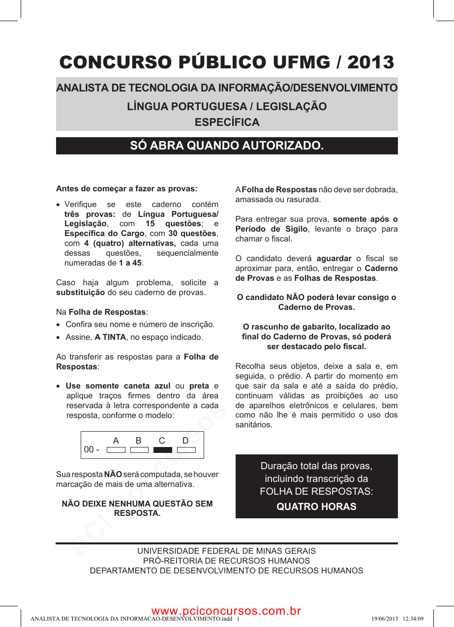 3CONCURSO PÚBLICO UFMG/2013 PROVA DE LÍNGUA PORTUGUESA/LEGISLAÇÃO