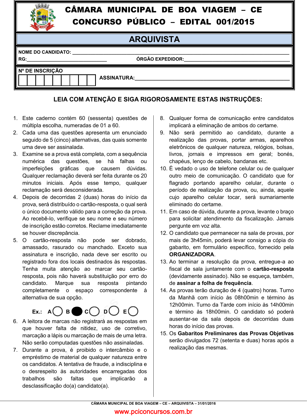 pcimarkpci MDAwMDowMDAwOjAwMDA6MDAwMDowMDAwOmZmZmY6MzZlOTpjMjU5:RnJpLCAxNyBTZXAgMjAyMSAyMDo1NjoxNSAtMDMwMA== CÂMARA MUNICIPAL DE BOA VIAGEM – CE – ARQUIVISTA – 31/01/2016 CÂMARA MUNICIPAL DE BOA VIAGEM – CE CONCURSO PÚBLICO – EDITAL 001/2015 ARQUIVISTA NOME DO CANDIDATO: ____________________________________________________________________________________ RG:_______________________________ ÓRGÃO EXPEDIDOR:_________________________________________ Nº DE INSCRIÇÃO ASSINATURA:______________________________________________________ LEIA COM ATENÇÃO E SIGA RIGOROSAMENTE ESTAS INSTRUÇÕES: 1. Este caderno contém 60 (sessenta) questões de múltipla escolha, numeradas de 01 a 60. 2. Cada uma das questões apresenta um enunciado seguido de 5 (cinco) alternativas, das quais somente uma deve ser assinalada. 3. Examine se a prova está completa, com a sequência numérica das questões, se há falhas ou imperfeições gráficas que causem dúvidas. Qualquer reclamação deverá ser feita durante os 20 minutos iniciais. Após esse tempo, qualquer reclamação será desconsiderada. 4. Depois de decorridas 2 (duas) horas do início da prova, será distribuído o cartão-resposta, o qual será o único documento válido para a correção da prova. Ao recebê-lo, verifique se seu nome e seu número de inscrição estão corretos. Reclame imediatamente se houver discrepância. 5. O cartão-resposta não pode ser dobrado, amassado, rasurado ou manchado. Exceto sua assinatura e inscrição, nada deve ser escrito ou registrado fora dos locais destinados às respostas. Tenha muita atenção ao marcar seu cartão- resposta, pois não haverá substituição por erro do candidato. Marque sua resposta pintando completamente o espaço correspondente à alternativa de sua opção. Ex.: A B C D E 6. A leitora de marcas não registrará as respostas em que houver falta de nitidez, uso de corretivo, marcação a lápis ou marcação de mais de uma letra. Não serão computadas questões não assinaladas. 7. Durante a prova, é proibido o intercâmbio e o empréstimo de material de qualquer natureza entre os candidatos. A tentativa de fraude, a indisciplina e o desrespeito às autoridades encarregadas dos trabalhos são faltas que implicarão a desclassificação do(a) candidato(a). 8. Qualquer forma de comunicação entre candidatos implicará a eliminação de ambos do certame. 9. Não será permitido ao candidato, durante a realização das provas, portar armas, aparelhos eletrônicos de qualquer natureza, relógios, bolsas, livros, jornais e impressos em geral; bonés, chapéus, lenço de cabelo, bandanas etc. 10. É vedado o uso de telefone celular ou de qualquer outro meio de comunicação. O candidato que for flagrado portando aparelho celular, durante o período de realização da prova, ou, ainda, aquele cujo aparelho celular tocar, será sumariamente eliminado do certame. 11. Em caso de dúvida, durante a prova, levante o braço para solicitar atendimento da fiscalização. Jamais pergunte em voz alta. 12. O candidato que permanecer na sala de provas, por mais de 3h45min, poderá levar consigo a cópia do gabarito, em formulário específico, fornecido pela ORGANIZADORA. 13. Ao terminar a resolução da prova, entregue-a ao fiscal de sala juntamente com o cartão-resposta (devidamente assinado). Não se esqueça, também, de assinar a folha de frequência. 14. As provas terão duração de 4 (quatro) horas. Turno da Manhã com início às 08h00min e término às 12h00min. Turno da Tarde com início às 14h00min e término às 18h00min. O candidato só poderá ausentar-se da sala depois de decorridas duas horas do início das provas. 15. Os Gabaritos Preliminares das Provas Objetivas serão divulgados 72 (setenta e duas) horas após a realização das mesmas. www.pciconcursos.com.br pcimarkpci MDAwMDowMDAwOjAwMDA6MDAwMDowMDAwOmZmZmY6MzZlOTpjMjU5:RnJpLCAxNyBTZXAgMjAyMSAyMDo1NjoxNSAtMDMwMA== 2 CÂMARA MUNICIPAL DE BOA VIAGEM – CE – ARQUIVISTA – 31/01/2016 www.pciconcursos.com.br pcimarkpci MDAwMDowMDAwOjAwMDA6MDAwMDowMDAwOmZmZmY6MzZlOTpjMjU5:RnJpLCAxNyBTZXAgMjAyMSAyMDo1NjoxNSAtMDMwMA== 3 CÂMARA MUNICIPAL DE BOA VIAGEM – CE – ARQUIVISTA – 31/01/2016 CONHECIMENTOS GERAIS Leia o Texto para responder às questões 1 a 5. Tragédia em Mariana: "É a maior catástrofe ambiental do Brasil", diz ministra A ministra do Meio Ambiente, Izabella Teixeira, disse nesta quinta-feira (19) que o rompimento da barragem de rejeitos de mineração da Samarco, em Mariana (MG), há duas semanas, é a maior tragédia ambiental da história do Brasil. “É a maior catástrofe ambiental do país, isso é inegável. Eu vi o acidente. É impressionante o impacto na flora e nas atividades econômicas”, disse a ministra. "No trecho do Rio Doce em Minas, a ictiofauna [espécies de peixe em uma região] na calha do rio principal acabou". Segundo Izabella, o governo está trabalhando para reduzir os impactos no Rio Doce e no oceano. “Nós estamos desde sábado trabalhando em parceria com o Espírito Santo e com a prefeitura de Linhares. Abrimos um canal na foz do rio, que está assoreado, para facilitar a dispersão da lama”, informou. "Os peixes de superfície conseguiram migrar para alguns rios tributários, mas estão morrendo, e a fauna ribeirinha também foi impactada". A ministra informou que a onda de lama deve se espalhar por uma extensão de 9 quilômetros (km) quando chegar ao mar, após desaguar na costa do Espírito Santo, na cidade de Linhares. “Os dados de dispersão disponíveis indicam que a dispersão máxima para o sul é 6 km e a dispersão máxima para o norte é 3 km, porque as correntes marinhas ali seguem para o sul”, afirmou. O rompimento da barragem de Fundão destruiu o distrito de Bento Rodrigues e deixou mais de 900 pessoas desabrigadas. A onda de lama que se formou chegou ao Rio Doce, provocando a mortandade de peixes e impedindo o abastecimento de água em cidades de Mi