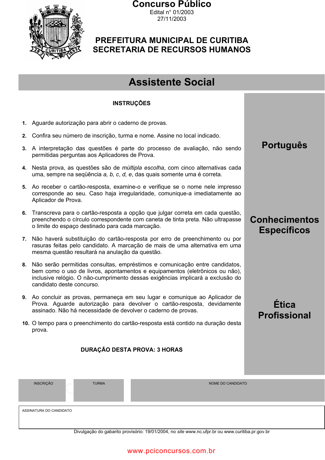 pcimarkpci MDAwMDowMDAwOjAwMDA6MDAwMDowMDAwOmZmZmY6MzZlOTpjMjU5:U2F0LCAxOCBTZXAgMjAyMSAwNDoxMTowNiAtMDMwMA== Concurso Público Edital n° 01/2003 27/11/2003 PREFEITURA MUNICIPAL DE CURITIBA SECRETARIA DE RECURSOS HUMANOS Assistente Social INSTRUÇÕES 1. Aguarde autorização para abrir o caderno de provas. 2. Confira seu número de inscrição, turma e nome. Assine no local indicado. 3. A interpretação das questões é parte do processo de avaliação, não sendo permitidas perguntas aos Aplicadores de Prova. 4. Nesta prova, as questões são de múltipla escolha, com cinco alternativas cada uma, sempre na seqüência a, b, c, d, e, das quais somente uma é correta. 5. Ao receber o cartão-resposta, examine-o e verifique se o nome nele impresso corresponde ao seu. Caso haja irregularidade, comunique-a imediatamente ao Aplicador de Prova. 6. Transcreva para o cartão-resposta a opção que julgar correta em cada questão, preenchendo o círculo correspondente com caneta de tinta preta. Não ultrapasse o limite do espaço destinado para cada marcação. 7. Não haverá substituição do cartão-resposta por erro de preenchimento ou por rasuras feitas pelo candidato. A marcação de mais de uma alternativa em uma mesma questão resultará na anulação da questão. 8. Não serão permitidas consultas, empréstimos e comunicação entre candidatos, bem como o uso de livros, apontamentos e equipamentos (eletrônicos ou não), inclusive relógio. O não-cumprimento dessas exigências implicará a exclusão do candidato deste concurso. 9. Ao concluir as provas, permaneça em seu lugar e comunique ao Aplicador de Prova. Aguarde autorização para devolver o cartão-resposta, devidamente assinado. Não há necessidade de devolver o caderno de provas. 10. O tempo para o preenchimento do cartão-resposta está contido na duração desta prova. DURAÇÃO DESTA PROVA: 3 HORAS Português Conhecimentos Específicos Ética Profissional INSCRIÇÃO TURMA NOME DO CANDIDATO ASSINATURA DO CANDIDATO Divulgação do gabarito provisório: 19/01/2004, no site www.nc.ufpr.br ou www.curitiba.pr.gov.br www.pciconcursos.com.br pcimarkpci MDAwMDowMDAwOjAwMDA6MDAwMDowMDAwOmZmZmY6MzZlOTpjMjU5:U2F0LCAxOCBTZXAgMjAyMSAwNDoxMTowNiAtMDMwMA== www.pciconcursos.com.br pcimarkpci MDAwMDowMDAwOjAwMDA6MDAwMDowMDAwOmZmZmY6MzZlOTpjMjU5:U2F0LCAxOCBTZXAgMjAyMSAwNDoxMTowNiAtMDMwMA== 3 PORTUGUÊS As questões 01 a 03 referem-se ao texto abaixo. A clonagem tem sido cercada pelo deslumbramento dirigido aos grandes feitos da ciência. No entanto, de modo ambivalente, vem também carregada de preocupações e temores. É possível estudar as peculiaridades desse processo – que desperta tanta polêmica – a partir dos lugares comuns recorrentes nas representações sobre o mesmo. O escândalo moral diante da clonagem decorre do núcleo ideológico da cultura ocidental. É importante ressaltar que esse processo jamais despertou controvérsia entre o grande público enquanto era realizado em animais bem diferentes do ser humano, como anfíbios. O advento de Dolly mudou a situação. Para os geneticistas, a clonagem de um mamífero totalmente formado significou apenas a possibilidade de reprogramar o DNA maduro para que funcionasse como DNA embrionário. Para os leigos, porém, Dolly representou a ameaça de utilização dessa técnica de clonagem de um mamífero adulto para “copiar” um ser humano. Os debates sobre o tema não condenam o avanço científico – este não é considerado bom nem mau em si mesmo. O imperativo da ciência de aliar progresso e responsabilidade, porém, vem acompanhado da percepção de que formar um clone humano é algo inevitável, porque a ciência, obtidos os meios, não se furtaria à sua aplicação, mesmo que danosa. Nesse contexto, surgem as acusações contra Antinori e Zavos: tais médicos seriam pseudocientistas, que planejariam criar monstros, como o doutor Frankenstein do livro de Mary Shelley. Isso porque a prática da clonagem humana sugere pesadelos totalitários, como a reencenação do nazismo e das experiências de Josef Mengele (representadas no filme Os meninos do Brasil pela criação de um exército de cópias de Adolf Hitler) ou a concretização do “admirável mundo novo” do romance de Aldous Huxley, com a produção de seres humanos não reconhecidos como tais – idéia também presente no filme Blade Runner, o caçador de andróides. Reagindo às críticas, Antinori pretende colocar-se no papel de Galileu Galilei, dizendo ser, como este, um cientista perseguido por interesses obscurantistas. (Ciência Hoje 176, out. 2001.) 01 - A ambivalência mencionada no início do texto diz respeito: a) à dúvida entre reconhecer ou não a clonagem como um avanço científico. b) ao escândalo provocado pela clonagem de um mamífero, com técnica que abre a possibilidade da clonagem humana. c) à polêmica gerada pela divulgação da clonagem da ovelha Dolly. *d) à oposição entre o deslumbramento e os temores provocados pela clonagem. e) às diferentes reações do público diante de animais muito diferentes do ser humano e de um mamífero. 02 - Para o autor do texto, os médicos Antinori e Zavos: a) se inspiram no doutor Frankenstein, personagem criado por Mary Shelley, e pretendem criar monstros. *b) são comparados pelos leigos às personagens de ficção criadas por Mary Shelley ou Aldous Huxley. c) não são cientistas verdadeiros, mas médicos perigosos, que pretendem reproduzir as experiências nazistas. d) são tão nocivos à humanidade quanto os personagens criados por Mary Shelley ou Aldous Huxley. e) são cientistas que, como Galileu Galilei, são perseguidos por interesses contrários ao desenvolvimento da ciência. 03 - “Nesse contexto, surgem as acusações contra Antinori e Zavos: tais médicos seriam pseudocientistas, que planejariam criar monstros, como o doutor Frankenstein do livro de Mary Shelley.” Assinale a alternativa em que a mudança na pontuação foi 