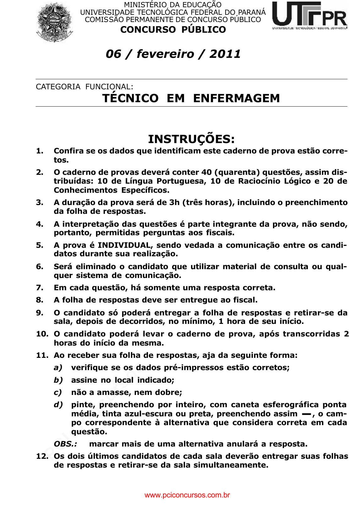 pcimarkpci MDAwMDowMDAwOjAwMDA6MDAwMDowMDAwOmZmZmY6MzZlOTpjMjU5:U2F0LCAxMSBTZXAgMjAyMSAxMjowODo1OSAtMDMwMA== MINISTÉRIO DA EDUCAÇÃO UNIVERSIDADE TECNOLÓGICA FEDERAL DO PARANÁ COMISSÃO PERMANENTE DE CONCURSO PÚBLICO CONCURSO PÚBLICO 06 / fevereiro / 2011 CATEGORIA FUNCIONAL: TÉCNICO EM ENFERMAGEM INSTRUÇÕES: 1. Confira se os dados que identificam este caderno de prova estão corre- tos. 2. O caderno de provas deverá conter 40 (quarenta) questões, assim dis- tribuídas: 10 de Língua Portuguesa, 10 de Raciocínio Lógico e 20 de Conhecimentos Específicos. 3. A duração da prova será de 3h (três horas), incluindo o preenchimento da folha de respostas. 4. A interpretação das questões é parte integrante da prova, não sendo, portanto, permitidas perguntas aos fiscais. 5. A prova é INDIVIDUAL, sendo vedada a comunicação entre os candi- datos durante sua realização. 6. Será eliminado o candidato que utilizar material de consulta ou qual- quer sistema de comunicação. 7. Em cada questão, há somente uma resposta correta. 8. A folha de respostas deve ser entregue ao fiscal. 9. O candidato só poderá entregar a folha de respostas e retirar-se da sala, depois de decorridos, no mínimo, 1 hora de seu início. 10. O candidato poderá levar o caderno de prova, após transcorridas 2 horas do início da mesma. 11. Ao receber sua folha de respostas, aja da seguinte forma: a) verifique se os dados pré-impressos estão corretos; b) assine no local indicado; c) não a amasse, nem dobre; d) pinte, preenchendo por inteiro, com caneta esferográfica ponta média, tinta azul-escura ou preta, preenchendo assim –, o cam- po correspondente à alternativa que considera correta em cada questão. OBS.: marcar mais de uma alternativa anulará a resposta. 12. Os dois últimos candidatos de cada sala deverão entregar suas folhas de respostas e retirar-se da sala simultaneamente. www.pciconcursos.com.br pcimarkpci MDAwMDowMDAwOjAwMDA6MDAwMDowMDAwOmZmZmY6MzZlOTpjMjU5:U2F0LCAxMSBTZXAgMjAyMSAxMjowODo1OSAtMDMwMA== 2 / UTFPR - Concurso Público - Edital 205/2010 LÍNGUA PORTUGUESA QUESTÃO 01 Ordene os períodos a seguir, de modo que constituam um encadeamento lógico de ideias e, ordenados, formem um texto coeso, dando continuidade ao trecho apre- sentado. O Natal além do consumismo Por Israel Téllez, da EFE http:// noticias.br.msn.com/artigo.aspx?cp- documentid=26865314 22/12/2010 14h43min (excerto) Viver o Natal como era celebrado antes da era industrial é possível. Respeitar o meio ambiente, cozinhar produtos naturais e se deixar levar pelo espírito de paz e amor é uma opção que ganha força frente ao frene- si consumista. I) "O Natal é uma espécie de teste de como vai nossa vida, pois intensifica o que estamos vivendo durante o ano todo. Enchemos nossa vida de compro- missos e realizamos coisas porque é preciso realizar, muitas vezes sem sa- ber o motivo", diz o pároco da igreja de San Alfonso María de Ligorio, em Madri. II) No entanto, Kanner acredita que é possível "restituir o Natal" e sugere al- guns pontos básicos para celebrá-lo de uma maneira mais simples e espiritual. "Comprar produtos ecológicos, comprar produtos nacionais e sobretudo o mais importante: comprar menos", afirma o psicólogo, que inclusive sugere que as pessoas se deem uma semana sem te- levisão, algo que permitirá apreciar as matizes "multicoloridas" do silêncio. III) Apesar de todo consumismo, muita gente ainda conserva o verdadeiro sen- tido das festas natalinas, de famílias a associações civis e profissionais que apelam para que a sociedade freie o ímpeto consumista. IV) O mesmo tom é utilizado por Allan Kanner, psicólogo clínico e também membro da campanha "Commercial- Free Childhood", que percebe a trans- formação "desta preciosa época em um período de compras estressantes". V) Este é o caso da associação ameri- cana "Commercial-Free Childhood" (In- fância Livre do Comércio, em tradução livre), que publicou um guia de seis páginas intitulado "Para um Natal sem consumismo". O documento reúne os depoimentos de nove pessoas de dife- rentes campos profissionais, como a educação, finanças e psicologia, que dão uma série de conselhos para "re- sistir ao apelo publicitário" e fazer com que o Natal seja mais familiar e não menos divertido. A alternativa que apresenta a sequência adequada é: A) V, III, I, II e IV. B) I, III, II, V e IV. C) III, V, I, IV e II. D) II, IV, V, III e I. E) IV, II, III, I e V. LEIA ATENTAMENTE O TEXTO A SE- GUIR QUE SERVIRÁ DE BASE PARA AS QUESTÕES DE 02 A 04. 'Amor por Contrato' satiriza o consumismo SÃO PAULO (Reuters) - Pensou numa fa- mília perfeita? Os Jones, é claro. Gente bo- nita, elegante, educada, sempre vestida im- pecavelmente, dirigindo os melhores carros, morando numa mansão decorada com tudo do bom e melhor. Ninguém consegue ser melhor do que eles. Essa é mesmo a ideia por trás dos protagonistas da comédia dra- mática 'Amor por Contrato', que tem como destaques do elenco Demi Moore e David Duchovny. Tudo é tão perfeito só por um motivo – os Jones não são uma família de verdade. Foram escolhidos a dedo para compor uma unidade familiar, que se instala numa vizi- nhança bem de vida (neste caso, um rendi- mento anual de pelo menos 100 mil dóla- res). O objetivo é um só – os Jones são ven- dedores profissionais, que alavancam a ven- da dos produtos mais caros e chiques entre os vizinhos. A boa vida deles vem daí, por- que eles ganham para isso. www.pciconcursos.com.br pcimarkpci MDAwMDowMDAwOjAwMDA6MDAwMDowMDAwOmZmZmY6MzZlOTpjMjU5:U2F0LCAxMSBTZXAgMjAyMSAxMjowODo1OSAtMDMwMA== Técnico em Enfermagem / 3 A atual composição da falsa família é Kate (Demi Moore), que é a chefe da unidade; Steve (David Duchovny), ex-vendedor de carros recém-contratado; e os 'filhos', Jenn (Amber Head) e Mick (Ben Hollingsworth). Eles são o sonho de consumo de qualquer um – não só pela aparência impecável como pela 