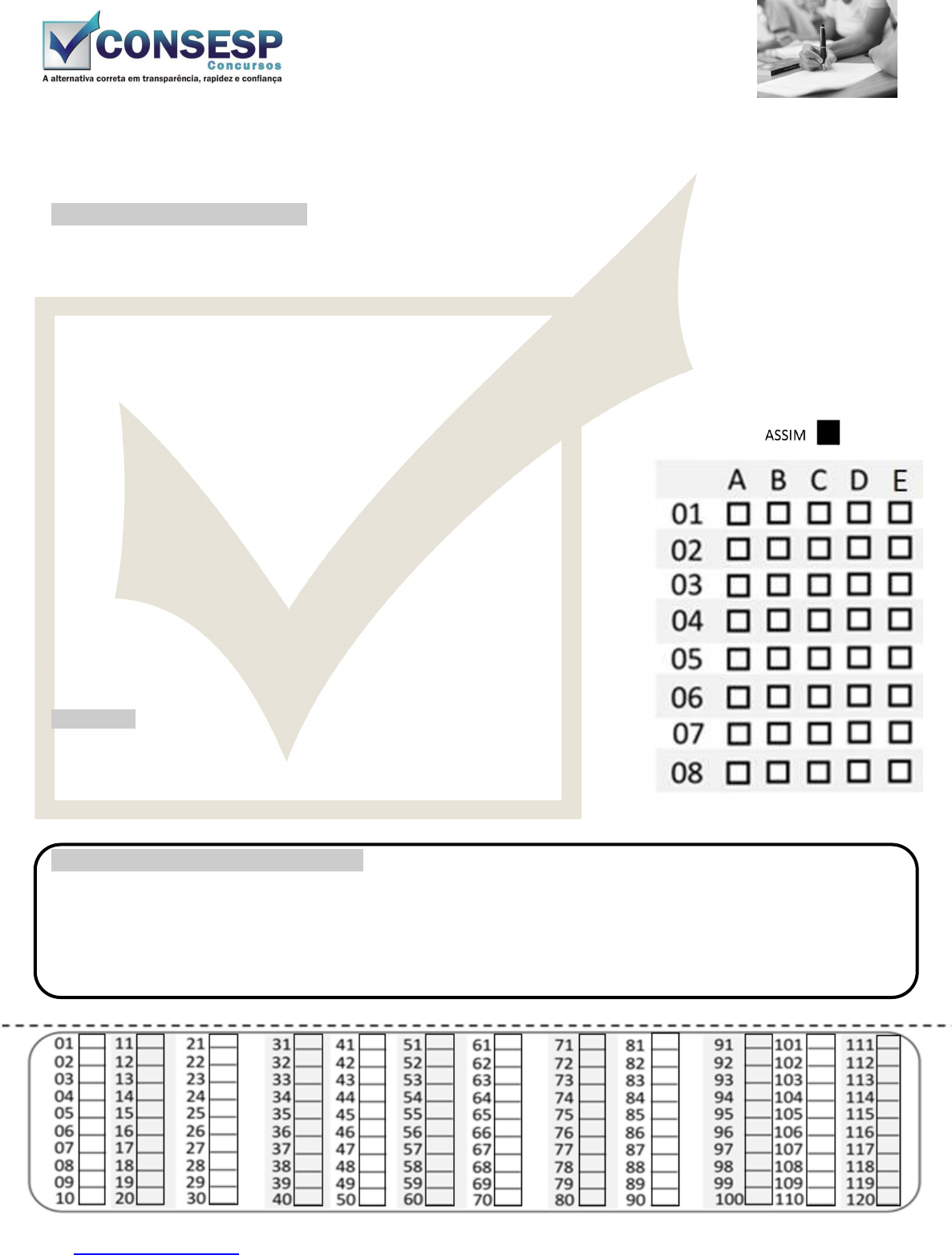 www.pciconcursos.com.br SÓ ABRA QUANDO AUTORIZADO LEIA COM ATENÇÃO AS INSTRUÇÕES ABAIXO CONFIRA O SEU CADERNO 01. Este caderno de provas contém questões de múltipla escolha dispostas em ordem numérica, com apenas uma alternativa correta. 02. Confira seu caderno quando o Fiscal de Sala autorizar, pois não lhe será entregue outro, exceto no caso do item 3. 03. Se houver falhas: folhas em branco, páginas trocadas, falta de questão, má impressão, levante o braço. O Fiscal de Sala trocará seu caderno. 04. Confira se o caderno de questões corresponde ao cargo para o qual se inscreveu. INSTRUÇÕES E CUIDADOS NO PREENCHIMENTO DA FOLHA DE RESPOSTAS Como preench er: ATENÇÃO: 01. Use para rascunho as partes em branco do caderno. 02. Não será permitido qualquer outro material sobre a carteira, que não seja o da prova. PREENCHIMENTO OBRIGATÓRIO nº Insc. _____________ _______________________________________________________________________________________________ Nome por extenso CARGO: AUXILIAR DE ADMINISTRAÇÃO (PMS) Este gabarito será destacado somente pelo Fiscal de Sala no momento da entrega da Prova Os candidatos aprovados poderão obter o CERTIFICADO DE APROVAÇÃO deste concurso no site www.consesp.com.br mediante pagamento de taxa. O envio será feito apó s a homologação do resultado. 01. Confira cuidadosamente seus dados na Folha de Respostas, assine-a, e comunique ao Fiscal de Sala em caso de alguma divergência, não faça qualquer alteração em sua folha. 02. Use caneta esferográfica de tinta azul ou preta. 03. As Folhas de Respostas preenchidas a lápis, não serão aceitas. 04. Preencha todos os espaços corretamente, a Leitora Óptica é sensível a marcas escuras. 05. Ao terminar, verifique se todas as respostas foram marcadas, mais de uma resposta marcada ou rasurada, invalidará a questão. 06. Leia atentamente as instruções na Folha de Respostas. 07. Valem, exclusivamente, as respostas corretamente assinaladas na Folha de Respostas. www.pciconcursos.com.br www.pciconcursos.com.br AUXILIAR DE ADMINISTRAÇÃO (PMS) LÍNGUA PORTUGUESA 01. Assinale a alternativa em que todos os substantivos sejam simples. (A) Chuva / Livro / Guarda. (B) Floricultura / Pernilongo / Passatempo. (C) Couve-flor / Palma-de-Santa-Rita / Lápis. (D) Flor / Guarda-chuva / Arvoredo. (E) Pedreira / Guarda-copos / Folhagem. 02. “Batalhão ” é o coletivo referente ao conjunto de (A) bajuladores. (B) viajantes. (C) religiosos. (D) imigrantes. (E) soldados. 03. Aponte a alternativa que apresenta somente substantivos femininos. (A) Gênese / Eclipse / Tracoma. (B) Libido / Mousse / Comichão. (C) Estratagema / Clã / Guaraná. (D) Dó / Couve / Sentinela. (E) Derme / Aneurisma / Matiz. 04. Assinale a alternativa em que o substantivo é Comum de Dois Gêneros. (A) Dentista. (B) Jacaré. (C) Criatura. (D) Criança. (E) Cobra. 05. Aponte a alternativa que apresenta erro quanto à formação do plural. (A) Reco-reco → Reco-recos. (B) Tico-tico → Tico-ticos. (C) O bota-fora → Os bota-fora. (D) O bem-te-vi → Os bem-te-vi. (E) O bem-me-quer → Os bem-me-queres. 06. Qual é o grau aumentativo sintético de “rato ”? (A) Rato grande. (B) Ratasso. (C) Rataria. (D) Ratão. (E) Ratinho. 07. Das alternativas seguintes, indique a que apresente Adjetivo Primitivo. (A) Alagoano. (B) Entristecido. (C) Claro. (D) Azulado. (E) Ítalo-brasileiro. 08. “Ludovicense ” é o adjetivo pátrio de qual estado brasileiro? (A) Tocantins. (B) São Luís. (C) Rondônia. (D) Espírito Santo. (E) Rio Grande do Sul. 09. A qual locução abaixo, o adjetivo “apícola ” se refere? (A) De abelhas. (B) De porcos. (C) De peixes. (D) De aluno. (E) De boca. 10. Quanto ao feminino das palavras abaixo, aponte a alternativa que apresenta erro. (A) Catalão → Catalã. (B) Chorão → Chorona. (C) Beirão → Beiroa. (D) Ilhéu → Ilhoa. (E) Comilão → Comilã. 11. Quanto ao grau superlativo dos adjetivos, assinale a frase que se apresenta no Grau Superlativo Relativo de Superioridade. (A) Ele é o mais exigente de todos os irmãos. (B) Você é o menos crítico de todos. (C) Ele é demasiadamente exigente. (D) Somos excessivamente tolerantes. (E) Você é o menos passivo de todos os primos. 12. Assinale corretamente a alternativa que apresente adjetivo composto cujo segundo elemento seja um substantivo. (A) Casaco amarelo-limão. (B) Carro verde-garrafa. (C) Batom vermelho-paixão. (D) Blusa verde-bandeira. (E) Todas as alternativas estão corretas. 13. Quanto à relação das locuções adjetivas destacadas com os adjetivos entre parênteses, aponte a alternativa em que essa relação esteja incorreta. (A) Conselho de pai (= paternal). (B) Inflamação da boca (= bucal). (C) Dor de rim (= renal). (D) Sol de manhã (= maternal). (E) Amor de irmão (= fraternal). 14. O superlativo absoluto sintético de “amigo ” é (A) amiguinho. (B) amigasso. (C) amigos. (D) amicíssimo. (E) amigão. 15. Aponte a única palavra abaixo que está no diminutivo. (A) Bandidaço. (B) Partidão. (C) Timeco. (D) Gentalha. (E) Peixão. MATEMÁTICA 16. Assinale a alternativa que apresenta uma fração equivalente ao valor 0,25. (A) 160 30 (B) 150 4 (C) 120 4 (D) 160 40 (E) 110 30 17. Em um jardim há três tipos de flores: rosas, margaridas e bromélias. No total há 500 flores. Se 150 são rosas e 180 são bromélias, qual é a razão entre o número de margaridas e o número de rosas? (A) 0,84 (B) 1,13 www.pciconcursos.com.br (C) 2,15 (D) 3,13 (E) 4,07 18. No freezer de uma geladeira, o número de carnes congeladas é proporcional a 5, assim como 85 é proporcional a 17. Quantas carnes congeladas há nesse freezer? (A) 21 carnes (B) 22 carnes (C) 23 carnes (D) 24 carnes (E) 25 carnes 19. Oito (8) horas e vinte e nove (29) minutos equivalem a (A) 30.540 segundos. (B) 31.258 segundos. (C) 32.654 segundos. (D) 33.987 segundos. (E) 34.157 segundos. 20. Qual é a porcentagem de doentes por gripe em um hospital, se há 63 doe