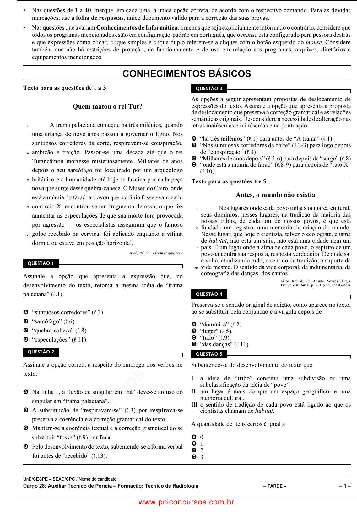 pcimarkpci MDAwMDowMDAwOjAwMDA6MDAwMDowMDAwOmZmZmY6MzZlOTpjMjU5:U2F0LCAxOCBTZXAgMjAyMSAxNjozNzowOCAtMDMwMA== UnB/CESPE – SEAD/CPC / Nome do candidato: Cargo 28: Auxiliar Técnico de Perícia – Formação: Técnico de Radiologia – TARDE – – 1 – • Nas questões de 1 a 40, marque, em cada uma, a única opção correta, de acordo com o respectivo comando. Para as devidas marcações, use a folha de respostas, único documento válido para a correção das suas provas. • Nas questões que avaliam Conhecimentos de Informática, a menos que seja explicitamente informado o contrário, considere que todos os programas mencionados estão em configuração-padrão em português, que o mouse está configurado para pessoas destras e que expressões como clicar, clique simples e clique duplo referem-se a cliques com o botão esquerdo do mouse. Considere também que não há restrições de proteção, de funcionamento e de uso em relação aos programas, arquivos, diretórios e equipamentos mencionados. CONHECIMENTOS BÁSICOS Texto para as questões de 1 a 3 Quem matou o rei Tut? A trama palaciana começou há três milênios, quando1 uma criança de nove anos passou a governar o Egito. Nos suntuosos corredores da corte, respiravam-se conspiração, ambição e traição. Passou-se uma década até que o rei4 Tutancâmon morresse misteriosamente. Milhares de anos depois o seu sarcófago foi localizado por um arqueólogo britânico e a humanidade até hoje se fascina por cada peça7 nova que surge desse quebra-cabeça. O Museu do Cairo, onde está a múmia do faraó, aprovou que o crânio fosse examinado com raio X: encontrou-se um fragmento de osso, o que fez10 aumentar as especulações de que sua morte fora provocada por agressão — os especialistas asseguram que o famoso golpe recebido na cervical foi aplicado enquanto a vítima13 dormia ou estava em posição horizontal. Istoé, 28/3/2007 (com adaptações). �������� Assinale a opção que apresenta a expressão que, no desenvolvimento do texto, retoma a mesma idéia de “trama palaciana” (R.1). A “suntuosos corredores” (R.3) B “sarcófago” (R.6) C “quebra-cabeça” (R.8) D “especulações” (R.11) �������� Assinale a opção correta a respeito do emprego dos verbos no texto. A Na linha 1, a flexão de singular em “há” deve-se ao uso do singular em “trama palaciana”. B A substituição de “respiravam-se” (R.3) por respirava-se preserva a coerência e a correção gramatical do texto. C Mantêm-se a coerência textual e a correção gramatical ao se substituir “fosse” (R.9) por fora. D Pelo desenvolvimento do texto, subentende-se a forma verbal foi antes de “recebido” (R.13). ��������� As opções a seguir apresentam propostas de deslocamento de expressões do texto. Assinale a opção que apresenta a proposta de deslocamento que preserva a correção gramatical e as relações semânticas originais. Desconsidere a necessidade de alteração nas letras maiúsculas e minúsculas e na pontuação. A “há três milênios” (R.1) para antes de “A trama” (R.1) B “Nos suntuosos corredores da corte” (R.2-3) para logo depois de “conspiração” (R.3) C “Milhares de anos depois” (R.5-6) para depois de “surge” (R.8) D “onde está a múmia do faraó” (R.8-9) para depois de “raio X” (R.10) Texto para as questões 4 e 5 Antes, o mundo não existia Nos lugares onde cada povo tinha sua marca cultural,1 seus domínios, nesses lugares, na tradição da maioria das nossas tribos, de cada um de nossos povos, é que está fundado um registro, uma memória da criação do mundo.4 Nesse lugar, que hoje o cientista, talvez o ecologista, chama de habitat, não está um sítio, não está uma cidade nem um país. É um lugar onde a alma de cada povo, o espírito de um7 povo encontra sua resposta, resposta verdadeira. De onde sai e volta, atualizando tudo, o sentido da tradição, o suporte da vida mesma. O sentido da vida corporal, da indumentária, da10 coreografia das danças, dos cantos. Ailton Krenak. In: Adauto Novaes (Org.). Tempo e história, p. 201 (com adaptações). ��������� Preserva-se o sentido original de adição, como aparece no texto, ao se substituir pela conjunção e a vírgula depois de A “domínios” (R.2). B “lugar” (R.5). C “tudo” (R.9). D “das danças” (R.11). �������� Subentende-se do desenvolvimento do texto que I a idéia de “tribo” constitui uma subdivisão ou uma subclassificação da idéia de “povo”. II um lugar é mais do que um espaço geográfico: é uma memória cultural. III o sentido de tradição de cada povo está ligado ao que os cientistas chamam de habitat. A quantidade de itens certos é igual a A 0. B 1. C 2. D 3. www.pciconcursos.com.br pcimarkpci MDAwMDowMDAwOjAwMDA6MDAwMDowMDAwOmZmZmY6MzZlOTpjMjU5:U2F0LCAxOCBTZXAgMjAyMSAxNjozNzowOCAtMDMwMA== UnB/CESPE – SEAD/CPC / Nome do candidato: Cargo 28: Auxiliar Técnico de Perícia – Formação: Técnico de Radiologia – TARDE – – 2 – Texto para as questões de 6 a 10 O contingente de homens, mulheres e crianças sob cuidado do Alto Comissariado das Nações Unidas para os refugiados (ACNUR), em 150 países, saltou de 21 milhões para 30 milhões no último ano. Parte desse crescimento é atribuído aos conflitos no Iraque e na Colômbia. Pela primeira vez, o número de deslocados internos — os que deixam suas casas para fugir de conflitos — superou o de refugiados, que se deslocam para outros países. As restrições que muitos países adotaram em sua política migratória no pós-11 de setembro de 2001 têm influído no crescimento da estatística dos deslocados. Correio Braziliense, 8/6/2007, p. 19 (com adaptações). ��������� Citada no texto, a Colômbia vive situação dramática, com milhões de camponeses e indígenas se deslocando pelo país com o objetiv