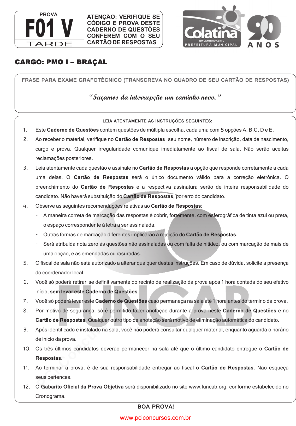 pcimarkpci MDAwMDowMDAwOjAwMDA6MDAwMDowMDAwOmZmZmY6MzZlOTpjMjU5:U2F0LCAxOCBTZXAgMjAyMSAxOTo0Nzo1NiAtMDMwMA== CARGO: PMO I BRAÇAL– FRASE PARA EXAME GRAFOTÉCNICO (TRANSCREVA NO QUADRO DE SEU CARTÃO DE RESPOSTAS) “Façamos da interrupção um caminho novo. ” F01 V ATENÇÃO: VERIFIQUE SE CÓDIGO E PROVA DESTE CADERNO DE QUESTÕES CONFEREM COM O SEU CARTÃO DE RESPOSTAS PROVA TARDE 1. Este contém questões de múltipla escolha, cada uma com 5 opções A, B,C, D e E. 2. Ao receber o material, verifique no seu nome, número de inscrição, data de nascimento, cargo e prova. Qualquer irregularidade comunique imediatamente ao fiscal de sala. Não serão aceitas reclamações posteriores. 3. Leia atentamente cada questão e assinale no a opção que responde corretamente a cada uma delas. O será o único documento válido para a correção eletrônica. O preenchimento do e a respectiva assinatura serão de inteira responsabilidade do candidato. Não haverá substituição do , por erro do candidato. 4. Observe as seguintes recomendações relativas ao : - A maneira correta de marcação das respostas é cobrir, fortemente, com esferográfica de tinta azul ou preta, o espaço correspondente à letra a ser assinalada. - Outras formas de marcação diferentes implicarão a rejeição do . - Será atribuída nota zero às questões não assinaladas ou com falta de nitidez, ou com marcação de mais de uma opção, e as emendadas ou rasuradas. 5. O fiscal de sala não está autorizado a alterar qualquer destas instruções. Em caso de dúvida, solicite a presença do coordenador local. 6. Você só poderá retirar-se definitivamente do recinto de realização da prova após 1 hora contada do seu efetivo início, . 7. Você só poderá levar este caso permaneça na sala até 1 hora antes do término da prova. 8. Por motivo de segurança, só é permitido fazer anotação durante a prova neste e no . Qualquer outro tipo de anotação será motivo de eliminação automática do candidato. 9. Após identificado e instalado na sala, você não poderá consultar qualquer material, enquanto aguarda o horário de início da prova. 10. Os três últimos candidatos deverão permanecer na sala até que o último candidato entregue o . 11. Ao terminar a prova, é de sua responsabilidade entregar ao fiscal o . Não esqueça seus pertences. 12. O será disponibilizado no site www.funcab.org, conforme estabelecido no Cronograma. Caderno de Questões Cartão de Respostas Cartão de Respostas Cartão de Respostas Cartão de Respostas Cartão de Respostas Cartão de Respostas Cartão de Respostas sem levar este Caderno de Questões Caderno de Questões Caderno de Questões Cartão de Respostas Cartão de Respostas Cartão de Respostas Gabarito Oficial da Prova Objetiva LEIA ATENTAMENTE AS INSTRUÇÕES SEGUINTES: BOA PROVA! www.pciconcursos.com.br pcimarkpci MDAwMDowMDAwOjAwMDA6MDAwMDowMDAwOmZmZmY6MzZlOTpjMjU5:U2F0LCAxOCBTZXAgMjAyMSAxOTo0Nzo1NiAtMDMwMA== 02 Leia com atenção a tirinha abaixo, e responda às questões propostas. Hägar, o horrível, e sua esposa Helga. http://giacono.wordpress.com/2009/01/28/hagar-o-horrivel- tirinhas-1-a-10/ LÍNGUA PORTUGUESA FUNCAB - Fundação Professor Carlos Augusto Bittencourt O que Helga está cobrando do marido? A) O dinheiro da compra do mês. B) O cumprimento da promessa que ele havia feito. C) Afesta de aniversário. D) O conserto da cerca do jardim. E) Aarrumação do quarto. Questão 01 Aresposta do Hägar indica que ele: A) não sabe como cortar a lenha. B) necessita sair logo para trabalhar. C) irá consertar o telhado imediatamente. D) está muito preocupado com o tempo. E) não quer fazer nada naquele momento. Questão 02 Conforme o que havia prometido, Hägar deveria estar construindo um: A) telhado. B) galinheiro. C) galpão. D) jardim. E) curral. Questão 03 Hägar está rezando para chover porque: A) há muito tempo não chove. B) não gosta de dias ensolarados. C) o sol é prejudicial à saúde. D) se chover, ele não precisará cumprir o que prometera. E) a falta de chuva compromete a plantação. Questão 04 Observando a tirinha, percebe-se que Helga está: A) tranquila. B) bem-humorada. C) indisposta. D) satisfeita. E) contrariada. Questão 05 O contrário de LIMPAR é: A) sujar. B) cortar. C) arrumar. D) varrer. E) lavar. Questão 06 Afrase “O que você tá fazendo na cama até agora?” é uma: A) negativa. B) afirmativa. C) exclamativa. D) interrogativa. E) dúvida. Questão 07 Marque a palavra que apresenta ERRO na escrita. A) Construção. B) Capinsal. C) Preguiçoso. D) Chuvoso. E) Limpeza. Questão 08 Assinale a palavra do texto que possui 3 sílabas. A) cama. B) galpão. C) telhado. D) jardim. E) curral. Questão 09 HOJE VOCÊ PROMETEU CONSERTAR O TELHADO, CAPINAR O JARDIM, CORTAR LENHA, CONSTRUIR UM GALPÃO E LIMPAR O CURRAL... O QUE VOCÊ TÁ FAZENDO NA CAMA ATÉ AGORA? REZANDO POR UMA CHUVA www.pciconcursos.com.br pcimarkpci MDAwMDowMDAwOjAwMDA6MDAwMDowMDAwOmZmZmY6MzZlOTpjMjU5:U2F0LCAxOCBTZXAgMjAyMSAxOTo0Nzo1NiAtMDMwMA== 03 FUNCAB - Fundação Professor Carlos Augusto Bittencourt Marque a alternativa correta. A) O plural de CURRALé CURRAIS. B) O diminutivo de CAMAé CAMAZINHA. C) CONSERTAR é sinônimo de ESCORAR. D) Aseparação silábica de LENHAé LEN-HA. E) Apalavra JARDIM, no texto, é um adjetivo. Questão 10 Se 40 trabalhadores realizam um trabalho em 12 dias, o número de dias que 60 trabalhadores realizarão o mesmo trabalho, é: A) 2 B) 4 C) 6 D) 8 E) 10 Questão 11 Um trabalhador é contratado para trabalhar de segunda a Sábado. Trabalha 8 horas por dia, de segunda a sexta-feira e 4 horas no sábado e recebe R$ 8,00 por hora trabalhada. Observe o calendário abaixo e calcule quanto esse trabalhador recebeu no mês de agosto de 2011. A) R$ 980,00 B) R$ 1.238,00 C) R$ 1.600,00 D) R$ 1.676,00 E) R$ 1.886,00 Questão 12 Durante uma empreitada de capina, 60% dos funcionários usaram foice e 25% do restante, enxadas. Se os 18 func