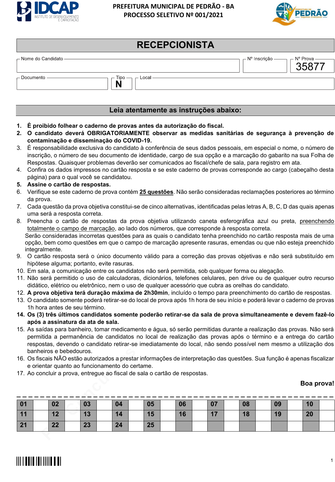 pcimarkpci MDAwMDowMDAwOjAwMDA6MDAwMDowMDAwOmZmZmY6MzZlOTpjMjU5:RnJpLCAxMCBTZXAgMjAyMSAxOTo1NjoxMCAtMDMwMA== RECEPCIONISTA N 35877 PREFEITURA MUNICIPAL DE PEDRÃO - BA PROCESSO SELETIVO Nº 001/2021 Leia atentamente as instruções abaixo: 1. É proibido folhear o caderno de provas antes da autorização do fiscal. 2. O candidato deverá OBRIGATORIAMENTE observar as medidas sanitárias de segurança à prevenção de contaminação e disseminação do COVID-19. 3. É responsabilidade exclusiva do candidato à conferência de seus dados pessoais, em especial o nome, o número de inscrição, o número de seu documento de identidade, cargo de sua opção e a marcação do gabarito na sua Folha de Respostas. Quaisquer problemas deverão ser comunicados ao fiscal/chefe de sala, para registro em ata. 4. Confira os dados impressos no cartão resposta e se este caderno de provas corresponde ao cargo (cabeçalho desta página) para o qual você se candidatou. 5. Assine o cartão de respostas. 6. Verifique se este caderno de prova contém 25 questões. Não serão consideradas reclamações posteriores ao término da prova. 7. Cada questão da prova objetiva constitui-se de cinco alternativas, identificadas pelas letras A, B, C, D das quais apenas uma será a resposta correta. 8. Preencha o cartão de respostas da prova objetiva utilizando caneta esferográfica azul ou preta, preenchendo totalmente o campo de marcação, ao lado dos números, que corresponde à resposta correta. Serão consideradas incorretas questões para as quais o candidato tenha preenchido no cartão resposta mais de uma opção, bem como questões em que o campo de marcação apresente rasuras, emendas ou que não esteja preenchido integralmente. 9. O cartão resposta será o único documento válido para a correção das provas objetivas e não será substituído em hipótese alguma; portanto, evite rasuras. 10. Em sala, a comunicação entre os candidatos não será permitida, sob qualquer forma ou alegação. 11. Não será permitido o uso de calculadoras, dicionários, telefones celulares, pen drive ou de qualquer outro recurso didático, elétrico ou eletrônico, nem o uso de qualquer acessório que cubra as orelhas do candidato. 12. A prova objetiva terá duração máxima de 2h30min, incluído o tempo para preenchimento do cartão de respostas. 13. O candidato somente poderá retirar-se do local de prova após 1h hora de seu início e poderá levar o caderno de provas 1h hora antes de seu término. 14. Os (3) três últimos candidatos somente poderão retirar-se da sala de prova simultaneamente e devem fazê-lo após a assinatura da ata de sala. 15. As saídas para banheiro, tomar medicamento e água, só serão permitidas durante a realização das provas. Não será permitida a permanência de candidatos no local de realização das provas após o término e a entrega do cartão respostas, devendo o candidato retirar-se imediatamente do local, não sendo possível nem mesmo a utilização dos banheiros e bebedouros. 16. Os fiscais NÃO estão autorizados a prestar informações de interpretação das questões. Sua função é apenas fiscalizar e orientar quanto ao funcionamento do certame. 17. Ao concluir a prova, entregue ao fiscal de sala o cartão de respostas. Boa prova! _ _ _ _ _ _ _ _ _ _ _ _ _ _ _ _ _ _ _ _ _ _ _ _ _ _ _ _ _ _ _ _ _ _ _ _ _ _ _ _ _ _ _ _ _ _ _ _ _ _ _ _ _ _ 01 02 03 04 05 06 07 08 09 10 11 12 13 14 15 16 17 18 19 20 21 22 23 24 25 1 pcimarkpci MDAwMDowMDAwOjAwMDA6MDAwMDowMDAwOmZmZmY6MzZlOTpjMjU5:RnJpLCAxMCBTZXAgMjAyMSAxOTo1NjoxMCAtMDMwMA== PREFEITURA MUNICIPAL DE PEDRÃO - BA PROCESSO SELETIVO Nº 001/2021 Página de Rascunho. RECEPCIONISTA 2 pcimarkpci MDAwMDowMDAwOjAwMDA6MDAwMDowMDAwOmZmZmY6MzZlOTpjMjU5:RnJpLCAxMCBTZXAgMjAyMSAxOTo1NjoxMCAtMDMwMA== PREFEITURA MUNICIPAL DE PEDRÃO - BA PROCESSO SELETIVO Nº 001/2021 Língua Portuguesa TEXTO 01 O texto abaixo servirá de base para responder as questões de 01 a 07. FÁBULA MODERNA DO BILÍNGUE O ratinho estava na toca, encurralado pelo gato que, do lado de fora, miava: - MIAU! MIAU! MIAU! - Cadê você, seu gato? Eu preciso sair daqui, tou com fome. E o gato não parava de miar. Ele era cada vez mais insistente para meter medo no ratinho. O gato teve vontade de deixar o rato bem assustado e continuou miando. - Rato assustado sai logo do buraco, porque aumenta a fome - pensou o gato. - Seu gato, minha vida não é fácil. Eu trabalho para sustentar minha família. Eu sou operário. Eu sou muito útil para a minha raça. Olhe a hora no relógio e vá embora daqui ligeirinho, porque eu não posso morrer de fome. - MIAU! MIAU! MIAU! - Seu gato, não deboche de mim, tenha pena de um rato pobrezinho e faminto. Eu tenho muitos filhos recém-nascidos e preciso ficar forte para sustentá-los. O tempo passava e ele, o ratinho, ouvia: - MIAU! MIAU! MIAU! O ratinho desmaiou de fome e dormiu. Depois de várias horas dormindo e ainda com muita fome, ele ouviu: - AU! AU! AU! O ratinho acordou assustado e deduziu: "Se há cão lá fora, o gato foi embora!" Saiu disparado em busca de comida. Nem bem terminou de sair da toca e o gato NHAC! Inconformado, já na boca do gato ele desabafou: - Puxa gato! Você é traidor de verdade! E o gato respondeu: - Meu filho, neste mundo globalizado de hoje, quem não fala pelo menos dois idiomas morre de fome! rnaa.htmml viousmag.org/archives/2006/03/fabula_moderna.html) - (Texto adaptado) - (Acesso 13.05.2021) http://obviousmag.org/archives/2006/03/fabula_moderna.html Questão 01 Marque a palavra que se relaciona corretamente com o sentido seguinte: "Chegou à conclusão utilizando somente o raciocínio, inferiu". a) "Embora". b) "Sustentar". c) "Deduziu". d) "Pobrezinho". Questão 02 Marque a alternativa com informação CORRETA. a) O texto contém palavras que representam a língua falada. b) No texto, existem frases que representam a linguagem escrita. c) Todas estãocorretas. d) Cada vez que o gato miava aumentava o m