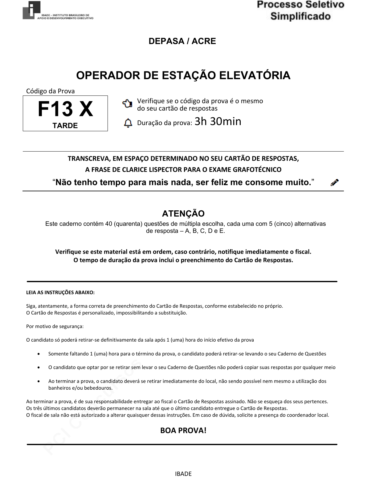 pcimarkpci MDAwMDowMDAwOjAwMDA6MDAwMDowMDAwOmZmZmY6MzZlOTpjMjU5:U2F0LCAxOCBTZXAgMjAyMSAyMDoyNjo0NiAtMDMwMA== IBADE DEPASA / ACRE OPERADOR DE ESTAÇÃO ELEVATÓRIA Código da Prova F13 X Verifique se o código da prova é o mesmo do seu cartão de respostas Duração da prova: 3h 30min TARDE TRANSCREVA, EM ESPAÇO DETERMINADO NO SEU CARTÃO DE RESPOSTAS, A FRASE DE CLARICE LISPECTOR PARA O EXAME GRAFOTÉCNICO “Não tenho tempo para mais nada, ser feliz me consome muito.” ATENÇÃO Este caderno contém 40 (quarenta) questões de múltipla escolha, cada uma com 5 (cinco) alternativas de resposta – A, B, C, D e E. Verifique se este material está em ordem, caso contrário, notifique imediatamente o fiscal. O tempo de duração da prova inclui o preenchimento do Cartão de Respostas. LEIA AS INSTRUÇÕES ABAIXO: Siga, atentamente, a forma correta de preenchimento do Cartão de Respostas, conforme estabelecido no próprio. O Cartão de Respostas é personalizado, impossibilitando a substituição. Por motivo de segurança: O candidato só poderá retirar-se definitivamente da sala após 1 (uma) hora do início efetivo da prova Somente faltando 1 (uma) hora para o término da prova, o candidato poderá retirar-se levando o seu Caderno de Questões O candidato que optar por se retirar sem levar o seu Caderno de Questões não poderá copiar suas respostas por qualquer meio Ao terminar a prova, o candidato deverá se retirar imediatamente do local, não sendo possível nem mesmo a utilização dos banheiros e/ou bebedouros. Ao terminar a prova, é de sua responsabilidade entregar ao fiscal o Cartão de Respostas assinado. Não se esqueça dos seus pertences. Os três últimos candidatos deverão permanecer na sala até que o último candidato entregue o Cartão de Respostas. O fiscal de sala não está autorizado a alterar quaisquer dessas instruções. Em caso de dúvida, solicite a presença do coordenador local. BOA PROVA! pcimarkpci MDAwMDowMDAwOjAwMDA6MDAwMDowMDAwOmZmZmY6MzZlOTpjMjU5:U2F0LCAxOCBTZXAgMjAyMSAyMDoyNjo0NiAtMDMwMA== DEPASA / ACRE IBADE Operador de Estação Elevatória Tipo X – Página 1 Língua Portuguesa LENDA SOBRE A ORIGEM DA ÁGUA Antigamente não existia água no mundo. Havia somente um homem, chamado Sagakagagu, que tinha seis cabaças de água. O deus Taũgi foi procurar esse homem, pois diziam que ele vivia muito melhor do que todos os outros seres. Taũgi foi procurar o dono da água, até que chegou na aldeia onde Sagakagagu morava. O dono da água falou: - Taũgi, você chegou? - Eu cheguei. - O que você quer comigo? - Eu venho atrás do senhor para lhe pedir pelo menos uma cabacinha de água. - Senhor Taũgi, eu tenho água aqui, mas não é boa para tomar banho. Eu tenho água salgada e água doce. O dono da água, Sagakagagu, não queria mostrar a água para Taũgi. Taũgi já havia percebido que ele não queria lhe dar a água. No dia seguinte o deus Taũgi quebrou todas as cabaças de água que estavam penduradas na casa do dono da água. Então apareceu o mar que tem água salgada, os igarapés, os lagos, os rios e as lagoas. A água se espalhou pelo Brasil e pelo mundo inteiro. Foi assim a origem da água no Brasil. Quem trouxe a água para nós foi o deus Taũgi. versão de Sepé Kuikuro Fonte: Livro das Águas - Índios no Xingu (2002) Questão 1 A forma em que a linguagem se apresenta no texto pertence ao tipo: (A) descritivo. (B) expositivo. (C) narrativo. (D) injuntivo. (E) argumentativo. Questão 2 A alternativa em que todas as palavras se acentuam de acordo com a norma culta da língua é: (A) médico – porém – idéia. (B) vôo – técnica – chapéu. (C) jóia – saúde – régua. (D) egoísmo – paranóia – vêem. (E) mausoléu – saída – cafeína. Questão 3 Em “Antigamente não existia água no mundo.” a palavra em destaque foi formada pelo mesmo processo que: (A) analfabeto. (B) beleza. (C) subsolo. (D) aguardente. (E) pontapé. Questão 4 Em “...eu tenho água aqui, mas não é boa para tomar banho.”, o conectivo grifado tem o valor de: (A) explicação. (B) alternância. (C) adição. (D) oposição. (E) conclusão. pcimarkpci MDAwMDowMDAwOjAwMDA6MDAwMDowMDAwOmZmZmY6MzZlOTpjMjU5:U2F0LCAxOCBTZXAgMjAyMSAyMDoyNjo0NiAtMDMwMA== DEPASA / ACRE IBADE Operador de Estação Elevatória Tipo X – Página 2 Matemática Questão 5 Em um curso de inglês são realizadas 3 avaliações. A nota do aluno é calculada pela média ponderada dessas avaliações. O aluno deve ter uma média de, pelo menos, 7,0, para ser aprovado. A tabela abaixo apresenta as notas obtidas por um aluno nas duas primeiras avaliações e o peso de cada avaliação. A menor nota que o aluno poderá tirar na última avaliação para ser aprovado será: (A) 10,0. (B) 7,0. (C) 6,0. (D) 9,0. (E) 8,0. Questão 6 Juliana investiu R$ 5.000,00, a juros simples, em uma aplicação que rende 3% ao mês, durante 8 meses. Passados 8 meses, Juliana retirou todo o dinheiro e investiu somente metade em uma outra aplicação, a juros simples, a uma taxa de 5% ao mês por mais 4 meses. O total de juros arrecadado por Juliana após os 12 meses foi: (A) R$ 1.200,00. (B) R$ 1440,00. (C) R$ 620,00. (D) R$ 1820,00. (E) R$ 240,00. Questão 7 As figuras abaixo possuem as seguintes dimensões descritas. A razão entre o perímetro da figura 1 e o perímetro da figura 2 é: (A) 7/8. (B) 9/8. (C) 8/3. (D) 7/9. (E) 3/8. pcimarkpci MDAwMDowMDAwOjAwMDA6MDAwMDowMDAwOmZmZmY6MzZlOTpjMjU5:U2F0LCAxOCBTZXAgMjAyMSAyMDoyNjo0NiAtMDMwMA== DEPASA / ACRE IBADE Operador de Estação Elevatória Tipo X – Página 3 História e Geografia do Acre Questão 8 O início da década de 70 foi marcado por uma nova diretriz governamental para o “progresso econômico” da região acreana. A ocupação da Amazônia foi estimulada, grandes projetos mineradores, madeireiros e agropecuários recebiam financiamentos e incentivos fiscais em nome do desenvolvimento daquela região. Nesta época, um movimento fi