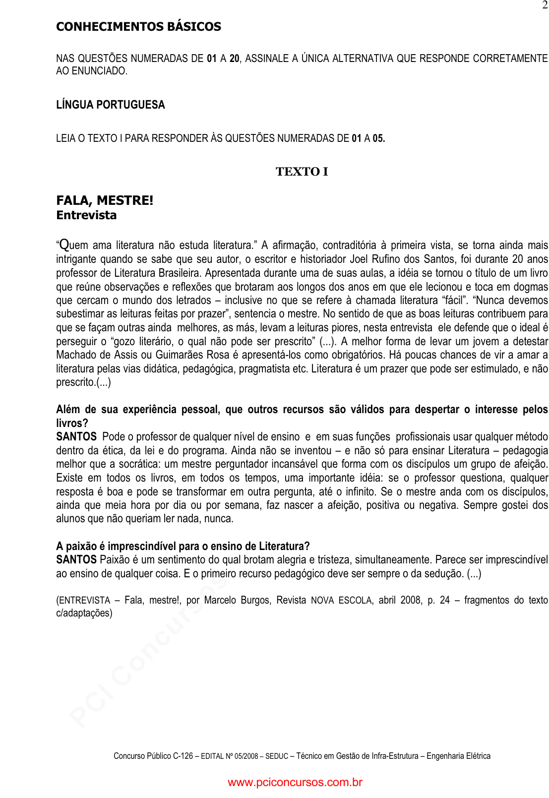 pcimarkpci MDAwMDowMDAwOjAwMDA6MDAwMDowMDAwOmZmZmY6MzZlOTpjMjU5:U2F0LCAxMSBTZXAgMjAyMSAxMzo0Mjo0MyAtMDMwMA== Concurso Público C-126 – EDITAL Nº 05/2008 – SEDUC – Técnico em Gestão de Infra-Estrutura – Engenharia Elétrica 2 CONHECIMENTOS BÁSICOS NAS QUESTÕES NUMERADAS DE 01 A 20, ASSINALE A ÚNICA ALTERNATIVA QUE RESPONDE CORRETAMENTE AO ENUNCIADO. LÍNGUA PORTUGUESA LEIA O TEXTO I PARA RESPONDER ÀS QUESTÕES NUMERADAS DE 01 A 05. TEXTO I FALA, MESTRE! Entrevista “Quem ama literatura não estuda literatura.” A afirmação, contraditória à primeira vista, se torna ainda mais intrigante quando se sabe que seu autor, o escritor e historiador Joel Rufino dos Santos, foi durante 20 anos professor de Literatura Brasileira. Apresentada durante uma de suas aulas, a idéia se tornou o título de um livro que reúne observações e reflexões que brotaram aos longos dos anos em que ele lecionou e toca em dogmas que cercam o mundo dos letrados – inclusive no que se refere à chamada literatura “fácil”. “Nunca devemos subestimar as leituras feitas por prazer”, sentencia o mestre. No sentido de que as boas leituras contribuem para que se façam outras ainda melhores, as más, levam a leituras piores, nesta entrevista ele defende que o ideal é perseguir o “gozo literário, o qual não pode ser prescrito” (...). A melhor forma de levar um jovem a detestar Machado de Assis ou Guimarães Rosa é apresentá-los como obrigatórios. Há poucas chances de vir a amar a literatura pelas vias didática, pedagógica, pragmatista etc. Literatura é um prazer que pode ser estimulado, e não prescrito.(...) Além de sua experiência pessoal, que outros recursos são válidos para despertar o interesse pelos livros? SANTOS Pode o professor de qualquer nível de ensino e em suas funções profissionais usar qualquer método dentro da ética, da lei e do programa. Ainda não se inventou – e não só para ensinar Literatura – pedagogia melhor que a socrática: um mestre perguntador incansável que forma com os discípulos um grupo de afeição. Existe em todos os livros, em todos os tempos, uma importante idéia: se o professor questiona, qualquer resposta é boa e pode se transformar em outra pergunta, até o infinito. Se o mestre anda com os discípulos, ainda que meia hora por dia ou por semana, faz nascer a afeição, positiva ou negativa. Sempre gostei dos alunos que não queriam ler nada, nunca. A paixão é imprescindível para o ensino de Literatura? SANTOS Paixão é um sentimento do qual brotam alegria e tristeza, simultaneamente. Parece ser imprescindível ao ensino de qualquer coisa. E o primeiro recurso pedagógico deve ser sempre o da sedução. (...) (ENTREVISTA – Fala, mestre!, por Marcelo Burgos, Revista NOVA ESCOLA, abril 2008, p. 24 – fragmentos do texto c/adaptações) www.pciconcursos.com.br pcimarkpci MDAwMDowMDAwOjAwMDA6MDAwMDowMDAwOmZmZmY6MzZlOTpjMjU5:U2F0LCAxMSBTZXAgMjAyMSAxMzo0Mjo0MyAtMDMwMA== Concurso Público C-126 – EDITAL Nº 05/2008 – SEDUC – Técnico em Gestão de Infra-Estrutura – Engenharia Elétrica 3 01. Julgue as afirmativas a partir dos comentários abaixo e assinale a correta: Esta passagem é muito significativa na entrevista, pois o Autor ensina, de forma aparentemente leve, porém, contundente, que “A melhor forma de levar um jovem a detestar Machado de Assis ou Guimarães Rosa é apresentá-los como obrigatórios. Há poucas chances de vir a amar a literatura pelas vias didática, pedagógica, pragmatista etc. Literatura é um prazer que pode ser estimulado, e não prescrito. (...)”, portanto, transformando o prazer do texto literário em: A) algo não-atraente, por ser previamente estabelecido. B) infortúnio, por ser desnecessário. C) uma necessidade como outra qualquer na vida. D) um estímulo face a outras opções de passatempo. 02. A leitura desta entrevista evidencia que o Autor aborda o assunto com argumentos que denotam: A) experiência profissional. B) metodologias de trabalho. C) necessidades de leituras. D) abordagens incontestáveis. 03. Nos seguintes fragmentos retirados do texto lido: “Pode o professor de qualquer nível de ensino e em suas funções profissionais ...” e “Existe em todos os livros, em todos os tempos, uma importante idéia ...” há uma ocorrência comum às duas orações que é o (a): A) uso de verbos transitivos indiretos. B) presença de sujeito posposto. C) emprego de ordem direta. D) construção de orações sem sujeito. 04. A respeito do trecho retirado do texto lido: “... as boas leituras contribuem para que se façam outras ainda melhores, as más, levam a leituras piores ...”, avalie as afirmativas a seguir: 1- Entre os segmentos do trecho ocorrem elementos opostos. 2- A omissão do substantivo “leituras” após o adjetivo “más”, e no lugar da vírgula, se deve à preocupação com a estética da frase. 3- O adjetivo “melhores” aparece na forma plural para concordar com o objeto indireto “outras”. 4- A segunda oração do período está na voz passiva pronominal. O correto está em: A) 1, 2, 3 e 4. B) 1, 2 e 4, apenas. C) 3 e 4, apenas. D) 3, apenas. www.pciconcursos.com.br pcimarkpci MDAwMDowMDAwOjAwMDA6MDAwMDowMDAwOmZmZmY6MzZlOTpjMjU5:U2F0LCAxMSBTZXAgMjAyMSAxMzo0Mjo0MyAtMDMwMA== Concurso Público C-126 – EDITAL Nº 05/2008 – SEDUC – Técnico em Gestão de Infra-Estrutura – Engenharia Elétrica 4 05. A respeito dos elementos lingüísticos do texto, avalie as afirmativas a seguir: A) As palavras destacadas em: “Apresentada durante uma de suas aulas, a idéia se tornou o título de um livro que reúne observações e reflexões ...” obedecem a mesma regra de acentuação. B) O vocábulo se destacado em: “... se o professor questiona, qualquer resposta é boa e pode se transformar em outra pergunta ...” exerce a mesma função sintática nas duas ocorrências. C) A forma verbal em destaque empregada na frase “Paixão é um sentimento 