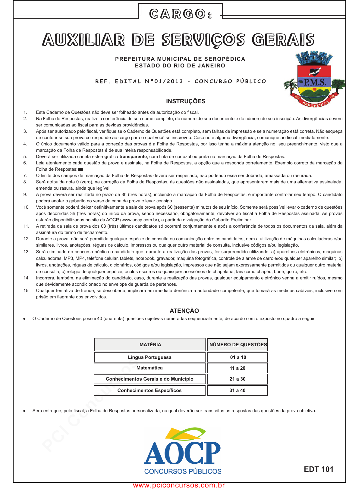 pcimarkpci MDAwMDowMDAwOjAwMDA6MDAwMDowMDAwOmZmZmY6MzZlOTpjMjU5:U2F0LCAxOCBTZXAgMjAyMSAxNDowMTozMiAtMDMwMA== C A R G O : PREFEITURA MUNICIPAL DE SEROPÉDICA ESTADO DO RIO DE JANEIRO R E F . E D I T A L N º 0 1 / 2 0 1 3 - C O N C U R S O P Ú B L I C O INSTRUÇÕES 1. Este Caderno de Questões não deve ser folheado antes da autorização do fiscal. 2. Na Folha de Respostas, realize a conferência de seu nome completo, do número de seu documento e do número de sua inscrição. As divergências devem ser comunicadas ao fiscal para as devidas providências. 3. Após ser autorizado pelo fiscal, verifique se o Caderno de Questões está completo, sem falhas de impressão e se a numeração está correta. Não esqueça de conferir se sua prova corresponde ao cargo para o qual você se inscreveu. Caso note alguma divergência, comunique ao fiscal imediatamente. 4. O único documento válido para a correção das provas é a Folha de Respostas, por isso tenha a máxima atenção no seu preenchimento, visto que a marcação da Folha de Respostas é de sua inteira responsabilidade. 5. Deverá ser utilizada caneta esferográfica transparente, com tinta de cor azul ou preta na marcação da Folha de Respostas. 6. Leia atentamente cada questão da prova e assinale, na Folha de Respostas, a opção que a responda corretamente. Exemplo correto da marcação da Folha de Respostas: 7. O limite dos campos de marcação da Folha de Respostas deverá ser respeitado, não podendo essa ser dobrada, amassada ou rasurada. 8. Será atribuída nota 0 (zero), na correção da Folha de Respostas, às questões não assinaladas, que apresentarem mais de uma alternativa assinalada, emenda ou rasura, ainda que legível. 9. A prova deverá ser realizada no prazo de 3h (três horas), incluindo a marcação da Folha de Respostas, é importante controlar seu tempo. O candidato poderá anotar o gabarito no verso da capa da prova e levar consigo. 10. Você somente poderá deixar definitivamente a sala de prova após 60 (sessenta) minutos de seu início. Somente será possível levar o caderno de questões após decorridas 3h (três horas) do início da prova, sendo necessário, obrigatoriamente, devolver ao fiscal a Folha de Respostas assinada. As provas estarão disponibilizadas no site da AOCP (www.aocp.com.br), a partir da divulgação do Gabarito Preliminar. 11. A retirada da sala de prova dos 03 (três) últimos candidatos só ocorrerá conjuntamente e após a conferência de todos os documentos da sala, além da assinatura do termo de fechamento. 12. Durante a prova, não será permitida qualquer espécie de consulta ou comunicação entre os candidatos, nem a utilização de máquinas calculadoras e/ou similares, livros, anotações, réguas de cálculo, impressos ou qualquer outro material de consulta, inclusive códigos e/ou legislação. 13. Será eliminado do concurso público o candidato que, durante a realização das provas, for surpreendido utilizando: a) aparelhos eletrônicos, máquinas calculadoras, MP3, MP4, telefone celular, tablets, notebook, gravador, máquina fotográfica, controle de alarme de carro e/ou qualquer aparelho similar; b) livros, anotações, réguas de cálculo, dicionários, códigos e/ou legislação, impressos que não sejam expressamente permitidos ou qualquer outro material de consulta; c) relógio de qualquer espécie, óculos escuros ou quaisquer acessórios de chapelaria, tais como chapéu, boné, gorro, etc. 14. Incorrerá, também, na eliminação do candidato, caso, durante a realização das provas, qualquer equipamento eletrônico venha a emitir ruídos, mesmo que devidamente acondicionado no envelope de guarda de pertences. 15. Qualquer tentativa de fraude, se descoberta, implicará em imediata denúncia à autoridade competente, que tomará as medidas cabíveis, inclusive com prisão em flagrante dos envolvidos. ATENÇÃO ● O Caderno de Questões possui 40 (quarenta) questões objetivas numeradas sequencialmente, de acordo com o exposto no quadro a seguir: EDT 101 ● Será entregue, pelo fiscal, a Folha de Respostas personalizada, na qual deverão ser transcritas as respostas das questões da prova objetiva. C A R G O : A U X I L I A R D E S E R V I Ç O S G E R A I SA U X I L I A R D E S E R V I Ç O S G E R A I S NÚMERO DE QUESTÕES MATÉRIA Língua Portuguesa Matemática Conhecimentos Gerais e do Município 01 a 10 11 a 20 21 a 30 Conhecimentos Específicos 31 a 40 www.pciconcursos.com.br www.pciconcursos.com.br pcimarkpci MDAwMDowMDAwOjAwMDA6MDAwMDowMDAwOmZmZmY6MzZlOTpjMjU5:U2F0LCAxOCBTZXAgMjAyMSAxNDowMTozMiAtMDMwMA== Gabarito Preliminar disponível em www.aocp.com.br ------------------------------------------------------------------------------------(destaque aqui)-------------------------------------------------------------------------- FOLHA PARA ANOTAÇÃO DAS RESPOSTAS DO CANDIDATO Questão Resp. 21 22 23 24 25 26 27 28 29 30 31 32 33 34 35 36 37 38 39 40 Questão Resp. 01 02 03 04 05 06 07 08 09 10 11 12 13 14 15 16 17 18 19 20 www.pciconcursos.com.br www.pciconcursos.com.br pcimarkpci MDAwMDowMDAwOjAwMDA6MDAwMDowMDAwOmZmZmY6MzZlOTpjMjU5:U2F0LCAxOCBTZXAgMjAyMSAxNDowMTozMiAtMDMwMA== 3Cargo: Auxiliar de Serviços Gerais As questões de 01 a 05 referem-se à tirinha abaixo. http://www1.folha.uol.com.br/ilustrada/cartum/cartunsdiarios/#1/2/2013 De acordo com a tirinha, (A) John não gosta de estudar e por isso não irá se formar. (B) John não gostava do ensino médio e zombou da cigana. (C) John nunca se formou porque não arrumou uma garota. (D) Garfield ironiza a capacidade de John arrumar garotas. (E) Garfield aprecia ciganas e por isso satiriza a maldição. Na passagem do primeiro para o segundo quadrinho, temos uma (A) conclusão. (B) explicação. (C) adição. (D) alternância. (E) contraste. A palavra que está separada corretamente é (A) b – i – le. (B) di – sse. (C) ca – çoei. (D) i – ria. (E) ar – ran – jar. A palavra que pertenc