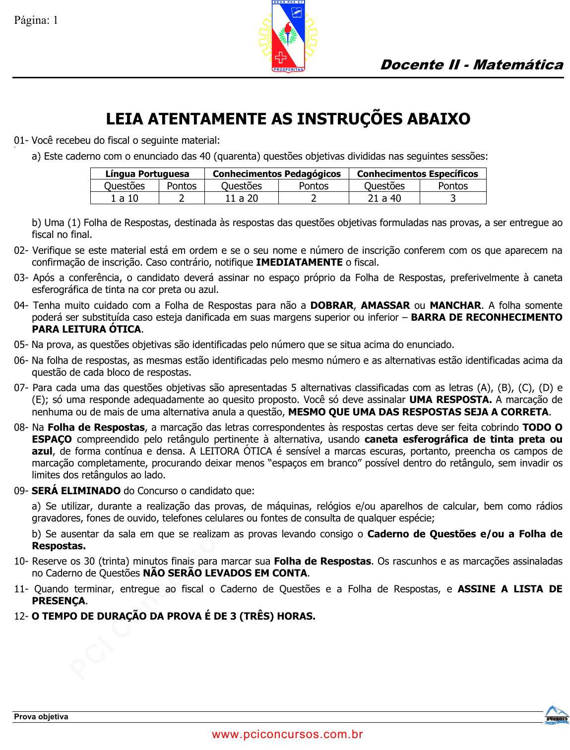 pcimarkpci MDAwMDowMDAwOjAwMDA6MDAwMDowMDAwOmZmZmY6MzZlOTpjMjU5:VGh1LCAxNiBTZXAgMjAyMSAxOTozNjo1MCAtMDMwMA== Página: 1 Docente II - Matemática Prova objetiva LEIA ATENTAMENTE AS INSTRUÇÕES ABAIXO 01- Você recebeu do fiscal o seguinte material: * a) Este caderno com o enunciado das 40 (quarenta) questões objetivas divididas nas seguintes sessões: Língua Portuguesa Conhecimentos Pedagógicos Conhecimentos Específicos Questões Pontos Questões Pontos Questões Pontos 1 a 10 2 11 a 20 2 21 a 40 3 b) Uma (1) Folha de Respostas, destinada às respostas das questões objetivas formuladas nas provas, a ser entregue ao fiscal no final. 02- Verifique se este material está em ordem e se o seu nome e número de inscrição conferem com os que aparecem na confirmação de inscrição. Caso contrário, notifique IMEDIATAMENTE o fiscal. 03- Após a conferência, o candidato deverá assinar no espaço próprio da Folha de Respostas, preferivelmente à caneta esferográfica de tinta na cor preta ou azul. 04- Tenha muito cuidado com a Folha de Respostas para não a DOBRAR, AMASSAR ou MANCHAR. A folha somente poderá ser substituída caso esteja danificada em suas margens superior ou inferior – BARRA DE RECONHECIMENTO PARA LEITURA ÓTICA. 05- Na prova, as questões objetivas são identificadas pelo número que se situa acima do enunciado. 06- Na folha de respostas, as mesmas estão identificadas pelo mesmo número e as alternativas estão identificadas acima da questão de cada bloco de respostas. 07- Para cada uma das questões objetivas são apresentadas 5 alternativas classificadas com as letras (A), (B), (C), (D) e (E); só uma responde adequadamente ao quesito proposto. Você só deve assinalar UMA RESPOSTA. A marcação de nenhuma ou de mais de uma alternativa anula a questão, MESMO QUE UMA DAS RESPOSTAS SEJA A CORRETA. 08- Na Folha de Respostas, a marcação das letras correspondentes às respostas certas deve ser feita cobrindo TODO O ESPAÇO compreendido pelo retângulo pertinente à alternativa, usando caneta esferográfica de tinta preta ou azul, de forma contínua e densa. A LEITORA ÓTICA é sensível a marcas escuras, portanto, preencha os campos de marcação completamente, procurando deixar menos “espaços em branco” possível dentro do retângulo, sem invadir os limites dos retângulos ao lado. 09- SERÁ ELIMINADO do Concurso o candidato que: a) Se utilizar, durante a realização das provas, de máquinas, relógios e/ou aparelhos de calcular, bem como rádios gravadores, fones de ouvido, telefones celulares ou fontes de consulta de qualquer espécie; b) Se ausentar da sala em que se realizam as provas levando consigo o Caderno de Questões e/ou a Folha de Respostas. 10- Reserve os 30 (trinta) minutos finais para marcar sua Folha de Respostas. Os rascunhos e as marcações assinaladas no Caderno de Questões NÃO SERÃO LEVADOS EM CONTA. 11- Quando terminar, entregue ao fiscal o Caderno de Questões e a Folha de Respostas, e ASSINE A LISTA DE PRESENÇA. 12- O TEMPO DE DURAÇÃO DA PROVA É DE 3 (TRÊS) HORAS. www.pciconcursos.com.br pcimarkpci MDAwMDowMDAwOjAwMDA6MDAwMDowMDAwOmZmZmY6MzZlOTpjMjU5:VGh1LCAxNiBTZXAgMjAyMSAxOTozNjo1MCAtMDMwMA== Página: 2 Docente II - Matemática Prova objetiva www.pciconcursos.com.br pcimarkpci MDAwMDowMDAwOjAwMDA6MDAwMDowMDAwOmZmZmY6MzZlOTpjMjU5:VGh1LCAxNiBTZXAgMjAyMSAxOTozNjo1MCAtMDMwMA== Página: 3 Docente II - Matemática Prova objetiva ♦ Língua Portuguesa ♦ TEXTO Lugares-comuns que incomodam Há duas expressões no futebol que me incomodam. Uma foi criada pelo extraordinário Nelson Rodrigues e se refere à "pátria de chuteiras", hoje utilizada quando o assunto é seleção. Outra o define como "esporte de macho", sempre que se fala de violência em campo. Não gosto da primeira por ter sido desvirtuada e agora dar caráter exagerado de patriotismo a um jogo de bola, que deveria funcionar como divertimento e não como defesa da soberania nacional. A segunda desagrada por tratar-se de maneira tosca de justificar as botinadas de quem não tem recursos técnicos. Li anteontem uma nota de agência internacional em que Otto Schily, ministro do interior da Alemanha, sugeria que os jogadores da seleção cantassem o hino nacional com "mais empenho". Em sua avaliação, isso lhes daria mais ânimo antes de confrontos importantes. O diligente político recordou que, na Euro-2000, sentiu que os alemães iriam perder de Portugal pelas reações das duas equipes na execução dos hinos. Os portugueses cantaram forte e se deram as mãos, enquanto os germânicos apenas balbuciavam. Resultado: 3 a 0 para os lusos. Hino, de qualquer país, é símbolo sagrado, que merece respeito total e que deve ser utilizado em ocasiões muito, muito especiais. Mas não precisa, necessariamente, entrar em eventos esportivos. Porque, no fundo, pode funcionar como advertência subliminar de que é a pátria - e não um troféu, uma medalha - que está em disputa. Como vejo no esporte função lúdica, imagino como seria lindo e emocionante, por exemplo, ver uma "Aquarela do Brasil" ou um "Funiculi, funiculá", quando se enfrentassem Brasil e Itália. Jogadores e público entrariam em êxtase. A alegria dominaria as arquibancadas. Por isso, também, não considero desertor um jogador que, por qualquer motivo, não queira defender a seleção do sei país. Sem ditar regras, e muito menos sem a pretensão de dar aula de educação cívica, prefiro que a cidadania, muitas vezes com o hino nacional de fundo, seja exercida em outras atividades do dia-a-dia. Por exemplo? Na cobrança de transparência das ações de políticos, no controle do dinheiro arrecadado pelos impostos, no banimento da vida pública daqueles que nos roubam recursos, mas, sobretudo sonhos. Cidadania também é não referendar dirigente esportivo "malandro", é não achar que os fins justificam os meios, é não passar os outros para trás. E por aí vai. Antonio Grecco. O Estado de São Paulo, 26 
