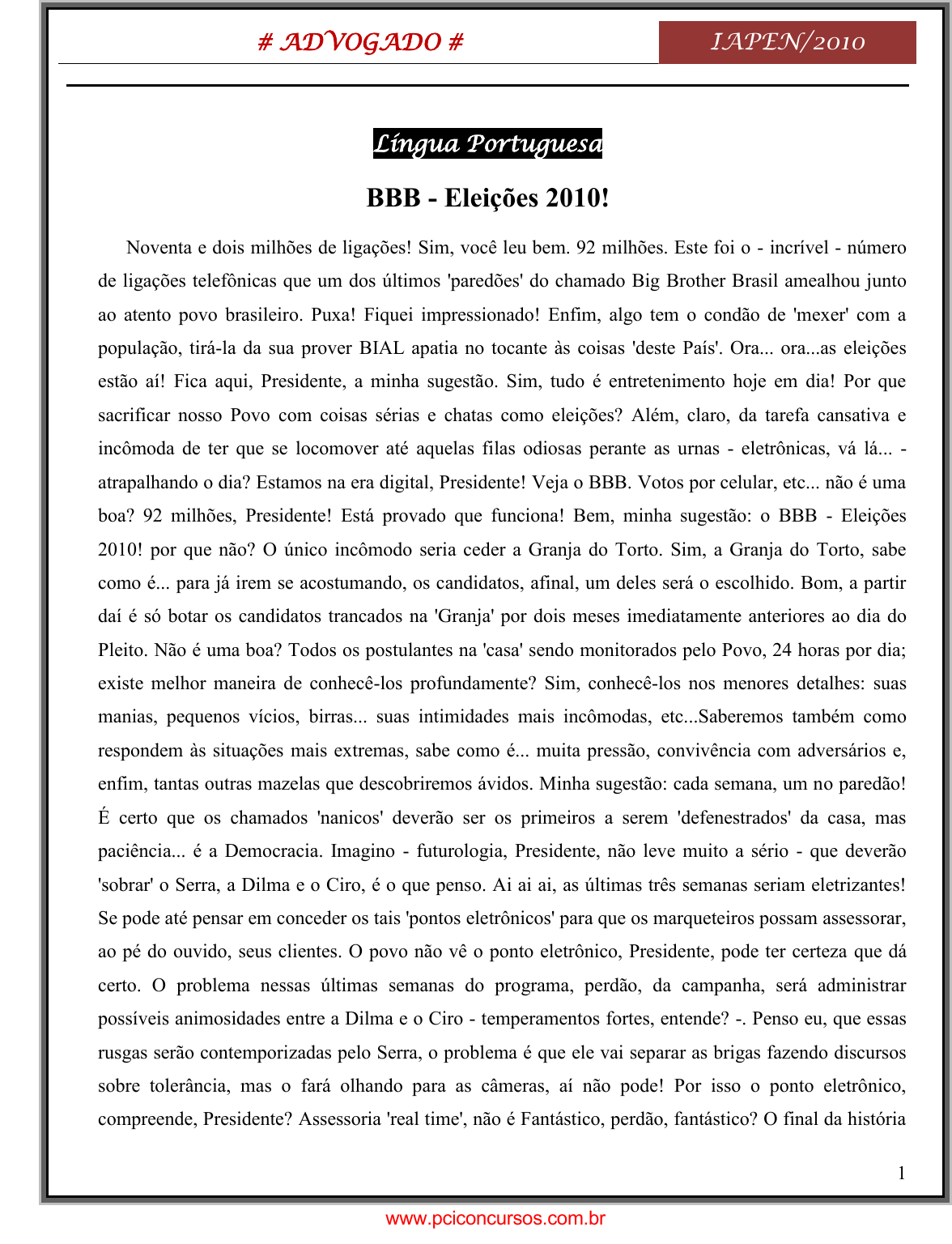 pcimarkpci MDAwMDowMDAwOjAwMDA6MDAwMDowMDAwOmZmZmY6MzZlOTpjMjU5:VGh1LCAxNiBTZXAgMjAyMSAyMTo0Njo1MyAtMDMwMA== # ADVOGADO # IAPEN/2010 1 Língua Portuguesa BBB - Eleições 2010! Noventa e dois milhões de ligações! Sim, você leu bem. 92 milhões. Este foi o - incrível - número de ligações telefônicas que um dos últimos 'paredões' do chamado Big Brother Brasil amealhou junto ao atento povo brasileiro. Puxa! Fiquei impressionado! Enfim, algo tem o condão de 'mexer' com a população, tirá-la da sua prover BIAL apatia no tocante às coisas 'deste País'. Ora... ora...as eleições estão aí! Fica aqui, Presidente, a minha sugestão. Sim, tudo é entretenimento hoje em dia! Por que sacrificar nosso Povo com coisas sérias e chatas como eleições? Além, claro, da tarefa cansativa e incômoda de ter que se locomover até aquelas filas odiosas perante as urnas - eletrônicas, vá lá... - atrapalhando o dia? Estamos na era digital, Presidente! Veja o BBB. Votos por celular, etc... não é uma boa? 92 milhões, Presidente! Está provado que funciona! Bem, minha sugestão: o BBB - Eleições 2010! por que não? O único incômodo seria ceder a Granja do Torto. Sim, a Granja do Torto, sabe como é... para já irem se acostumando, os candidatos, afinal, um deles será o escolhido. Bom, a partir daí é só botar os candidatos trancados na 'Granja' por dois meses imediatamente anteriores ao dia do Pleito. Não é uma boa? Todos os postulantes na 'casa' sendo monitorados pelo Povo, 24 horas por dia; existe melhor maneira de conhecê-los profundamente? Sim, conhecê-los nos menores detalhes: suas manias, pequenos vícios, birras... suas intimidades mais incômodas, etc...Saberemos também como respondem às situações mais extremas, sabe como é... muita pressão, convivência com adversários e, enfim, tantas outras mazelas que descobriremos ávidos. Minha sugestão: cada semana, um no paredão! É certo que os chamados 'nanicos' deverão ser os primeiros a serem 'defenestrados' da casa, mas paciência... é a Democracia. Imagino - futurologia, Presidente, não leve muito a sério - que deverão 'sobrar' o Serra, a Dilma e o Ciro, é o que penso. Ai ai ai, as últimas três semanas seriam eletrizantes! Se pode até pensar em conceder os tais 'pontos eletrônicos' para que os marqueteiros possam assessorar, ao pé do ouvido, seus clientes. O povo não vê o ponto eletrônico, Presidente, pode ter certeza que dá certo. O problema nessas últimas semanas do programa, perdão, da campanha, será administrar possíveis animosidades entre a Dilma e o Ciro - temperamentos fortes, entende? -. Penso eu, que essas rusgas serão contemporizadas pelo Serra, o problema é que ele vai separar as brigas fazendo discursos sobre tolerância, mas o fará olhando para as câmeras, aí não pode! Por isso o ponto eletrônico, compreende, Presidente? Assessoria 'real time', não é Fantástico, perdão, fantástico? O final da história www.pciconcursos.com.br pcimarkpci MDAwMDowMDAwOjAwMDA6MDAwMDowMDAwOmZmZmY6MzZlOTpjMjU5:VGh1LCAxNiBTZXAgMjAyMSAyMTo0Njo1MyAtMDMwMA== # ADVOGADO # IAPEN/2010 2 é aquele: quem sobrar leva! Não deixo por menos: 200 milhões de ligações - no último Paredão - ah, ia me esquecendo, e isto é importante: a emissora até pode ser a Globo, afinal... né? Mas o apresentador não pode ser o Bial. Não, não, tem que ser o presidente do TSE, fica uma coisa mais séria, o senhor não acha? Bem, está aí a minha sugestão. Eleições com entretenimento. Sem falar na economia que poderá ser feita, pois todos sabem o quanto é dispendiosa uma eleição 'normal'. Dá tempo, Presidente; aí, quem sabe, finalmente, possamos inverter a lógica e tirar o 'controle' das mãos dos políticos, bem como, nossas cabeças do 'paredão'. Pra frente Brasil! (não do Paredão!). Roberto Axé - 24/03/2010 http://www.republicadosautores.com.br/node/187. TOME POR BASE O TEXTO ANTERIOR PARA RESPONDER AS QUESTÕES QUE SEGUEM. QUESTÃO 1 – Na construção do texto, as escolhas dos itens linguísticos foram feitas em função de provocar um tom (A) humorístico e crítico. (B) sarcástico. (C) introspectivo. (D) emotivo. (E) objetivo. QUESTÃO 2 - O registro do discurso utilizado no texto é (A) formal tenso. (B) formal distenso. (C) informal. (D) técnico. (E) literário. QUESTÃO 3 - Quando o autor traz para o texto termos como os em destaque nos trechos “(...) no tocante às coisas 'deste País'”; “Todos os postulantes na 'casa', os chamados 'nanicos',” pra frente Brasil (não do paredão) é em função de provocar o leitor a utilizar-se de uma estratégia de leitura e interpretação que permite (A) exclusivamente tecer reflexões críticas. (B) ironizar a política nacional. (C) provocar o leitor. (D) recuperar conhecimentos previamente construídos pelo leitor a partir da realidade. (E) comparar ficção com realidade. QUESTÃO 4 – A forma com que o autor organiza as ideias do texto, permite compreender que seus locutores privilegiados são www.pciconcursos.com.br pcimarkpci MDAwMDowMDAwOjAwMDA6MDAwMDowMDAwOmZmZmY6MzZlOTpjMjU5:VGh1LCAxNiBTZXAgMjAyMSAyMTo0Njo1MyAtMDMwMA== # ADVOGADO # IAPEN/2010 3 (A) os eleitores e os presidenciáveis Serra e Dilma (B) os políticos do Brasil e os eleitores. (C) os leitores do texto e eleitores brasileiros. (D) o presidente Lula e o leitor do texto. (E) o presidente do TSE. QUESTÃO 5 - O autor utiliza-se tanto da 1ª pessoa do singular (“Fiquei impressionado”; “minha sugestão”, “Penso eu”), quanto da 1ª pessoa do plural (“Saberemos também”; “Estamos na era digital”). Ao analisar estes usos contextualmente, pode-se dizer que tal seleção linguística é feita com duas intenções (A) deixar claro que seu discurso é assumidamente de crítica aos políticos brasileiros. (B) separar seu ponto de vista do de 190 milhões de brasileiros e envolver o presidente Lula. (C) somar suas ideias às dos presidenciáveis, mas separá-las 