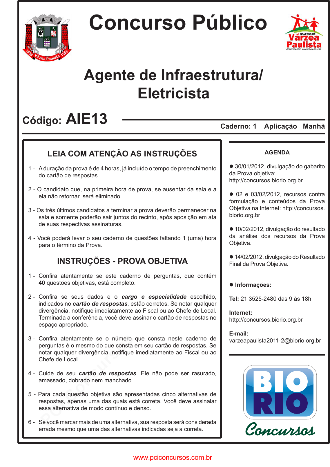 pcimarkpci MDAwMDowMDAwOjAwMDA6MDAwMDowMDAwOmZmZmY6MzZlOTpjMjU5:RnJpLCAxNyBTZXAgMjAyMSAwMzozNzozNCAtMDMwMA== Concurso Público LEIA COM ATENÇÃO AS INSTRUÇÕES 1 - A duração da prova é de 4 horas, já incluído o tempo de preenchimento do cartão de respostas. 2 - O candidato que, na primeira hora de prova, se ausentar da sala e a ela não retornar, será eliminado. 3 - Os três últimos candidatos a terminar a prova deverão permanecer na sala e somente poderão sair juntos do recinto, após aposição em ata de suas respectivas assinaturas. 4 - Você poderá levar o seu caderno de questões faltando 1 (uma) hora para o término da Prova. INSTRUÇÕES - PROVA OBJETIVA 1 - Confira atentamente se este caderno de perguntas, que contém 40 questões objetivas, está completo. 2 - Confira se seus dados e o cargo e especialidade escolhido, indicados no cartão de respostas, estão corretos. Se notar qualquer divergência, notifique imediatamente ao Fiscal ou ao Chefe de Local. Terminada a conferência, você deve assinar o cartão de respostas no espaço apropriado. 3 - Confira atentamente se o número que consta neste caderno de perguntas é o mesmo do que consta em seu cartão de respostas. Se notar qualquer divergência, notifique imediatamente ao Fiscal ou ao Chefe de Local. 4 - Cuide de seu cartão de respostas. Ele não pode ser rasurado, amassado, dobrado nem manchado. 5 - Para cada questão objetiva são apresentadas cinco alternativas de respostas, apenas uma das quais está correta. Você deve assinalar essa alternativa de modo contínuo e denso. 6 - Se você marcar mais de uma alternativa, sua resposta será considerada errada mesmo que uma das alternativas indicadas seja a correta. Agente de Infraestrutura/ Eletricista AGENDA l 30/01/2012, divulgação do gabarito da Prova objetiva: http://concursos.biorio.org.br l 02 e 03/02/2012, recursos contra formulação e conteúdos da Prova Objetiva na Internet: http://concursos. biorio.org.br l 10/02/2012, divulgação do resultado da análise dos recursos da Prova Objetiva. l 14/02/2012, divulgação do Resultado Final da Prova Objetiva. l Informações: Tel: 21 3525-2480 das 9 às 18h Internet: http://concursos.biorio.org.br E-mail: varzeapaulista2011-2@biorio.org.br Caderno: 1 Aplicação ManhãCódigo: AIE13 www.pciconcursos.com.br pcimarkpci MDAwMDowMDAwOjAwMDA6MDAwMDowMDAwOmZmZmY6MzZlOTpjMjU5:RnJpLCAxNyBTZXAgMjAyMSAwMzozNzozNCAtMDMwMA== www.pciconcursos.com.br pcimarkpci MDAwMDowMDAwOjAwMDA6MDAwMDowMDAwOmZmZmY6MzZlOTpjMjU5:RnJpLCAxNyBTZXAgMjAyMSAwMzozNzozNCAtMDMwMA== ELETRICISTA CADERNO 1 3 LÍNGUA PORTUGUESA Texto Por que não podemos ser mais inteligentes do que somos A inteligência sempre foi uma característica essencial para a sobrevivência e a evolução dos seres humanos. Nossa capacidade de resolver problemas complexos, trabalhar de forma cooperativa e entender a passagem do tempo estão por trás do nosso sucesso de nossa espécie. Mas se a inteligência é assim tão fundamental para a sobrevivência da espécie, por que não somos ainda mais inteligentes – ou seja, mais adaptados aos desafios representados pelo mundo – do que somos? Pesquisadores da Universidade de Warwick, na Inglaterra, descobriram que a equação não é assim tão simples. Eles concluíram que melhorias em funções cognitivas como a memória, a atenção e o raciocínio trariam uma piora do desempenho de outras. Para os cientistas, a ideia de um super-cérebro só seria possível na ficção científica. Para chegar a essa conclusão, o psicólogo Thomas Hills, de Warwick, e Ralph Hertwig, da Universidade de Basel, analisaram estudos de vários tipos, entre eles pesquisas sobre a mente dos autistas e sobre os efeitos de remédios como a Ritalina, que aumentam a atenção. Eles descobriram que, em geral, indivíduos com habilidades cognitivas muito elevadas – como pessoas que têm uma memória fotográfica, muito acima do normal – geralmente têm também algum tipo de transtorno, como autismo e problemas neurológicos associados ao crescimento cerebral. E mesmo os remédios que melhoram a atenção podem ter um efeito negativo: para quem não tem problema de foco e se medica na esperança de melhorar o desempenho nas tarefas cotidianas, o resultado pode ser exatamente o oposto. Segundo Hills, o estudo sugere que há um limite para melhorar as funções cognitivas. Um exemplo simples é o uso de cafeína para aumentar a atenção. A pessoa pode até ficar mais alerta, mas seu nível de ansiedade pode aumentar e sua coordenação motora fina pode piorar. A mensagem é que não dá para ter tudo ao mesmo tempo. Ir além em uma habilidade é, necessariamente, deixar outras para trás. (http://revistaepoca.globo.com/Ciencia-e-tecnologia/noticia/2011/12/por-que-nao podemos ser-mais-inteligentes-do-que-somos.html - 08/12/2011) 1 - Em “... indivíduos com habilidades cognitivas muito elevadas...”, a palavra assinalada pode ser substituída pela seguinte expressão sem qualquer prejuízo do sentido original da frase: (A) de afeto; (B) de reação; (C) de inclusão; (D) de conhecimento; (E) de exclusão. 2 - A frase que responde corretamente a indagação lançada no título do texto — Por que não podemos ser mais inteligentes do que somos — é a seguinte: (A) “Ir além em uma habilidade é, necessariamente, deixar outras para trás.” (B) “A inteligência sempre foi uma característica essencial para a sobrevivência e a evolução dos seres humanos.” (C) “... a ideia de um super-cérebro só seria possível na ficção científica.” (D) “...o uso de cafeína para aumentar a atenção.” (E) “Pesquisadores da Universidade de Warwick, na Inglaterra, descobriram que a equação não é assim tão simples.” www.pciconcursos.com.br pcimarkpci MDAwMDowMDAwOjAwMDA6MDAwMDowMDAwOmZmZmY6MzZlOTpjMjU5:RnJpLCAxNyBTZXAgMjAyMSAwMzozNzozNCAtMDMwMA== ELETRICISTA CADERNO 1 4 3 - Assinale a alternativa em que foram marcadas apenas palav