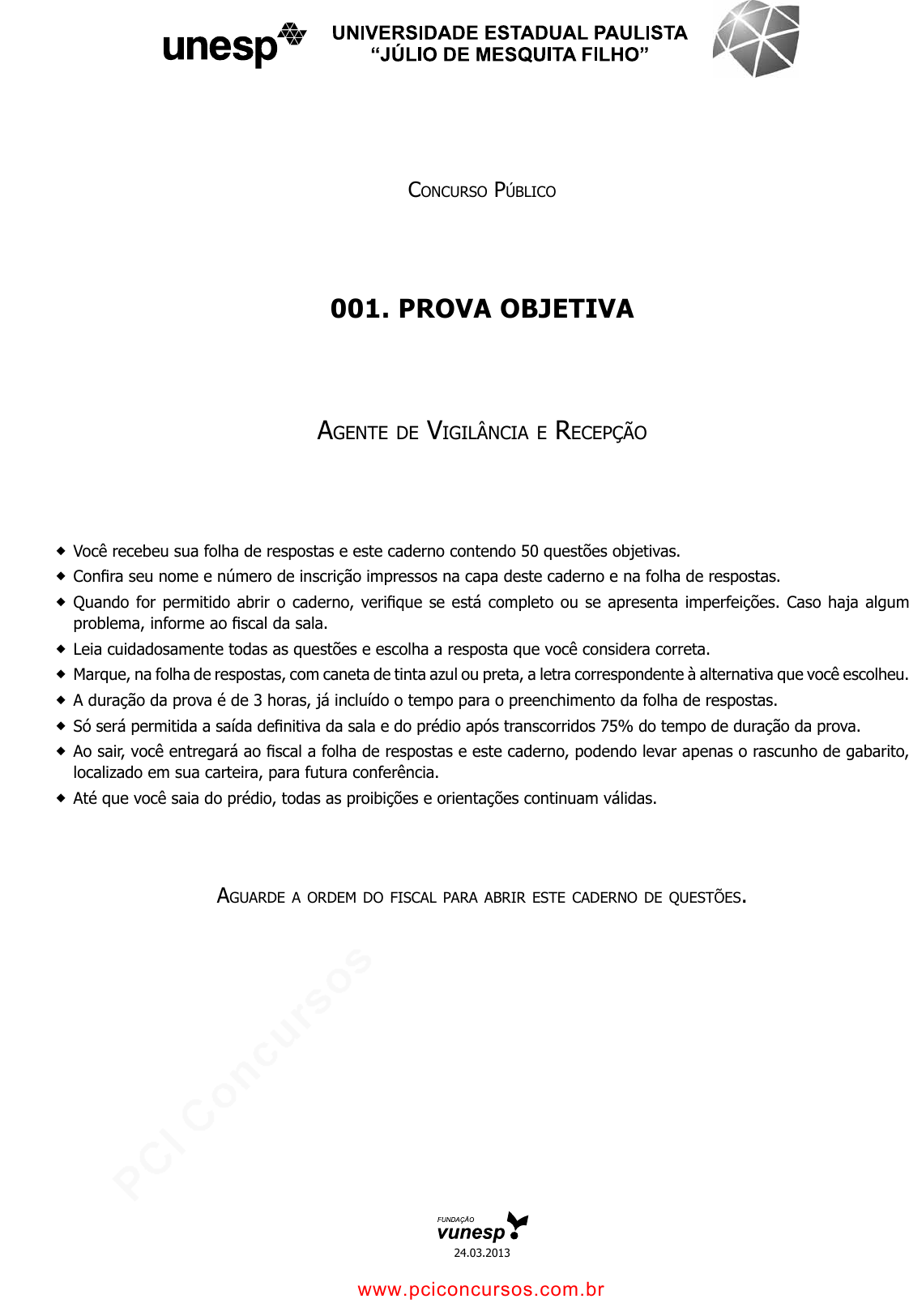 pcimarkpci MDAwMDowMDAwOjAwMDA6MDAwMDowMDAwOmZmZmY6MzZlOTpjMjU5:RnJpLCAxNyBTZXAgMjAyMSAwNToxOToyMCAtMDMwMA== ConCurso PúbliCo 001. Prova objetiva Agente de VigilânCiA e reCePção � Você recebeu sua folha de respostas e este caderno contendo 50 questões objetivas. � Confira seu nome e número de inscrição impressos na capa deste caderno e na folha de respostas. � Quando for permitido abrir o caderno, verifique se está completo ou se apresenta imperfeições. Caso haja algum problema, informe ao fiscal da sala. � Leia cuidadosamente todas as questões e escolha a resposta que você considera correta. � Marque, na folha de respostas, com caneta de tinta azul ou preta, a letra correspondente à alternativa que você escolheu. � A duração da prova é de 3 horas, já incluído o tempo para o preenchimento da folha de respostas. � Só será permitida a saída definitiva da sala e do prédio após transcorridos 75% do tempo de duração da prova. � Ao sair, você entregará ao fiscal a folha de respostas e este caderno, podendo levar apenas o rascunho de gabarito, localizado em sua carteira, para futura conferência. � Até que você saia do prédio, todas as proibições e orientações continuam válidas. AguArde A ordem do fisCAl PArA Abrir este CAderno de questões. 24.03.2013 www.pciconcursos.com.br pcimarkpci MDAwMDowMDAwOjAwMDA6MDAwMDowMDAwOmZmZmY6MzZlOTpjMjU5:RnJpLCAxNyBTZXAgMjAyMSAwNToxOToyMCAtMDMwMA== www.pciconcursos.com.br pcimarkpci MDAwMDowMDAwOjAwMDA6MDAwMDowMDAwOmZmZmY6MzZlOTpjMjU5:RnJpLCAxNyBTZXAgMjAyMSAwNToxOToyMCAtMDMwMA== 3 VNSP1301/001-AgVigRecepção Língua Portuguesa Considere o texto a seguir para responder às questões de núme- ros 01 a 04. A banda mais segura da cidade Hora do rush de terça-feira. Pessoas se aglomeram na plata- forma de embarque da estação Ana Rosa, linha1 – azul do metrô. Trens vão e vêm, mas elas continuam ali. Querem ver a Banda dos Seguranças do Metrô tocar. Em uma hora de show, o conjunto, formado há dez meses e vestindo o uniforme de trabalho, dedica-se à interpretação de Zeca Pagodinho a Queen*. “Variamos o repertório para agradar todo mundo”, diz Wagner Tadeu da Silva Júnior, 34, que toca ca- vaquinho e violão. Além dele, outros oito seguranças de diversas estações participam do grupo. O conjunto surgiu depois que alguns dos integrantes se apre- sentaram em um asilo como parte de uma ação voluntária. Per- ceberam a afinidade no palco e resolveram montar a banda, cujos shows ocorrem dentro das estações, fora do horário de trabalho. O Metrô garante o espaço para ensaios e os equipamentos. A primeira apresentação ocorreu em fevereiro, na Sé. A ideia foi bem recebida e o Metrô decidiu agendar shows mensais, ao final da tarde – horário estratégico para atrair público e desafo- gar os vagões. O próximo será na Palmeiras-Barra Funda. Uma semana antes, nove estações recebem o Sounderground, festival internacional com músicos habituados a tocar no metrô. Entretanto, apesar da receptividade do grupo paulistano, nenhum dos seguranças pensa em largar o serviço para buscar a fama. O vocalista Ivan chegou a ser chamado por um programa, mas preferiu a estabilidade do emprego. Na hora de subir no palco, eles deixam de lado algemas e co- letes à prova de balas. “Esse é um projeto que ajuda a aproximar o usuário do funcionário do metrô”, diz o chefe do departamento de segurança da empresa, Rubens Menezes. “É uma ideia que quebra o paradigma do uniforme preto.” (Renata Miranda, revista São Paulo, 21 a 27.10.2012. Adaptado) *Banda de rock britânica 01. Pela leitura do texto, é correto afirmar que (A) a Banda dos Seguranças do Metrô formou-se quando um dos integrantes foi convidado para participar de um programa de TV. (B) os shows ocorrem ao final da tarde, quando se reduz o fluxo de passageiros nas principais estações do metrô. (C) os músicos apresentam aos usuários, durante uma hora de espetáculo, predominantemente canções famosas do rock internacional. (D) os seguranças, ao assumirem o papel de artistas, esta- belecem uma relação de proximidade com o público, favorecendo a imagem do metrô paulistano. (E) a banda realiza, durante o expediente, shows mensais em diferentes estações do metrô, pois quer atender ao público de outras regiões da cidade. 02. Segundo o chefe do departamento de segurança, a banda É uma ideia que quebra o paradigma do uniforme preto. A expressão em destaque significa que a banda (A) atenua a imagem de autoridade e repressão associada ao uniforme preto dos seguranças. (B) faz propaganda da pontualidade e eficiência do sistema metropolitano. (C) organiza shows cujo objetivo é agradar especialmente a um público jovem. (D) foi criada com a intenção de motivar pessoas a substituí- rem outros meios de transporte pelo metrô. (E) apresenta-se sem o uniforme, pois os músicos não po- dem ser confundidos com os seguranças de plantão. 03. Analise os trechos do texto e assinale a alternativa em que ocorre a ideia de oposição. (A) “Variamos o repertório para agradar todo mundo”, diz Wagner Tadeu da Silva Júnior, 34, que toca cavaquinho e violão. (B) Além dele, outros oito seguranças de diversas estações participam do grupo. (C) O conjunto surgiu depois que alguns dos integrantes se apresentaram em um asilo como parte de uma ação vo- luntária. (D) A ideia foi bem recebida e o Metrô decidiu agendar shows mensais, ao final da tarde – horário estratégico para atrair público e desafogar os vagões. (E) Entretanto, apesar da receptividade do grupo paulista- no, nenhum dos seguranças pensa em largar o serviço para buscar a fama. 04. Considere o trecho a seguir. O metrô paulistano, quem a banda recebe apoio, garante o espaço para ensaios e os equipamentos; e a estabilidade no emprego, vantagem que muitos trabalhadores sonham, é o que leva os integrantes do grupo a permanecerem na instituição. As prep