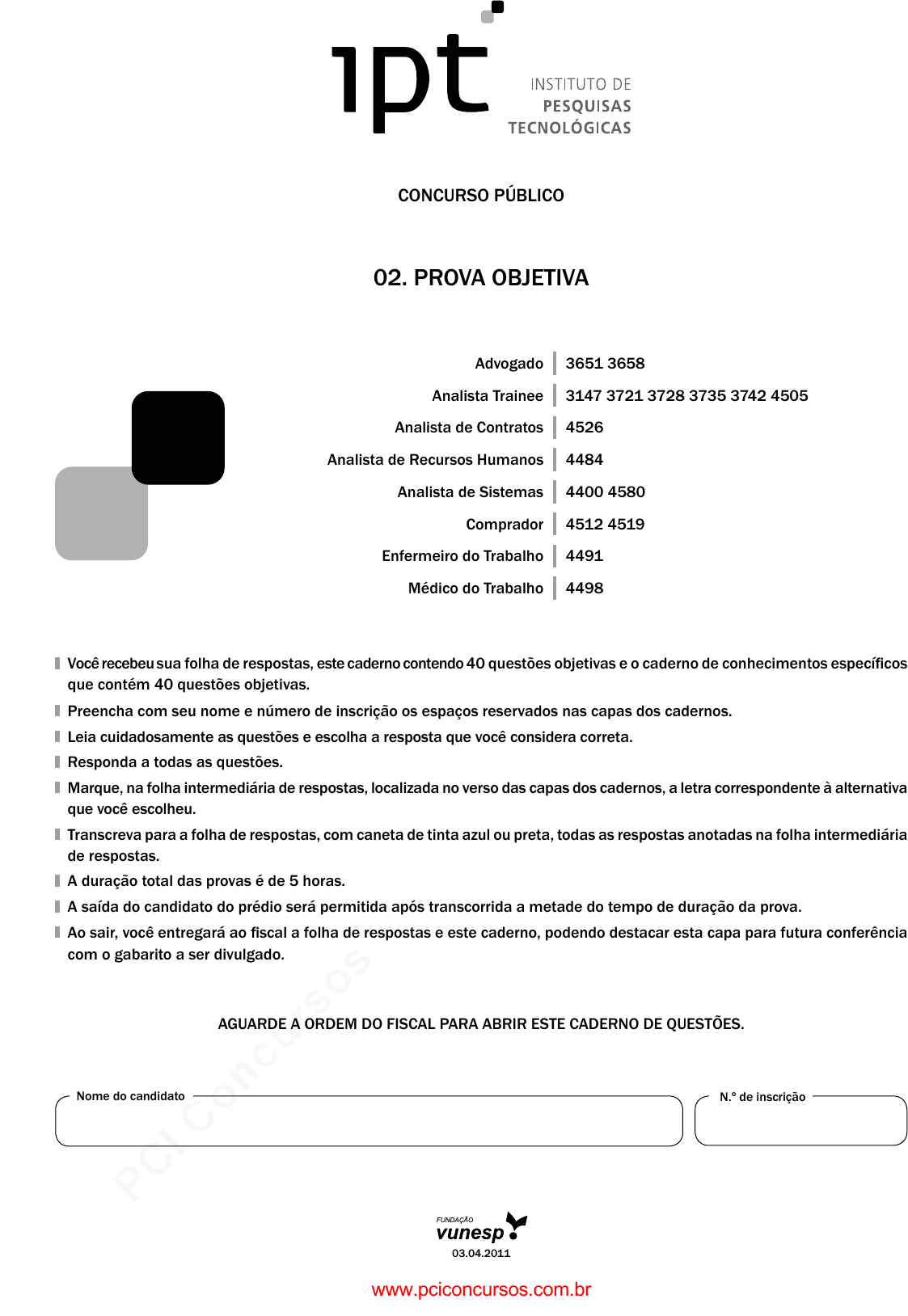 pcimarkpci MDAwMDowMDAwOjAwMDA6MDAwMDowMDAwOmZmZmY6MzZlOTpjMjU5:RnJpLCAxNyBTZXAgMjAyMSAxMTo1Nzo1OSAtMDMwMA== CONCURSO PÚBLICO 02. PROVA OBJETIVA Advogado 3651 3658 Analista Trainee 3147 3721 3728 3735 3742 4505 Analista de Contratos 4526 Analista de Recursos Humanos 4484 Analista de Sistemas 4400 4580 Comprador 4512 4519 Enfermeiro do Trabalho 4491 Médico do Trabalho 4498 Você recebeu sua folha de respostas, este caderno contendo 40 questões objetivas e o caderno de conhecimentos específicos que contém 40 questões objetivas. Preencha com seu nome e número de inscrição os espaços reservados nas capas dos cadernos. Leia cuidadosamente as questões e escolha a resposta que você considera correta. Responda a todas as questões. Marque, na folha intermediária de respostas, localizada no verso das capas dos cadernos, a letra correspondente à alternativa que você escolheu. Transcreva para a folha de respostas, com caneta de tinta azul ou preta, todas as respostas anotadas na folha intermediária de respostas. A duração total das provas é de 5 horas. A saída do candidato do prédio será permitida após transcorrida a metade do tempo de duração da prova. Ao sair, você entregará ao fiscal a folha de respostas e este caderno, podendo destacar esta capa para futura conferência com o gabarito a ser divulgado. AgUARdE A ORdEM dO fISCAL PARA ABRIR ESTE CAdERNO dE qUESTõES. Nome do candidato N.º de inscrição 03.04.2011 www.pciconcursos.com.br pcimarkpci MDAwMDowMDAwOjAwMDA6MDAwMDowMDAwOmZmZmY6MzZlOTpjMjU5:RnJpLCAxNyBTZXAgMjAyMSAxMTo1Nzo1OSAtMDMwMA== 2IPTC1001/02-CarrAdministrativa Fo lh a In te r m ed Iá r Ia d e r es po st as www.pciconcursos.com.br pcimarkpci MDAwMDowMDAwOjAwMDA6MDAwMDowMDAwOmZmZmY6MzZlOTpjMjU5:RnJpLCAxNyBTZXAgMjAyMSAxMTo1Nzo1OSAtMDMwMA== 3 IPTC1001/02-CarrAdministrativa LÍNGUA PORTUGUESA Leia a tira, para responder às questões de números 01 a 03. (http://www.revistaescola.abril.com.br) 01. É correto afirmar que, no contexto da tira, o objetivo das falas iniciais de Calvin (1.º e 2.º quadrinhos) é (A) esbravejar contra as imposições da escola, as quais ele considera praticáveis, mesmo que o aluno não exercite sua criatividade. (B) afirmar a importância dos deveres escolares, visto que estes são dirigidos à parcela dos estudantes que realmente estudam. (C) afrontar princípios defendidos pela instituição escolar, os quais ele acaba tachando de desinteressantes para alunos dedicados como ele. (D) escusar-se da obrigação que lhe é imposta, debitando a impossibilidade de cumpri-la a circunstâncias pelas quais ele não seria responsável. (E) confessar que dá prioridade às tarefas que a escola lhe impõe, deixando de ocupar-se de coisas mais prazerosas. 02. O comentário do tigre Haroldo, no último quadrinho, (A) explicita sua indiferença em relação ao assunto de que fala o garoto. (B) ironiza a falta de dedicação de Calvin aos estudos. (C) revela sua disposição para ajudar Calvin a fazer sua tarefa. (D) consiste num elogio ao garoto, para motivá-lo. (E) sintetiza sua cumplicidade com os argumentos de Calvin. 03. Considere as seguintes afirmações baseadas no texto do se- gundo quadrinho. I. No período – Se eles alguma vez tivessem me levado a um deserto, eu saberia como fazer isto! – a oração destacada expressa noção de condição. II. Na frase – Eu nunca fui a um deserto. – a expressão destacada expressa noção de lugar. III. A palavra nunca é empregada duas vezes nesse trecho, expressando a circunstância de modo. IV. No período – Se eles alguma vez tivessem me levado a um deserto, eu saberia como fazer isto! – a oração destacada exerce a função de objeto direto da oração precedente (eu saberia). Está correto o que se afirma apenas em (A) I e II. (B) I e III. (C) III e IV. (D) I, II e III. (E) I, II e IV. Leia o texto, para responder às questões de números 04 a 08. Para entender os princípios que regem a boa negociação, dois institutos britânicos fizeram, em conjunto, uma pesquisa sobre o tema. Segundo esses institutos, a negociação é uma disciplina, na qual pode haver capacitação e aprendizado. Eis alguns destaques da pesquisa sobre os atributos do bom negociador, que podem ser aprimorados pelo profissional: Empatia. Bater monotonamente na mesma tecla pode não levar a lugar algum na mesa de negociação. A arte de convencer o outro começa por aprender a entendê-lo. O segredo, ao nego- ciar, não é tentar impor o que nos convém, mas descobrir o que convém ao outro. Ser agradável. A negociação não é um concurso de simpatia. Mas a ideia ainda arraigada do negociador duro, de expressão de pedra, está com os dias contados. Ele traz danos ao acordo. Negociadores tarimbados são em geral abertos. Quebram o gelo. Se os dois lados não fazem a coisa andar, a conversa emperra. (Época Negócios, março 2010. Adaptado) 04. O antônimo de Empatia e o sinônimo de emperra adequados ao contexto são, correta e respectivamente, (A) Aversão e flui. (B) Repulsão e trava. (C) Consenso e entrava. (D) Insensibilidade e confunde-se. (E) Descaso e começa. 05. Observe as expressões destacadas: Para entender os princípios... ... uma pesquisa sobre o tema. Eis alguns destaques... É correto substituí-las, respectivamente, por (A) A fim de; acerca do; haja visto. (B) Afim de; há cerca do; haja vista. (C) A fim de; acerca do; haja vista. (D) Afim de; a cerca do; haja vista. (E) A fim de; há cerca do; haja visto. www.pciconcursos.com.br pcimarkpci MDAwMDowMDAwOjAwMDA6MDAwMDowMDAwOmZmZmY6MzZlOTpjMjU5:RnJpLCAxNyBTZXAgMjAyMSAxMTo1Nzo1OSAtMDMwMA== 4IPTC1001/02-CarrAdministrativa As questões de números 06 e 07 referem-se aos verbos destacados no trecho – O segredo, ao negociar, não é tentar impor o que nos convém, mas descobrir o que convém ao outro. 06. Os verbos das frases seguem o paradigma de impor. Assinale a alternativa em que o emprego do verbo está adequado a esse paradigma. (A) 