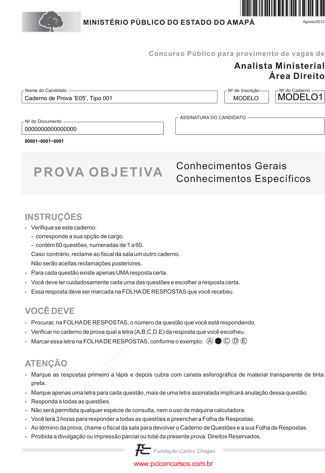 pcimarkpci MDAwMDowMDAwOjAwMDA6MDAwMDowMDAwOmZmZmY6MzZlOTpjMjU5:RnJpLCAxNyBTZXAgMjAyMSAxODozMDozNiAtMDMwMA== N do CadernooN de Inscriçãoo ASSINATURA DO CANDIDATO N do Documentoo Nome do Candidato INSTRUÇÕES VOCÊ DEVE ATENÇÃO - Verifique se este caderno: - corresponde a sua opção de cargo. - contém 60 questões, numeradas de 1 a 60. Caso contrário, reclame ao fiscal da sala um outro caderno. Não serão aceitas reclamações posteriores. - Para cada questão existe apenas UMAresposta certa. - Você deve ler cuidadosamente cada uma das questões e escolher a resposta certa. - Essa resposta deve ser marcada na FOLHADE RESPOSTAS que você recebeu. - Procurar, na FOLHADE RESPOSTAS, o número da questão que você está respondendo. - Verificar no caderno de prova qual a letra (A,B,C,D,E) da resposta que você escolheu. - Marcar essa letra na FOLHADE RESPOSTAS, conforme o exemplo: - Marque as respostas primeiro a lápis e depois cubra com caneta esferográfica de material transparente de tinta preta. - Marque apenas uma letra para cada questão, mais de uma letra assinalada implicará anulação dessa questão. - Responda a todas as questões. - Não será permitida qualquer espécie de consulta, nem o uso de máquina calculadora. - Você terá 3 horas para responder a todas as questões e preencher a Folha de Respostas. - Ao término da prova, chame o fiscal da sala para devolver o Caderno de Questões e a sua Folha de Respostas. - Proibida a divulgação ou impressão parcial ou total da presente prova. Direitos Reservados. A C D E Analista Ministerial Área Direito Conhecimentos Gerais Conhecimentos Específicos PROVA OBJETIVA Agosto/2012MINISTÉRIO PÚBLICO DO ESTADO DO AMAPÁ Concurso Público para provimento de vagas de Caderno de Prova ’E05’, Tipo 001 MODELO 0000000000000000 MODELO1 00001−0001−0001 www.pciconcursos.com.br pcimarkpci MDAwMDowMDAwOjAwMDA6MDAwMDowMDAwOmZmZmY6MzZlOTpjMjU5:RnJpLCAxNyBTZXAgMjAyMSAxODozMDozNiAtMDMwMA== 2 MPEAP-Conh.Gerais1 CONHECIMENTOS GERAIS Língua Portuguesa Atenção: As questões de números 1 a 7 referem-se ao texto abaixo. Quando, em 1890, Vincent van Gogh (1853-1890) se dispôs a pintar uma noite estrelada e se pôs diante da tela em branco, nada ali indicava por onde começar. Mas acordara, naquele dia, decidido a inventar uma noite delirantemente estrelada, como imaginava frequentemente e não se atrevia a fazê-lo não se sabe se por temer errar a mão e pôr a perder o sonho ou se porque preferia guardá-lo como uma possibilidade encantadora, uma esperança que o mantinha vivo. Aliás, já tentara antes expressar na tela seu fascínio pelo céu constelado. Um ano antes, pintara duas telas em que fixava a beleza do céu noturno − uma dessas telas mostra a entrada de um café com mesas na calçada e, ao fundo, no alto, o céu negro ponteado de estrelas; a outra tela é uma paisagem campestre sob as estrelas. Mas eram como ensaios, tentativas de aproximação do tema que continuava a exigir dele a expressão plena, ou melhor, extrema, como era próprio de sua personalidade passional. Vincent van Gogh era uma personalidade difícil de explicar, mas um pintor genial ele foi, sem dúvida. E uma de suas obras-primas é, certamente, aquela "Noite Estrelada" de 1889. Imagino o momento em que se dispôs a pintá-la: tem diante de si a tela em branco e pode ser que esteja ao ar livre em plena noite. Mas a noite real é pouca. A noite que deseja pintar é outra, mais bela e mais feérica que a real. Por isso, a tela em branco é um abismo. Um abismo de possibilidades infinitas, já que a noite que gostaria de pintar não existe, mas deveria existir, pois o seu sonho a deseja. Como começar a pintá-la, se ela não existe? Diante da tela em branco, tudo é possível e, por isso mesmo, nada é possível, a menos que se atreva a começá-la. E assim, num impulso, lança a primeira pincelada que, embora imprevista, reduz a probabilidade infinita do vazio e dá começo à obra. E assim foi que a sucessão de pinceladas, de linhas e cores, aos poucos definiu uma paisagem noturna que era mais céu que terra: um pinheiro que liga o chão ao céu e, lá adiante, a pequena vila sobre a qual uma avassaladora tormenta cósmica se estende, como se assistíssemos ao nascer do Universo. (Adaptado de Ferreira Gullar. Folha de S. Paulo, 17/06/12) 1. É INCORRETO afirmar que o autor (A) aborda o tema da dificuldade do artista em iniciar uma obra. (B) expõe a admiração que sente pela produção artística de van Gogh. (C) destaca a relevância da tela "Noite Estrelada" na trajetória artística de van Gogh. (D) assinala que o artista prescinde de técnica para dar vazão à criatividade. (E) narra, em certos momentos, o processo de criação do pintor como se o tivesse presenciado de fato. 2. ... mais bela e mais feérica que a real. (4o parágrafo) Mantendo-se a correção e a lógica, o termo grifado acima pode ser substituído por: (A) ofuscante. (B) manifesta. (C) humilde. (D) controversa. (E) transparente. _________________________________________________________ 3. Fazendo-se as alterações necessárias, o termo grifado foi corretamente substituído por um pronome em: (A) decidido a inventar uma noite = decidido a inventá-la (B) expressar [...] seu fascínio pelo céu constelado = expressar-lhe (C) tem diante de si a tela em branco = tem-a diante de si (D) Imagino o momento = Imagino-lhe (E) definiu uma paisagem noturna = definiu-na _________________________________________________________ 4. ... ou se porque preferia guardá-lo... O verbo flexionado nos mesmos tempo e modo que o grifado acima está também grifado em: (A) ... se dispôs a pintar uma noite estrelada... (B) ... em que fixava a beleza do céu noturno... (C) ...se assistíssemos ao nascer do Universo. (D) ... acordara, naquele dia... (E) ... mas deveria existir... _________________________________________________________ 5. E assim, num impulso, lança a primeira pincelada... Transp